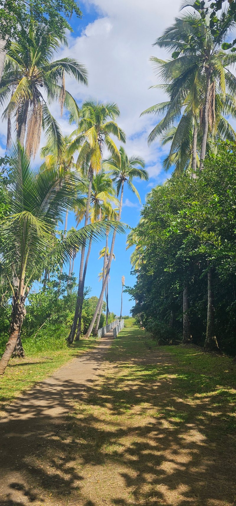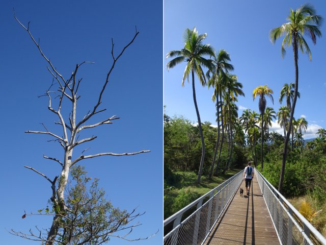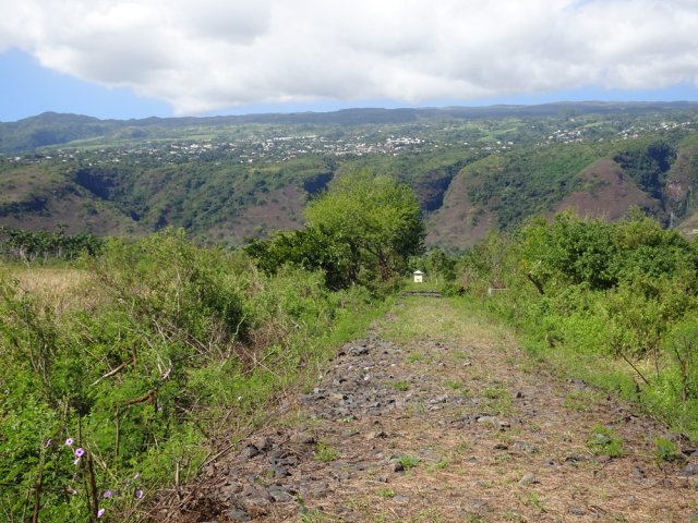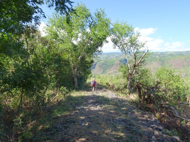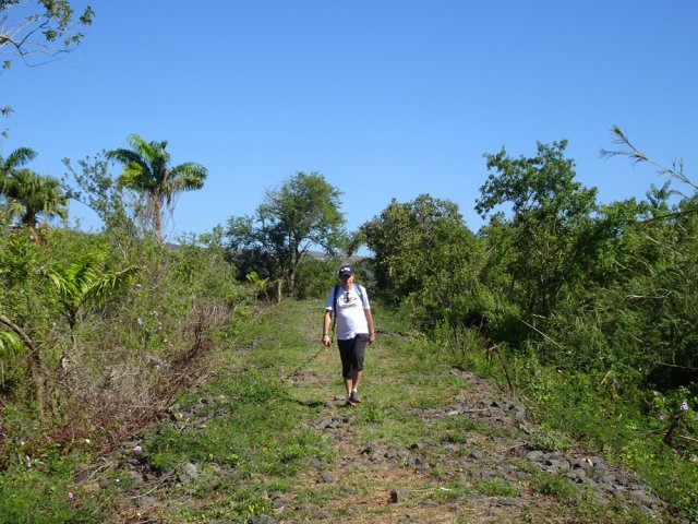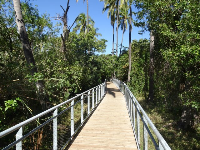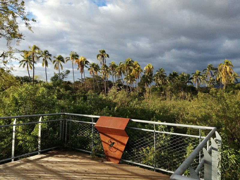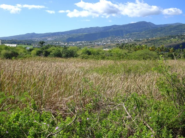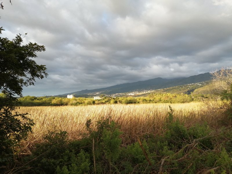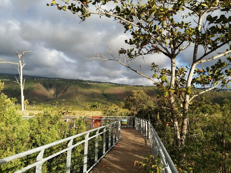La randonnée débute près d'une zone grillagée au coin du boulodrome. Le panneau de la réserve a presque disparu dans la végétation. Passer entre le grillage et le fossé encombré de détritus provenant sans doute des fêtes organisées lors des tournois de pétanque puis franchir par un gué très sommaire fait d'une demi-palette (Photo 1). S'il y a trop d'eau ou trop de détritus, préférer un départ du parking situé à la fin de la Rue Jules Thirel. Partir à droite sur le sentier qui longe au plus près ce fossé qui se transforme plus loin en ravine dans laquelle viennent boire les bovins (Photo 2). Si, de loin, l'aspect est agréable, il n'est pas très intéressant de s'en approcher de trop près (Photo 3). La prairie toute proche abrite souvent les troupeaux qu'on peut également côtoyer dans les zones marécageuses de l'étang (Photo 4). De l'autre côté, on a de belles vues sur les falaises proches de Macabit et du Ruisseau (Photo 5). Le sentier se termine sur la longue digue qui isole les installations des possibles inondations. La piste caillouteuse menant à l’Étang Saint-Paul peut encore se parcourir mais les plantes, souvent piquantes, ont envahi le passage. Partir donc à gauche et entamer une longue ligne droite sur des milliers de cailloux instables constituant la digue (Photo 6). On peut cette fois profiter des mêmes paysages sans aucune végétation pour masquer (Photo 7). Des zones marécageuses recouvertes de roseaux bordent la piste de chaque côté (Photo 8). Certains petits sentiers, souvent créés par les bovins qui viennent paître ici, traversent des friches en bordure d'étang. Plus loin, la digue oblique presque à angle droit en direction du Tour des Roches, toujours sur les cailloux où les invasives tentent leur chance entre deux défrichages (Photo 9). Plus on s'approche du stade, plus les pistes et sentiers sont fréquentés. On y repère donc plus de signalisations que le long du parcours déjà fait (Photo 10). Repérer sur la droite la belle allée fermée par une grille qui se dirige vers la zone d'aquaculture (Photo 11). Suivre les flèches situées près du portail et laisser quelques habitations sur la droite. Poursuivre sur la piste bordée de cocotiers en direction du stade qu'on aperçoit dans les trouées. On arrive rapidement au départ de la longue passerelle aménagée au-dessus des zones marécageuses. Elle recouvre le sentier longeant quelques canaux et arbres morts. Laisser la piste et entamer la boucle métallique sur plancher de bois (Photo 12). L'ouvrage, très récent, est de bonne facture et justifie à lui seul une balade avec enfants qui seront protégés de la chute par les grillages (Photo 13). Elle est parfois rectiligne ou sinueuse entre les futaies d'une végétation assez banale procurant un peu d'ombre (Photo 14). Des points d'observation ont été aménagés le long de la barrière ou dans des chicanes. Elles incitent par un symbole à s'intéresser aux oiseaux, plantes ou poissons (Photo 15). Plus loin, elle tourne à angle droit pour épouser la forme de l'ancien sentier qu'on devine encore (Photo 16). On retrouve aussi les arbres morts et hauts cocotiers qui bordaient le sentier (Photo 17). Le large passage s'effectue totalement à plat et convient très bien à un fauteuil roulant (Photo 18). L'arbre mort recouvert de cactées est toujours là même si l'on devine une fin imminente (Photo 19). Au dernier virage, la passerelle passe près de bassins envahis de tilapias peu farouches, heureux de savoir que la pêche est ici interdite (Photo 20). Suivre les derniers 50 mètres en pente douce vers la piste quittée 15 minutes avant (Photo 21). On retrouve la large piste bordée de cocotiers en direction de l'aire de pique-nique de la zone. Le canal est plus propre que le précédent ; il est bordé de taros et les tilapias, plus craintifs, s'enfuient à toute vitesse au passage des randonneurs. La piste finit à l'aire de repos et aux tables disséminées sous le couvert des arbres (Photo 22). Avant de poursuivre dans la réserve, traverser la route et repérer la Maison de la Réserve pour une visite durant les heures d'ouverture (Photo 23). En face, un bâtiment abandonné aux ouvertures obturées ne résistera guère à l'urbanisation s'il n'est pas classé aux Monuments Historiques (Photo 24). L'usine sucrière, construite par la famille Lemarchand a produit du sucre jusqu'en 1985 puis a fermé ses portes en 1992. Une grande partie a été transformée en bureaux que l'on peut voir tout près de ce bâtiment. Rejoindre le parking, le traverser puis l'aire de repos en frôlant un vestige de l'usine constitué de grandes roues dentées rouillées. Partir sur la droite, quitter la pelouse et entamer la fin de la boucle sur le sentier qui débute sous les arbres (Photo 25). La progression s'effectue tout d'abord sous quelques arbustes et épineux sur un large sentier très visible (Photo 26). Plus loin, il traverse la prairie humide. Il est moins évident à suivre s'il n'a pas été entretenu mais il ne faut pas craindre le hors sentier si l'on s'écarte des herbes tassées par les semelles (Photo 27). En arrivant à la piste, ne pas hésiter à partir sur la gauche pour une centaine de mètres et se diriger vers l'étang. Les multiples traces de sabots indiquent qu'on ne pourra pas s'embourber. On peut ainsi se rapprocher au plus près de l'eau et des hectares de roseaux (Photo 28). Faire demi-tour et poursuivre vers le gué, le grillage et le boulodrome sur un sentier de bonne qualité dans les épineux.
