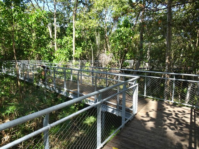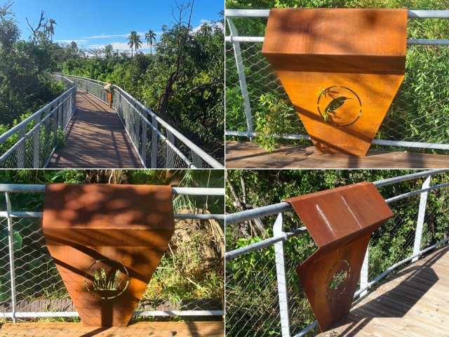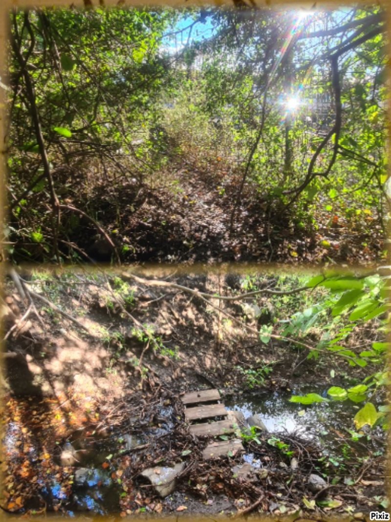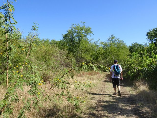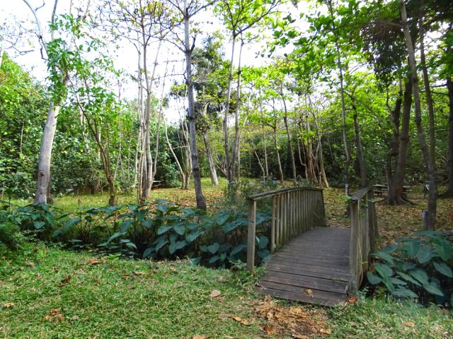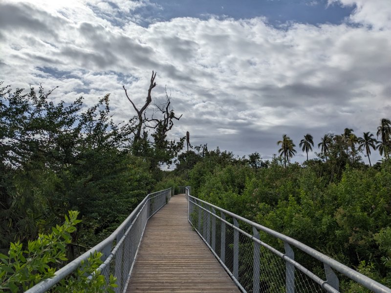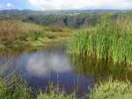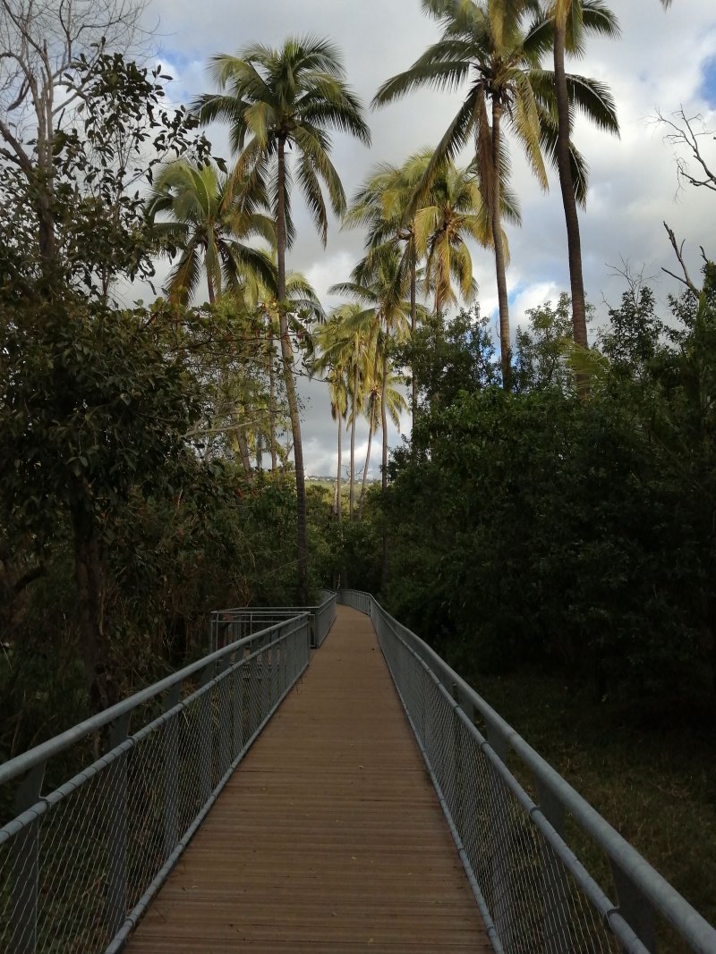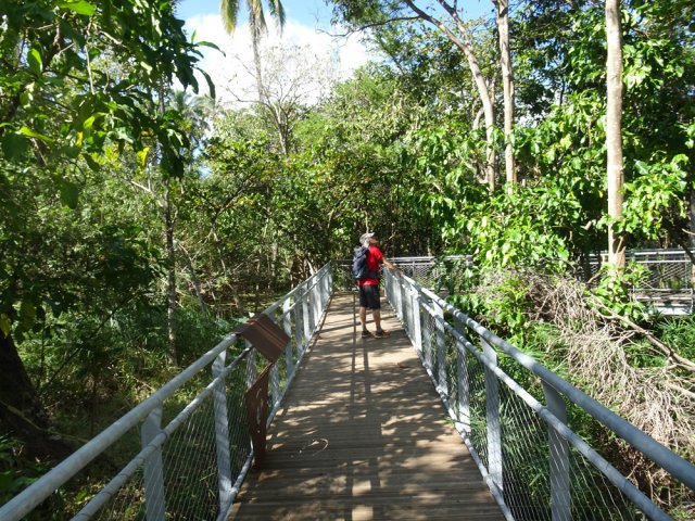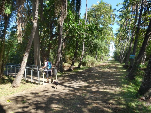 La randonnée débute près d'une zone grillagée au coin du boulodrome. Le panneau de la réserve a presque disparu dans la végétation. Passer entre le grillage et le fossé encombré de détritus provenant sans doute des fêtes organisées lors des tournois de pétanque puis franchir par un gué très sommaire fait d'une demi-palette (Photo 1). S'il y a trop d'eau ou trop de détritus, préférer un départ du parking situé à la fin de la Rue Jules Thirel. Partir à droite sur le sentier qui longe au plus près ce fossé qui se transforme plus loin en ravine dans laquelle viennent boire les bovins (Photo 2). Si, de loin, l'aspect est agréable, il n'est pas très intéressant de s'en approcher de trop près (Photo 3). La prairie toute proche abrite souvent les troupeaux qu'on peut également côtoyer dans les zones marécageuses de l'étang (Photo 4). De l'autre côté, on a de belles vues sur les falaises proches de Macabit et du Ruisseau (Photo 5). Le sentier se termine sur la longue digue qui isole les installations des possibles inondations. La piste caillouteuse menant à l’Étang Saint-Paul peut encore se parcourir mais les plantes, souvent piquantes, ont envahi le passage. Partir donc à gauche et entamer une longue ligne droite sur des milliers de cailloux instables constituant la digue (Photo 6). On peut cette fois profiter des mêmes paysages sans aucune végétation pour masquer (Photo 7). Des zones marécageuses recouvertes de roseaux bordent la piste de chaque côté (Photo 8). Certains petits sentiers, souvent créés par les bovins qui viennent paître ici, traversent des friches en bordure d'étang. Plus loin, la digue oblique presque à angle droit en direction du Tour des Roches, toujours sur les cailloux où les invasives tentent leur chance entre deux défrichages (Photo 9). Plus on s'approche du stade, plus les pistes et sentiers sont fréquentés. On y repère donc plus de signalisations que le long du parcours déjà fait (Photo 10). Repérer sur la droite la belle allée fermée par une grille qui se dirige vers la zone d'aquaculture (Photo 11). Suivre les flèches situées près du portail et laisser quelques habitations sur la droite. Poursuivre sur la piste bordée de cocotiers en direction du stade qu'on aperçoit dans les trouées. On arrive rapidement au départ de la longue passerelle aménagée au-dessus des zones marécageuses. Elle recouvre le sentier longeant quelques canaux et arbres morts. Laisser la piste et entamer la boucle métallique sur plancher de bois (Photo 12). L'ouvrage, très récent, est de bonne facture et justifie à lui seul une balade avec enfants qui seront protégés de la chute par les grillages (Photo 13). Elle est parfois rectiligne ou sinueuse entre les futaies d'une végétation assez banale procurant un peu d'ombre (Photo 14). Des points d'observation ont été aménagés le long de la barrière ou dans des chicanes. Elles incitent par un symbole à s'intéresser aux oiseaux, plantes ou poissons (Photo 15). Plus loin, elle tourne à angle droit pour épouser la forme de l'ancien sentier qu'on devine encore (Photo 16). On retrouve aussi les arbres morts et hauts cocotiers qui bordaient le sentier (Photo 17). Le large passage s'effectue totalement à plat et convient très bien à un fauteuil roulant (Photo 18). L'arbre mort recouvert de cactées est toujours là même si l'on devine une fin imminente (Photo 19). Au dernier virage, la passerelle passe près de bassins envahis de tilapias peu farouches, heureux de savoir que la pêche est ici interdite (Photo 20). Suivre les derniers 50 mètres en pente douce vers la piste quittée 15 minutes avant (Photo 21). On retrouve la large piste bordée de cocotiers en direction de l'aire de pique-nique de la zone. Le canal est plus propre que le précédent ; il est bordé de taros et les tilapias, plus craintifs, s'enfuient à toute vitesse au passage des randonneurs. La piste finit à l'aire de repos et aux tables disséminées sous le couvert des arbres (Photo 22). Avant de poursuivre dans la réserve, traverser la route et repérer la Maison de la Réserve pour une visite durant les heures d'ouverture (Photo 23). En face, un bâtiment abandonné aux ouvertures obturées ne résistera guère à l'urbanisation s'il n'est pas classé aux Monuments Historiques (Photo 24). L'usine sucrière, construite par la famille Lemarchand a produit du sucre jusqu'en 1985 puis a fermé ses portes en 1992. Une grande partie a été transformée en bureaux que l'on peut voir tout près de ce bâtiment. Rejoindre le parking, le traverser puis l'aire de repos en frôlant un vestige de l'usine constitué de grandes roues dentées rouillées. Partir sur la droite, quitter la pelouse et entamer la fin de la boucle sur le sentier qui débute sous les arbres (Photo 25). La progression s'effectue tout d'abord sous quelques arbustes et épineux sur un large sentier très visible (Photo 26). Plus loin, il traverse la prairie humide. Il est moins évident à suivre s'il n'a pas été entretenu mais il ne faut pas craindre le hors sentier si l'on s'écarte des herbes tassées par les semelles (Photo 27). En arrivant à la piste, ne pas hésiter à partir sur la gauche pour une centaine de mètres et se diriger vers l'étang. Les multiples traces de sabots indiquent qu'on ne pourra pas s'embourber. On peut ainsi se rapprocher au plus près de l'eau et des hectares de roseaux (Photo 28). Faire demi-tour et poursuivre vers le gué, le grillage et le boulodrome sur un sentier de bonne qualité dans les épineux.