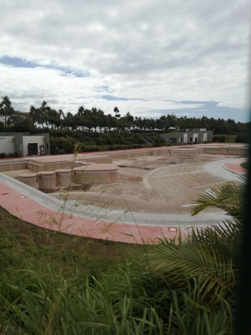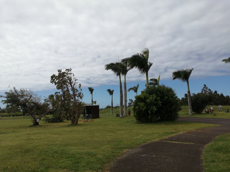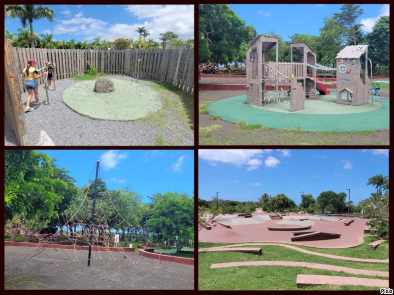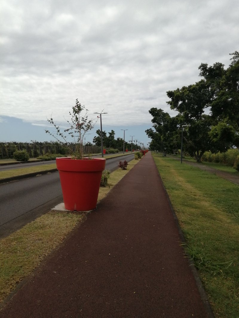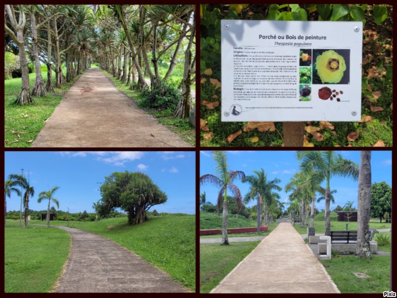 La boucle débute aux emplacements de parking, très nombreux près de l'entrée du complexe (Photo 1). Si tout un chacun peut prendre les escaliers entre les bâtiments, les fauteuils se devront de partir vers la gauche pour emprunter les rampes et la piste. Suivre la piste la plus à l'ouest, assez large, pour se lancer dans cette boucle. Elle frôle tout d'abord le skate park où s'élancent les jeunes avec leur planche (Photo 3). Les plantations en bordure de piste sont encore récentes (Photo 4). Plus loin, on rencontre plusieurs croisements pour raccourcir le circuit (Photo 5). Après une boucle vers la gauche, la piste bétonnée oblique le long des marécages et étangs situés entre le parc et la mer. Une petite halte au panneau permet de lire des indications sur la faune et la flore du lieu (Photo 7). Les pontons qui dominent ces petites étendues d'eau ont été refaits ainsi que les rambardes et la visite s'effectue sans danger tout en profitant de beaux panoramas sur les sommets (Photo 8). S'il est difficile d'apercevoir les chevrettes ou les cabots, il est en revanche fréquent de voir les oiseaux à l'affût (Photo 9). On entend très bien les vagues de l'océan tout proche. Sortir par l'autre ponton et se diriger vers un pont enjambant une minuscule ravine à sec (Photo 10). Si l'on se dirige vers la piste de gauche on aura la possibilité d'effectuer un beau parcours à l'ombre des vacoas (Photo 11). Cette piste rejoint plus loin celle qu'on aperçoit sur la droite près de l'étang mais attention, la jonction de 50 mètres doit s'effectuer sur un gazon court peu pratique en fauteuil mais très agréable à pied. Il est donc préférable de rebrousser chemin pour emprunter la piste au plus près de l'eau (Photo 12). On peut stationner sous un badamier pour profiter des vues sur l'étang (Photo 13). Là également, faire demi-tour puis rejoindre une nouvelle piste ombragée en bordure du parc (Photo 14). La pente est très faible. On passe au plus près d'une première aire de jeux pour enfants (Photo 15) avant d'arriver à l'attraction la plus colorée du site. De hautes et larges fleurs aux allures d'hibiscus représentent une des réalisations la plus spectaculaire du parc (Photo 16). Poursuivre et tourner à droite en passant devant l'endroit prévu pour des spectacles (Photo 17). Au lieu de poursuivre tout droit, obliquer à la première piste et revenir vers les fleurs. On se retrouve au plus près d'un local toilettes à l'allure de chaussure de sport, sans doute oubliée par le Colosse (Photo 18). On retrouve les hibiscus que l'on a contournés (Photo 19). Après la lecture du panneau et un peu d'imagination on découvre plus loin les cinq doigts du Colosse qui dépassent du sable, permettant aux enfants de s'initier à la grimpe (Photo 20). Poursuivre sur la piste centrale, la plus agréable entre ses jeunes palmiers royaux (Photo 21). Sur la gauche, un labyrinthe de la forme d'un grand pied de colosse amusera assurément les enfants mais les fauteuils ont du mal à y pénétrer sur le gravier instable (Photo 22). Avant de rentrer, profiter une dernière fois de quelques arbres remarquables même si le parc est loin d'être considéré comme botanique (Photo 23). Repérer, pour une période où ce sera un plaisir de manger en famille, les nombreux kiosques métalliques abritant tables et bancs (Photo 24). Faire demi-tour puis poursuivre en direction des bâtiments de l'entrée en longeant la piste (Photo 25). Plus haut, on retrouve l'autre côté du skate park et ses deux grands livres en béton (Photo 26) ainsi qu'un petit terrain de handball (Photo 27). Avant de terminer la boucle, ne pas hésiter à pénétrer dans la cour de l'entrée où des jets d'eau changeants éclaboussent deux bassins d'eau claire (Photo 28).