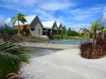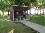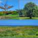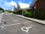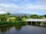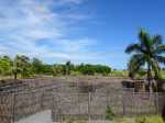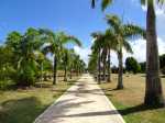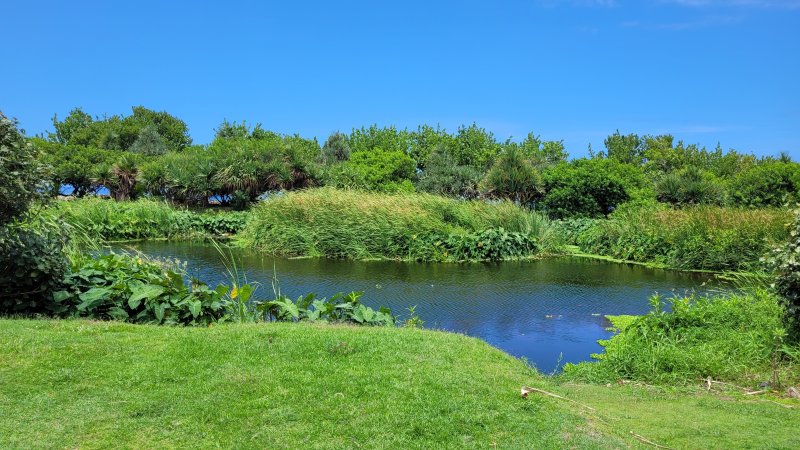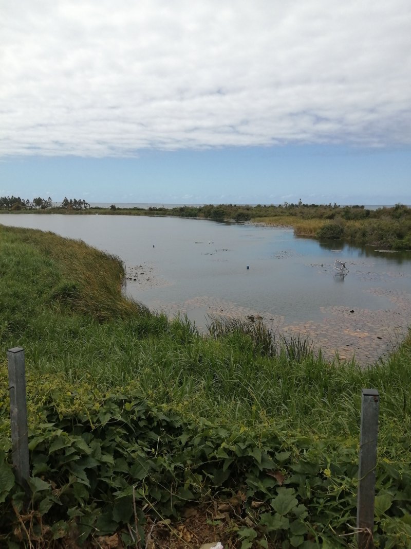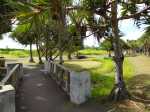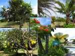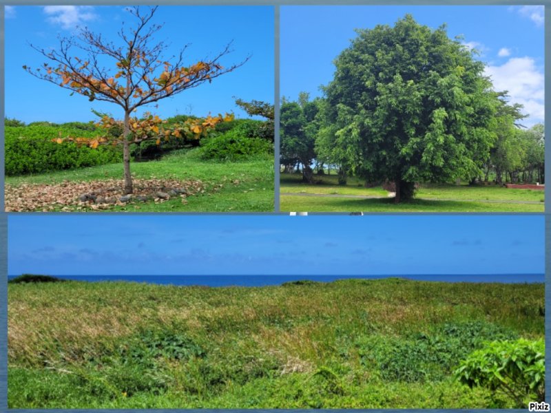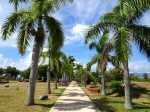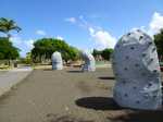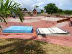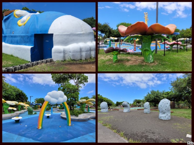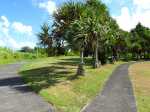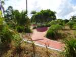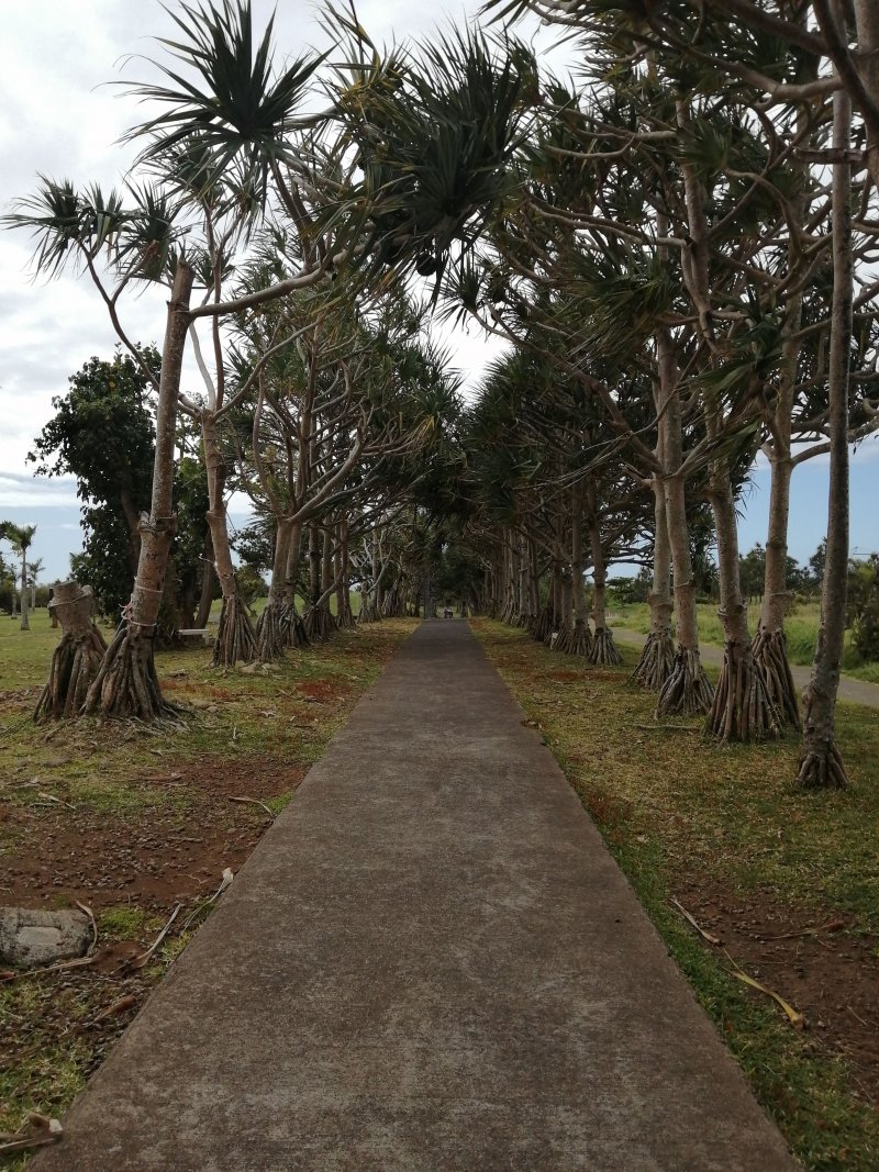 La boucle débute aux emplacements de parking, très nombreux près de l'entrée du complexe (Photo 1). Si tout un chacun peut prendre les escaliers entre les bâtiments, les fauteuils se devront de partir vers la gauche pour emprunter les rampes et la piste. Suivre la piste la plus à l'ouest, assez large, pour se lancer dans cette boucle. Elle frôle tout d'abord le skate park où s'élancent les jeunes avec leur planche (Photo 3). Les plantations en bordure de piste sont encore récentes (Photo 4). Plus loin, on rencontre plusieurs croisements pour raccourcir le circuit (Photo 5). Après une boucle vers la gauche, la piste bétonnée oblique le long des marécages et étangs situés entre le parc et la mer. Une petite halte au panneau permet de lire des indications sur la faune et la flore du lieu (Photo 7). Les pontons qui dominent ces petites étendues d'eau ont été refaits ainsi que les rambardes et la visite s'effectue sans danger tout en profitant de beaux panoramas sur les sommets (Photo 8). S'il est difficile d'apercevoir les chevrettes ou les cabots, il est en revanche fréquent de voir les oiseaux à l'affût (Photo 9). On entend très bien les vagues de l'océan tout proche. Sortir par l'autre ponton et se diriger vers un pont enjambant une minuscule ravine à sec (Photo 10). Si l'on se dirige vers la piste de gauche on aura la possibilité d'effectuer un beau parcours à l'ombre des vacoas (Photo 11). Cette piste rejoint plus loin celle qu'on aperçoit sur la droite près de l'étang mais attention, la jonction de 50 mètres doit s'effectuer sur un gazon court peu pratique en fauteuil mais très agréable à pied. Il est donc préférable de rebrousser chemin pour emprunter la piste au plus près de l'eau (Photo 12). On peut stationner sous un badamier pour profiter des vues sur l'étang (Photo 13). Là également, faire demi-tour puis rejoindre une nouvelle piste ombragée en bordure du parc (Photo 14). La pente est très faible. On passe au plus près d'une première aire de jeux pour enfants (Photo 15) avant d'arriver à l'attraction la plus colorée du site. De hautes et larges fleurs aux allures d'hibiscus représentent une des réalisations la plus spectaculaire du parc (Photo 16). Poursuivre et tourner à droite en passant devant l'endroit prévu pour des spectacles (Photo 17). Au lieu de poursuivre tout droit, obliquer à la première piste et revenir vers les fleurs. On se retrouve au plus près d'un local toilettes à l'allure de chaussure de sport, sans doute oubliée par le Colosse (Photo 18). On retrouve les hibiscus que l'on a contournés (Photo 19). Après la lecture du panneau et un peu d'imagination on découvre plus loin les cinq doigts du Colosse qui dépassent du sable, permettant aux enfants de s'initier à la grimpe (Photo 20). Poursuivre sur la piste centrale, la plus agréable entre ses jeunes palmiers royaux (Photo 21). Sur la gauche, un labyrinthe de la forme d'un grand pied de colosse amusera assurément les enfants mais les fauteuils ont du mal à y pénétrer sur le gravier instable (Photo 22). Avant de rentrer, profiter une dernière fois de quelques arbres remarquables même si le parc est loin d'être considéré comme botanique (Photo 23). Repérer, pour une période où ce sera un plaisir de manger en famille, les nombreux kiosques métalliques abritant tables et bancs (Photo 24). Faire demi-tour puis poursuivre en direction des bâtiments de l'entrée en longeant la piste (Photo 25). Plus haut, on retrouve l'autre côté du skate park et ses deux grands livres en béton (Photo 26) ainsi qu'un petit terrain de handball (Photo 27). Avant de terminer la boucle, ne pas hésiter à pénétrer dans la cour de l'entrée où des jets d'eau changeants éclaboussent deux bassins d'eau claire (Photo 28).