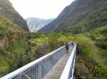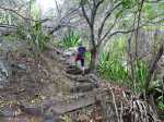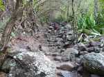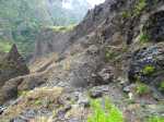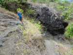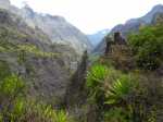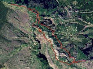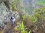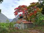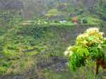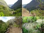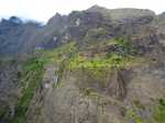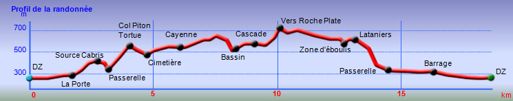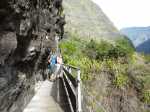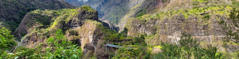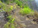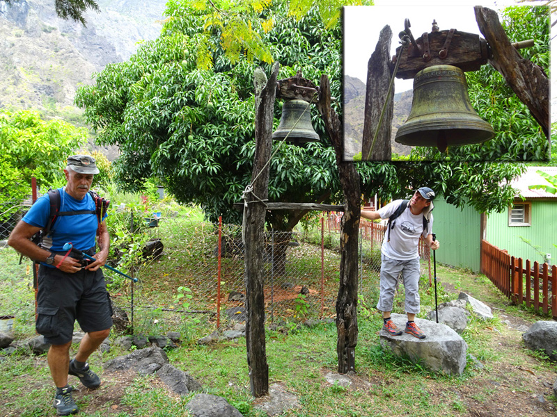La randonnée débute au point d'arrêt des taxis un peu après Deux Bras. Le début de la remontée vers Mafate est un grand classique maintes fois décrit. Le sentier ou des tronçons de piste longent la Rivière des Galets, imposant de nombreuses traversées sur des gués bien aménagés mais non pérennes en raison des crues périodiques. Une fois à la Porte, plusieurs itinéraires permettent de rejoindre Cayenne. Cette fiche propose une montée vers Aurère pour bifurquer plus loin par la passerelle du Bras d'Oussy. A partir de la Porte, le sentier remonte parfois assez fortement sur des plaques basaltiques ou sur de hautes marches en pierre (Photo 1). Cette montée cesse 200 m plus haut après la source Cabris, le plus souvent à sec. Le parcours descend ensuite vers le Bras d'Oussy en proposant souvent de beaux points de vue sur les vallées encaissées de la Rivière des Galets et du Bras d'Oussy (Photo 2). Le franchissement de la passerelle ne pose aucun problème, même aux personnes souffrant de vertige (Photo 3). Profiter de la vue sur les bassins 50 mètres plus bas avant de poursuivre par l'ascension du flanc ouest du Piton Tortue en direction du col. Un passage est plus vertigineux mais très bien sécurisé (Photo 4). La montée est un peu longue mais comporte peu de difficultés (Photo 5). Le large sentier, bordé d'une végétation pauvre et rase, permet d'avoir de superbes panoramas dans toutes les directions (Photo 6). La descente débute au col et parvient au croisement vers le cimetière. Sa visite en aller-retour prend moins de 5 minutes. La jonction avec les différents sentiers partant vers les Lataniers ou Grand Place s'effectue sur un sol presque plat. L'îlet de Cayenne se remarque de loin à la même altitude, facile à repérer en fin d'année en raison du grand flamboyant fleuri. L'arrivée à l'escalier en pierres puis à la petite case bariolée annonce l'arrivée proche à Cayenne qu'on rejoint en quelques minutes après avoir franchi la Ravine Fontaine. On arrive tout d'abord au dispensaire puis à la chapelle avec sa cloche située à l'extérieur (voir § ci-dessous). Ralentir le pas pour traverser ce hameau très fleuri où le rouge domine une bonne partie de l'année (Photo 7). Laisser le sentier remontant à gauche vers Grand Place et traverser l'îlet en passant devant le grand flamboyant (Photo 8). Le sentier débute à plat et entame une descente dans un verger de manguiers. Repérer, pour le retour, le sentier courant à flanc de falaise en rive gauche de la Rivière des Galets. On devine très bien le sentier vertigineux au milieu de l'éboulis avant d'arriver aux Lataniers (Photo 9). La marche est rapide sur un sol le plus souvent plat dans des savanes incultes ou des parties plus humides (Photo 10). Le parcours comporte de multiples changements de direction dues au relief et à quelques dents de scie pour passer de petites ravines. Certains endroits sont sauvages au milieu des aiguilles rocheuses très friables (Photo 11). Après une dernière petite ravine et l'arrivée à une haute barre rocheuse verticale, le sentier se met à descendre assez violemment vers la Rivière des Galets. Les lacets y sont courts, les marches parfois hautes et le sol très terreux devient de plus en plus glissant (Photo 12). La vertigineuse descente prend fin à la rivière qui se traverse très facilement à gué (Photo 13). Délaisser rapidement le balisage blanc pour se rapprocher de la rivière et ainsi apprécier un magnifique bassin d'eau transparente alimenté par une petite cascade (Photo 14). Une trace de l'ancien sentier subsiste pour contourner un rocher et ainsi dominer du regard le magnifique endroit. Le bassin, très profond, est idéal pour une première baignade. Retrouver facilement le sentier puis poursuivre vers la Roche Ancrée en repérant de nouvelles petites chutes. Des traces de peinture blanche sur chaque roche indiquent le meilleur passage pour franchir la rivière en direction de Grand Place. Entamer la montée vers l'Îlet à Cordes et repérer, sur la gauche, un minuscule sentier juste avant de parvenir aux premières marches en béton du sentier principal. Ce sentier permet de remonter la Rivière des Galets en passant tout d'abord dans de très hautes herbes (fatak) ou entre des roches. En quittant le sentier on peut approcher de nouveaux bassins (Photo 15). Il mène facilement à un camp exceptionnellement bien situé pour un éventuel bivouac à deux pas de l'eau. La suite de la montée est un classique du genre entre roches, chutes, falaises plus ou moins faciles à franchir (Photo 16). Une zone de roche rouge marque la fin de la montée si le sol est mouillé. S'il est sec, les aventuriers grimperont la pente pour rejoindre le dernier bassin de la journée. Alimenté par une cascade tombant des rochers, l'endroit est très agréable (Photo 17). Attention à la descente pour retrouver le lit de la rivière. La meilleure façon de descendre consiste à s'asseoir et à se laisser glisser (Photo 18). Reprendre la sente en rive gauche et récupérer le sentier Dacerle. Débute alors une rude montée tout en lacets et hautes marches au milieu des grands chocas et acacias (Photo 19). Des passages en bordure de rempart sont heureusement sécurisés de rambardes protégeant du vide. Les hautes marches et les racines se multiplient et la montée n'en finit plus (Photo 20). D'autres passages sont moins protégés mais la végétation assure en partie la sécurité (Photo 21). On parvient essoufflé au croisement du sentier vers les Lataniers. Les cases du siècle dernier de l'Îlet à Cordes sont remplacées par d'énormes chocas pour empêcher l'exploration qui, de toute façon, prendrait du temps et retarderait sur ce parcours dépassant les 8 heures. La jonction avec les Lataniers reprend avec de nouvelles séries de marches mais sur de plus courtes distances (Photo 22). Le sentier s'assagit puis longe le rempart en rive gauche de la 