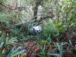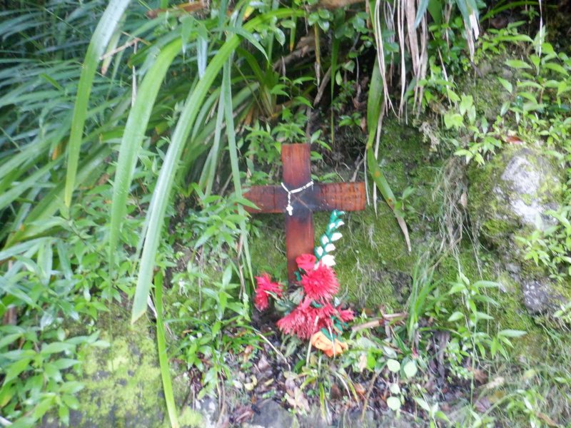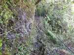 Nous trouverons facilement le départ du sentier comme indiqué par la croix, nous avons suivi, à l’instinct un semblant de trace et décidé de faire demi-tour un peu plus haut ; en pensant, que plus nous montons, plus dur sera la redescente en cas de demi-tour, car il faudra alors trouver le même passage qu’a la montée, sous peine d’aller se bloquer au-dessus des barres rocheuses et de ne plus trouver le passage.