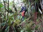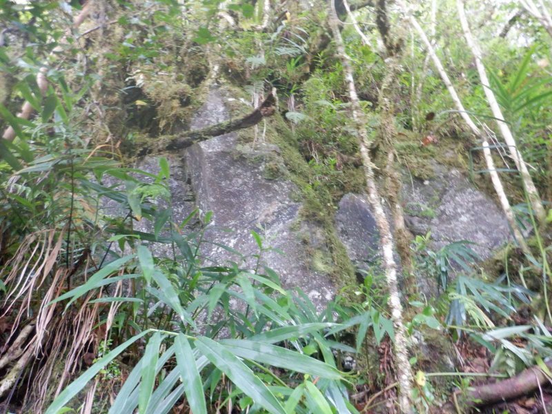 Nous bifurquons trop vite à droite, en escaladant une véritable muraille de pierres, de longoses, de sabres et de jouvences pour nous heurter, une fois encore à une falaise apparemment bien difficile à négocier. Peut-être serions nous passés ...et pour aller où ? Mais Bilimbi, admirable comme toujours, aurait sûrement reculé devant ces obstacles impressionnants. Ne serait-ce pas là où nous nous étions trompés la première fois puisque nous suivons un semblant de trace où la végétation dense est bien couchée. Ca y ressemble. Nous sommes un peu découragés et, c'est un comble, nous doutons fort pour la suite. Nous redescendons donc presque au départ du sentier "marron" pour finalement retrouver une assez bonne trace...que nous ne quitterons plus jusqu'à la Fenêtre. Est-ce à dire que nos différents passages ont permis d'assez bien retracer le chemin qu'empruntaient jadis les bûcherons ? Les nombreuses fois où JPG et randopitons indiquent que la trace se perd, ne semblent plus qu'un souvenir, ce qui est évidemment une bonne chose pour ceux qui tenteront cette excitante aventure !