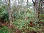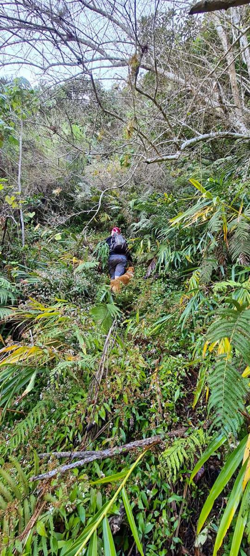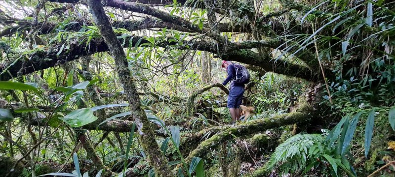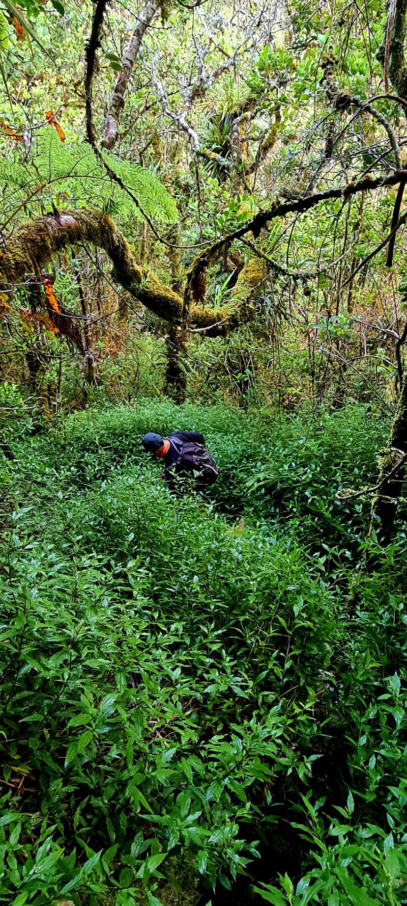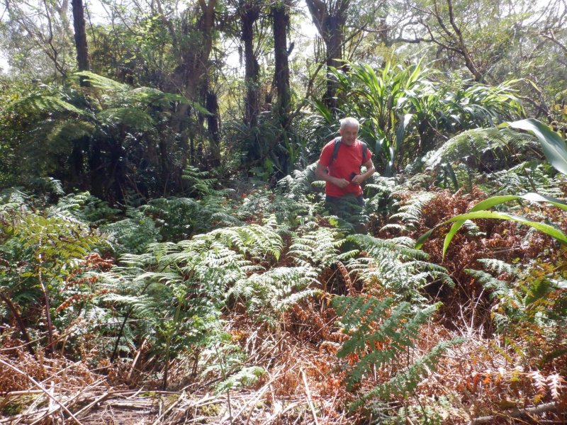 Alors, si nous allions voir de l'autre côté, c'est à dire vers l'autre bout du sentier (c'est, vous l'avez compris, un grand mot puisque les traces sont bien rares). Remontée au gîte de Bélouve, direction la ravine de la Vierge à travers une forêt exceptionnellement belle de tamarins et de fanjans. Mais voilà toujours pas, ou très peu de traces, et un océan de fougères-aigles hautes d'environ deux mètres. Il faut se frayer un passage, éviter les vignes marronnes qui commencent à pointer leur nez, ramper ou sauter pour éviter les gros troncs des tamarins au sol. Et toujours nos applications qui perdent la tête. Nous longeons le rempart abrupt de la ravine de la Vierge en essayant de trouver un point de faiblesse dans ce rempart où nous pourrions nous glisser. Sans une longue corde qui nous serait nécessaire pour remonter au cas où..., nous décidons de reculer. De nouveau un semi-succès ou un semi-échec, c'est selon.