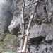 Un autre indice va beaucoup nous intriguer en redescendant le rempart . Cet indice, pas vu en montant, est une extraordinaire échelle en bois, vieille comme Mathusalem, qui escalade la falaise jusqu'à son milieu où une excavation semblerait le but de ceux qui l'ont gravie ? Re-point d'interrogation. Mais alors pourquoi JPG n'en parle t-il pas ? Est ce un indice qui montre qu'il n'est pas passé par là ? Car pour nous, la photo est plus qu'évidente! Super, pour ma collection d'échelles car celle ci est hors normes, fabuleuse, fantastique, époustouflante...