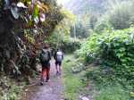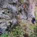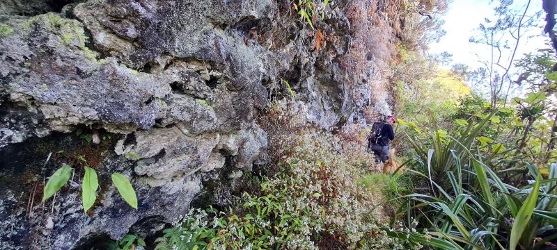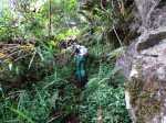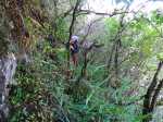 Une fois passée la fenêtre, nous longeons la barre rocheuse et trouvons facilement la faiblesse nous permettant de la franchir ; le sentier se suit facilement, la trace est visible, les jouvences nous ralentissent car il faut impérativement savoir ou on pose les pieds ; en effet, la progression s’effectuant sur un passage plus qu’étroit en bord de rempart. Les barres rocheuses s’enchaînent et nous les franchissons sans soucis particuliers ; seuls 2 endroits très végétalisés nous poserons question, vite résolu en observant le terrain.