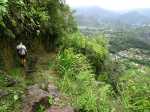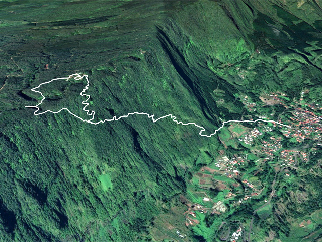 La randonnée débute à la mairie annexe de Hell Bourg. Remonter la rue puis poursuivre tout droit sur le Chemin de Bélouve. On se retrouve très vite sur le sentier, bétonné au départ, qui descend légèrement pour aller franchir la Ravine Chouchous entourée de hauts bambous (Photo 1). Comme partout dans le cirque de Salazie, ces chouchous recouvrent des pans entiers de rempart, grimpant très haut dans les filaos ou bouchant simplement le sentier. Les portions bétonnées sont assez nombreuses au départ, facilitant la marche (Photo 2). Sur la gauche, quand le bambou balai ne bouche pas la vue, on assiste à l'arrivée du soleil sur le cirque (Photo 3). Lorsque le béton cesse, la pierre prend le relais et les marches sont parfois assez hautes (Photo 4). Des parties ont souffert de l'érosion due aux pluies et la marche s'effectue sur le muret cimenté qui retenait les portions ouvragées. Des passages étroits sont correctement sécurisés par des mains courantes ou câbles (Photo 5). Il faut franchir quelques lacets un peu raides parfois, des rigoles ou sources plus ou moins fournies, des oratoires originaux dont un dans sa boîte aux lettres, avant de parvenir à une croix en bois située dans un lacet serré qui débute la dernière ascension vers le gîte. La croix a été installée en hommage au gramoune Manoro, mort ici à 85 ans lors d'une chasse au tangue en solitaire. Le sentier historique se poursuivait à l'époque en direction de la Fenêtre. Le départ est donc facile à repérer entre les goyaviers (Photo 6). Après une très courte descente, il remonte le rempart dans une végétation très dense (Photo 7). Il faut beaucoup d'entraînement pour savoir que le sentier passe entre ces racines, bois de couleur et hélas, entre goyaviers et longoses (Photo 8). D'anciens éboulis et arbres abattus imposent de quitter la trace qu'on perd très facilement. La remontée devient alors une marche à l'azimut en cherchant toujours le meilleur passage, surtout lorsqu'on se retrouve face à une falaise lisse et humide impossible à escalader sans matériel (Photo 9). La meilleure solution consiste alors à longer ces barres rocheuses sur un sol en général assez variable passant des racines mal fixées à des bandes de terre de moins de 20 cm recouvertes de jouvences, paille sabre ou longoses (Photo 10). On croit parfois retrouver le sentier mais on déchante très vite en arrivant à une nouvelle falaise verticale (Photo 12). Plus on monte et plus le ciel bleu se dessine entre les branches, signe que la Fenêtre approche. On se retrouve enfin sur quelques vestiges de plastique laissés là par des braconniers, signe d'une pratique plus régulière. Une dernière forte montée rapproche de la fenêtre creusée entre deux falaises rocheuses (Photo 13). Cela fait plaisir de retrouver une véritable trace même si elle a mal vieilli depuis 7 décennies (Photo 14). Partir alors à droite en direction du gîte. On longe à nouveau des barres rocheuses mais l'on sait qu'il n'y aura plus d'obstacle. Le sol est généreusement recouvert d'une superbe végétation variée et verdoyante (Photo 15). Il plonge ensuite à gauche par des portions bien marquées au milieu de magnifiques orchidées poussant au pied des bois de couleurs moussus (Photo 16). Avant de bifurquer à nouveau vers le gîte ne pas hésiter à poursuivre vers le Bras de Caverne même s'il faut enjamber quelques racines (Photo 17). On rejoint en quelques minutes la ravine près d'un bassin d'eau claire qui incite peu à la baignade en raison du fond assez ferrugineux (Photo 18). Par temps sec, il est agréable de suivre un peu ce petit cours d'eau qui se précipite quelques centaines de mètres plus loin au fond du Trou de Fer. Après cette visite facultative, remonter au croisement puis rester sur le sentier de plus en plus difficile à suivre. Repérer les quelques coups de machette sur l'écorce de certains arbres pour se rassurer. On arrive très vite à une ixième barre basaltique verticale entourée d'une très belle végétation (Photo 19). Il faut alors longer la barre et escalader quelques blocs rocheux sans grande difficulté (Photo 20). La végétation change totalement en quelques dizaines de mètres. On passe de la forêt de bois de couleurs moussus à celle de tamarins où les longoses sont remplacés par les fougères. Tenter de suivre la trace au sol en visant entre les fougères et en effectuant quelques détours dus à des contournements d'arbres (Photo 22). C'est là qu'il faut un bon sens de l'orientation pour ne pas revenir au rempart ou descendre vers le Bras de Caverne. On traverse là un classique de la forêt de Bélouve entre tamarins et fanjans recouverts de fougères (Blechnum - Photo 23). Poursuivre au milieu des fougères en suivant au mieux la trace (Photo 24). On parvient sans avertissement sur le caillebotis du sentier du Trou de Fer. Prendre à droite puis rejoindre très vite le gîte sur un très large sentier qui s'envahit doucement de vigne marronne (Photo 25). Profiter du point de vue depuis le belvédère ou effectuer une halte sur une table de pique nique avant d'entreprendre la descente en direction de la mairie. La descente a le même pourcentage que la montée sur le sentier oublié (et pas toujours retrouvé) mais l'espace pour poser les pieds est sans commune mesure (Photo 26). La progression est très rapide en raison de cette forte pente qui comporte plus bas de nouvelles séries de lacets serrés (Photo 27). Après les records de lenteur de la montée, la descente ressemble à une course tant on se rapproche vite de Hell Bourg que l'on aperçoit devant soi (Photo 28).