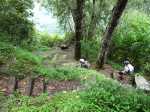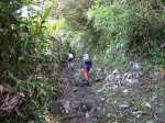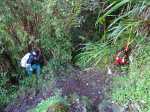 Nous partons dans le sens inverse de la première fois et par conséquent de la fiche. La large allée de la piste des Fleurs Jaunes nous accueille avec de bonnes herbes pleines de la rosée du petit matin. Il a beaucoup plu cette nuit. Très vite on bifurque à gauche dans la majestueuse forêt, toujours dominée par les tamarins et les fanjans mais bien envahie par les vignes marronnes. Beaucoup d'égratignures pour rejoindre le haut du rempart qu'il nous faudra nécessairement descendre pour rejoindre la ravine de la Vierge. On cherche un peu mais on trouve relativement bien et quelques marques de braconniers sur les arbres nous permettent d'être optimiste.