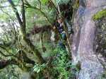 On part donc bien à gauche et nous grimpons allègrement au milieu de mousses du plus bel effet qui me font penser aux photos 15 et 16 ? Point d'interrogation. Nous longeons de hautes falaises avec le vide sur notre gauche à quelques centimètres de nos pas. Est-ce utile de dire que la moindre glissade serait fatale ? Une belle échancrure sur notre droite, pas très loin à vol d'oiseau, nous ferait penser à la Fenêtre mais les traces de nos deux gps s'éloignent inexorablement de celles de randopitons. Y aurait il deux Fenêtres? Ne vaudrait-il pas mieux aller à la Fenêtre de droite?