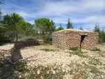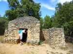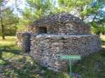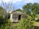Au milieu du 19ème siècle, les plus pauvres de la région de Conques sur Orbiel se mirent à défricher la garrigue appartenant à la commune pour y planter de la vigne et ainsi améliorer leurs maigres revenus. Le sol était principalement constitué de pierres qu'il fallait extraire pour les mettre en bordure de parcelle. Ces pierres plates furent très vite utilisées pour la construction d'abris pérennes appelés dans la région des capitelles. La guerre de 1914 et le phylloxéra mirent fin à la culture et à l'exploitation du lieu très vite repris par la garrigue. Les capitelles, en ruine pour la plupart, n'étaient même plus visibles à certains endroits. Le Foyer Laïque de Conques a lancé dès 1995 de vastes travaux de défrichage et de remise en état, voire de reconstructions. 45 de ces capitelles se visitent par quatre circuits qui peuvent très facilement se combiner comme sur cette fiche qui propose de les découvrir toutes en moins de 10 km. Très fréquenté, le site est un vrai havre de paix au milieu des chênes verts, cyprès, pins et cèdres du Liban poussant ici par milliers. A l'automne, on est frappé par la très forte odeur de miel dégagée par les salsepareilles poussant ici en buissons épais. C'est donc avec émotion que l'on pénètre dans ces maisonnettes sans fenêtres destinées à abriter les vignerons lors des intempéries.