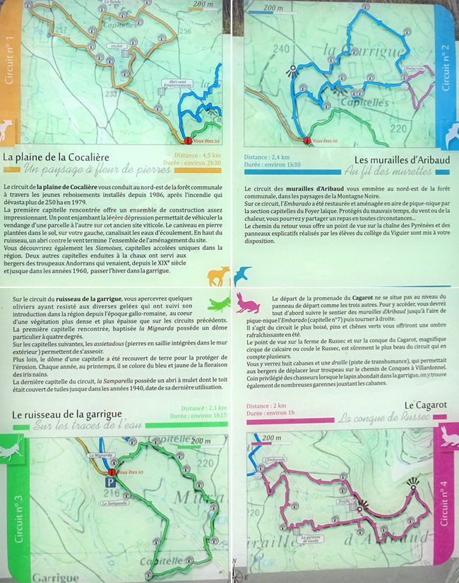 Le panneau situé près du parking détaille les quatre petits circuits dont le plus long n'excède pas 4500 m. Le premier, celui de la Cocalière, est le plus long. C'est celui qui a été remis en état en premier. Il comporte deux capitelles accolées, les Jumelles. On pourra y visiter 13 autres cabanes. Le circuit des Murailles d'Aribaud est planté de cèdres. Il comporte une aire de pique-nique et 11 capitelles. Le Ruisseau de la garrigue, 2,1 km comporte quelques capitelles à l'architecture particulière et 11 cabanes en tout. Le dernier, le Cagarot, offre 9 capitelles et un très beau point de vue sur la campagne cultivée et la vallée du Rieu Sec et ses falaises calcaires.