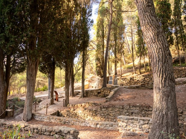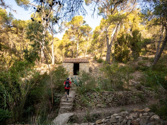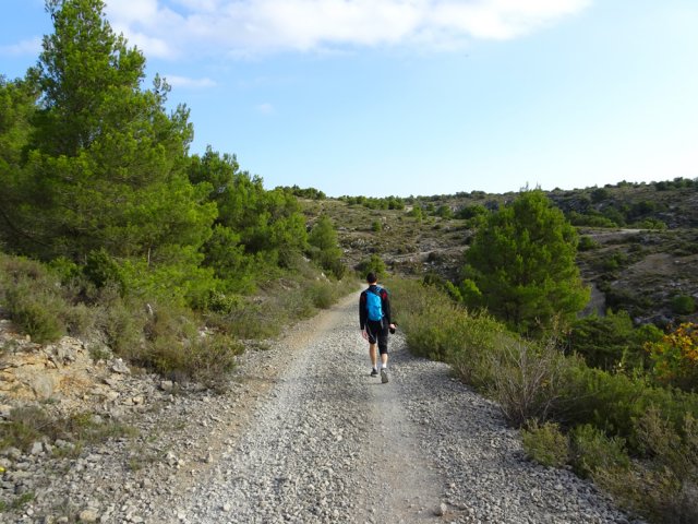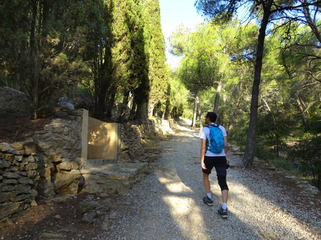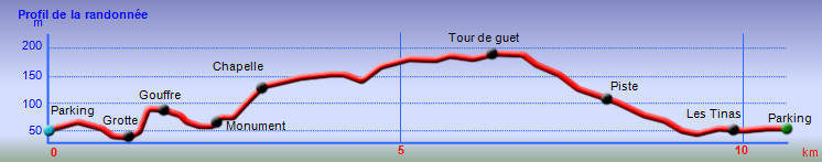 La randonnée débute au grand parking de la Chapelle des Auzils qui sera visitée peu après les Gorges du Rec. Partir plein ouest et longer la route sur un sentier sous les pins. Poursuivre à gauche au premier croisement puis laisser les sentiers suivants pour s'engouffrer au début des Gorges du Rec qu'on atteint par un agréable sentier suivi de quelques marches. Le sentier, bétonné et sécurisé de mains courantes longe la vallée étroite du Ruisseau du Rec dans de beaux paysages calcaires (Photo 1). Suivre la gorge jusqu'au pierrier sur la gauche menant à la grotte de la Crouzade et des falaises qui la bordent (Photo 2). Peu de chance de trouver la porte de ce monument historique ouverte à moins d'y être le jour d'une visite d'archéologues. Découverte en 1866, elle a fait l'objet de maintes fouilles ayant mis au jour des galets peints et silex datés du moustérien jusqu'au néolithique. La frustration est logique mais nécessaire afin de ne pas y trouver des cœurs gravés d'initiales datées de 2018. Revenir sur ses pas et franchir le gué à l'approche des escaliers. La montée est courte, raide et délicate sur un lit de cailloux calcaires (Photo 3). On arrive sur le Plateau des Caunes (grottes en occitan). Des sentiers étroits parcourent le plateau. Se diriger vers l'aven qu'on remarque très vite, surtout si l'on est sujet au vertige (Photo 4). Il est facile d'en effectuer le tour car la végétation est assez rase. Les téméraires tenteront la descente par la partie la plus étroite à l'est. Il est dit que l'aven issu de l'effondrement du plafond d'une immense cavité correspondrait avec la grotte visitée 20 minutes auparavant. Reprendre la direction du parking en rejoignant la pinède traversée au départ (Photo 5). Franchir à nouveau le parking puis entamer la remontée vers la Chapelle des Auzils. On passe tout d'abord devant un monument dédié aux 32 marins disparus en mer le 28 février 1797 (Photo 6). Plus loin c'est une stèle sur la gauche qui annonce le début du cimetière marin. Mais avant de poursuivre, partir sur la droite, franchir un ruisseau à sec sur un petit pont pour pénétrer dans le jardin de l'Ermite (Photo 7). Aménagé sur le modèle des jardins à la française par Michel Cyprien, le dernier ermite, l'endroit a été remis en état par les élèves du lycée agricole de Carcassonne (Photo 8). On peut se rendre au fond du petit cirque pour y trouver des arbres remarquables comme l'arbousier centenaire planté par l'ermite. On s'approche ensuite de la maisonnette qui était plus grande à l'époque (Photo 9). Bien remise en état, cette bâtisse servait au curé de la paroisse avant ou après les messes dites à la chapelle (Photo 10). Terminer la montée en longeant les cénotaphesTombes sans corps servant de mémorial pour d'émouvants recueillements en lisant que père et fils ont tous deux disparu en mer (Photo 11). La fin de la montée longe de nouvelles tombes en effectuant un lacet (Photo 12). Impossible de manquer la chapelle qui domine le chemin empierré (Photo 13). On passe tout d'abord devant la grotte St-Salvaire qui n'est plus ouverte au public pour ne pas déranger la colonie de chauve-souris qui y séjourne (Photo 14). La superbe chapelle à la toiture en forme de charpente de navire renversée se visite à condition d'avoir une tenue correcte et de laisser les sacs à dos à l'extérieur. Elle semble immense et peut accueillir une bonne centaine de fidèles. Les murs sont couverts d'ex-voto presque tous dédiés aux gens de la mer (Photo 15). De nombreux ex-voto volés ont été reproduits à l'identique en trompe l'œil sur les murs. Après cette visite importante, prendre la piste qui va suivre le bord du Plateau de Notre-Dame sur une longue distance. La piste couverte de gravier et petites pierres ne comporte aucune difficulté (Photo 16). Le paysage est un peu aride au milieu de la garrigue et des pins mais les panoramas sont nombreux vers la mer ou dans les vallées de petits ruisseaux à sec qui parcourent la région. Des sentiers et autres pistes partent parfois dans cette garrigue pour de futures balades (Photo 17). La piste effectue un long détour pour franchir le Ruisseau de l'Hort Vieil (Photo 18). Plus loin, ne pas manquer le sentier partant à droite vers la tour de gué. L'endroit est très fréquenté mais on trouve toujours une roche plate pour se reposer (Photo 19). De là, le regard porte très loin en direction des forêts, des vignes et de la mer (Photo 20). La tour est idéalement placée pour la surveillance des feux mais aussi pour profiter de ces magnifiques paysages (Photo 21). Revenir à la piste, partir à droite puis emprunter le beau sentier longeant le rempart. Il est étroit mais très agréable parmi les odeurs de thym (Photo 22). On profite à nouveau de belles vues sur la région pour repérer le trajet que l'on va emprunter pour le retour (Photo 23). Partir à droite en rejoignant une nouvelle piste et entamer la descente du plateau vers les vignes aperçues plus haut. La pente est assez faible et la marche facile. On se retrouve le plus souvent en sous-bois dans la pinède avec des vues de plus en plus nombreuses sur le roc de la Vigie et de sa tour de gué (Photo 24). On rencontre une large piste agréable en plein soleil (Photo 25) mais il est préférable de suivre les sentiers qui la longent (Photo 26). En arrivant au niveau des premières vignes, traverser quelques mètres de sous-bois et les longer en direction des Tinas qu'on aperçoit un peu plus loin. Rejoindre le hameau entouré de vignes près d'une colline dépassant à l'horizon (Photo 27). Il est alors possible de terminer par la petite route mais on repère très vite les sentiers qui l'évitent (Photo 28). La fin de la boucle s'effectue à droite ou à gauche de la route que l'on traverse quelques fois. Impossible de manquer le parking sur la gauche, fin de la boucle.