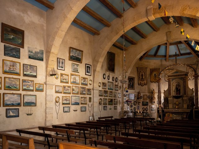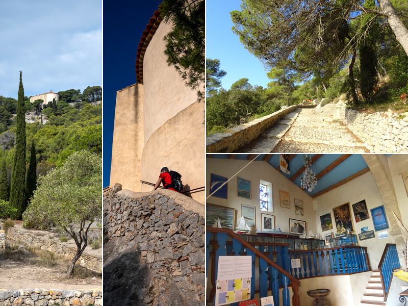 La chapelle daterait de 1635. Les travaux ayant débuté au fond du vallon furent déplacés à l'emplacement actuel. Elle est constituée d'une nef rectangulaire et d'une toiture en barque inversée, très symbolique pour sa vocation marine. Plusieurs vols importants d'ex-voto ayant été perpétrés en 1967, un restaurateur des Monuments Historiques (Robert Cassin) eut l'idée de les recopier d'après photographies à même les murs de la chapelle sous forme de trompes l'œil qui valent à eux seuls le déplacement lors de la randonnée. En 1978, ce sont les termites qui dévorent une partie des éléments en bois. La chapelle se visite à des horaires variables en fonction des saisons (ou des pandémies !) moyennant quelques euros qu'il ne faut pas laisser dans le véhicule.