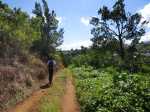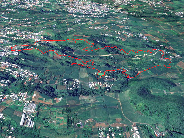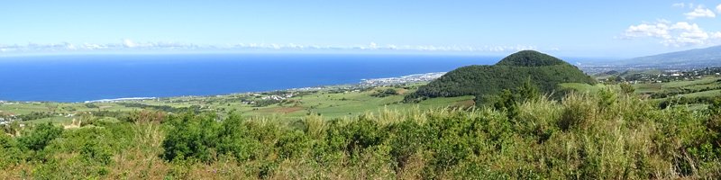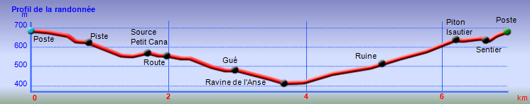 La randonnée débute à la poste de Piton des Goyaves où il est aisé de stationner pour trois heures. Emprunter la Rue de la Cour qui descend en pente douce vers les premiers champs de canne (Photo 1). On domine la campagne environnante et le regard porte aussitôt sur le Piton de Mont Vert qui cache en partie la ville de Saint-Pierre (Photo 2). Sur la gauche, on peut déjà repérer le Piton Isautier ainsi que le champ de canne qui occupe le sommet (Photo 3). A l'horizon, ce sont le Grand Bénare et le Piton des Neiges qui dominent la campagne (Photo 4). Côté mer, le regard porte de Saint-Joseph jusqu'à Saint-Louis et l'on devine les vagues de la plage de Grands Bois. Le trajet sera toujours le même, à savoir quelques rares et courts tronçons de routes et surtout des pistes cannières en bon état (Photo 5). Cinq bonnes minutes après le départ de la piste, le sentier effectue un grand lacet vers la droite. Les 100 derniers mètres sont un peu envahis de canne à sucre (Photo 6). On s'approche de la Source du Petit Cana dans le grand virage à gauche. La jonction avec la modeste source d'où sort un filet d'eau est facultative puisqu'en aller-retour. Il faudra pour cela traverser 150 mètres de friche en bordure d'un champ de canne en restant toujours au plus près du ru. On parvient très rapidement à un petit bâtiment délaissé destiné à abriter volailles et cabris (Photo 7). Des champs à moitié abandonnés entourent l'étable. La source, très bien placée à l'époque où il y avait des animaux est facile à trouver entre les rochers, proche d'un muret de pierres sèches (Photo 8). On peut même tenter une remontée des rochers en direction de la Source Bois d'Eau, tarie dans les cannes fourragères. Revenir sur ses pas puis poursuivre la boucle en reprenant la piste dans les cannes (Photo 10). La piste puis la route descendent régulièrement en direction du Piton de Mont Vert qu'on a toujours en ligne de mire (Photo 11). Au premier croisement, prendre à gauche l'Allée des Calumets bordée par endroits de hauts talus recouverts de petites orchidées roses. La route se termine par une forte descente au pied du piton (Photo 12). Longer quelques belles propriétés entourées de grands jardins créoles et parvenir à la Ravine de l'Anse qui se franchit aisément par un gué souvent à sec (Photo 13). Suivre la ravine en rive droite sous les faux poivriers. Continuer toujours sur la piste dans les cannes ponctuées de pieds de chandelles (Photo 14). Plusieurs pistes débutent le long du parcours. Toujours choisir la plus marquée par les traces de pneus de tracteurs. On s'éloigne petit à petit du Piton de Mont Vert tout en s'approchant du Piton Isautier couvert par autant de canne que de bois (Photo 15). On parvient sans encombre à la D29 pour franchir par un petit pont la modeste Ravine de l'Anse. Après une courte portion de la RD29, partir à droite sur la Rue des Fanjans à travers quelques habitations (Photo 16). Après les jardins et cases fleuries la montée se poursuit dans les cannes par une pente moyenne (Photo 17). La marche sur route bétonnée prend fin à une grille traversant la route pour l'écoulement des eaux. Le repérage est facile grâce aux deux araucarias et au cocotier qui dépassent des cannes (Photo 18). Emprunter une large piste cannière assez caillouteuse qui monte parfois plus sérieusement par quelques virages. Elle se rétrécit plus haut et s'approche d'un bois d'eucalyptus. La marche s'effectue à l'ombre sur un sol glissant par endroits, sous de splendides spécimens d'eucalyptus. Elle passe près d'une ruine en pierre de taille, signe de richesse à l'époque où elle était encore debout (Photo 19). Prendre son temps pour apprécier la plantation d'eucalyptus robustes (Eucalyptus robusta) reconnaissables à leur écorce très épaisse. Depuis l'abandon de la propriété, les pothos (Epipremnum pinnatum) ont recouvert les arbres jusqu'aux plus hautes branches pour un beau spectacle naturel (Photo 20). Certains arbres dépassent les 20 mètres de hauteur et les 3 m de circonférence (Photo 21). Une grande case, également dévorée par les pothos, tombe lentement en ruine près de la lisière du bois (Photo 22). On retrouve les cannes à sucre. La pente est régulière en direction du piton sur une terre d'autant plus rouge qu'elle a été remuée par des engins de chantier (Photo 23). Le relief est assez tourmenté et l'extraction de la canne doit demander de gros efforts sur les pentes bordant les nombreux affluents de la Ravine de l'Anse (Photo 24). A l'approche du sommet sur la gauche, emprunter la piste longeant un champ et rejoindre un petit sommet en terre. De là, on bénéficie d'un magnifique panorama à 360 sur toute la région avec le Piton de Mont Vert en direction de Saint-Pierre (Photo 25). Revenir sur le chemin en terre et laisser sur la droite une réserve d'eau à sec. La piste descend en légère pente à travers les cannes vers les première habitations de Piton des Goyaves (Photo 26). La piste oblique près de grosses touffes de bambous puis se dirige vers un lotissement en offrant de nouveaux points de vue sur le parcours effectué. Remonter l'Allée des Muguets au milieu du lotissement et ne pas manquer, juste après le numéro 16, le petit sentier qui débute contre une maison et donne l'impression de pénétrer dans une propriété privée (Photo 27). Cet étroit passage effectue quelques lacets pour atteindre le bas de l'Impasse des Lys. La petite route bétonnée bordée de quelques cases est en très forte pente qui coupe le souffle (Photo 28). Elle s'assagit bientôt et l'effort est moindre pour atteindre la poste de Piton des Goyaves, fin de la boucle.