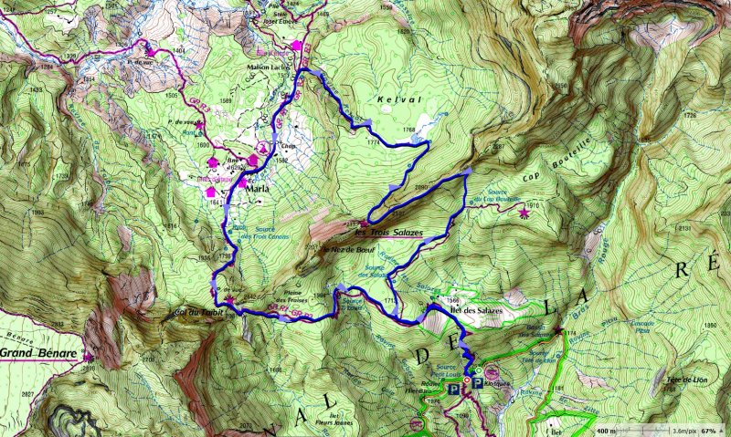 Se rendre à Cilaos et poursuivre vers l'Îlet à Cordes jusqu'au départ du sentier du Taïbit - Entamer la montée au col puis redescendre vers Marla - Traverser l'îlet et poursuivre vers Maison Laclos - Suivre la Ravine Kerval pour atteindre le plateau - Trouver le bon passage pour attaquer le rempart des Salazes afin d'atteindre la crête au Col Choupette - Redescendre vers le Cap Bouteille puis bifurquer à droite plus bas vers le GRR1 - Partir à gauche sur le GR et revenir au point de départ.