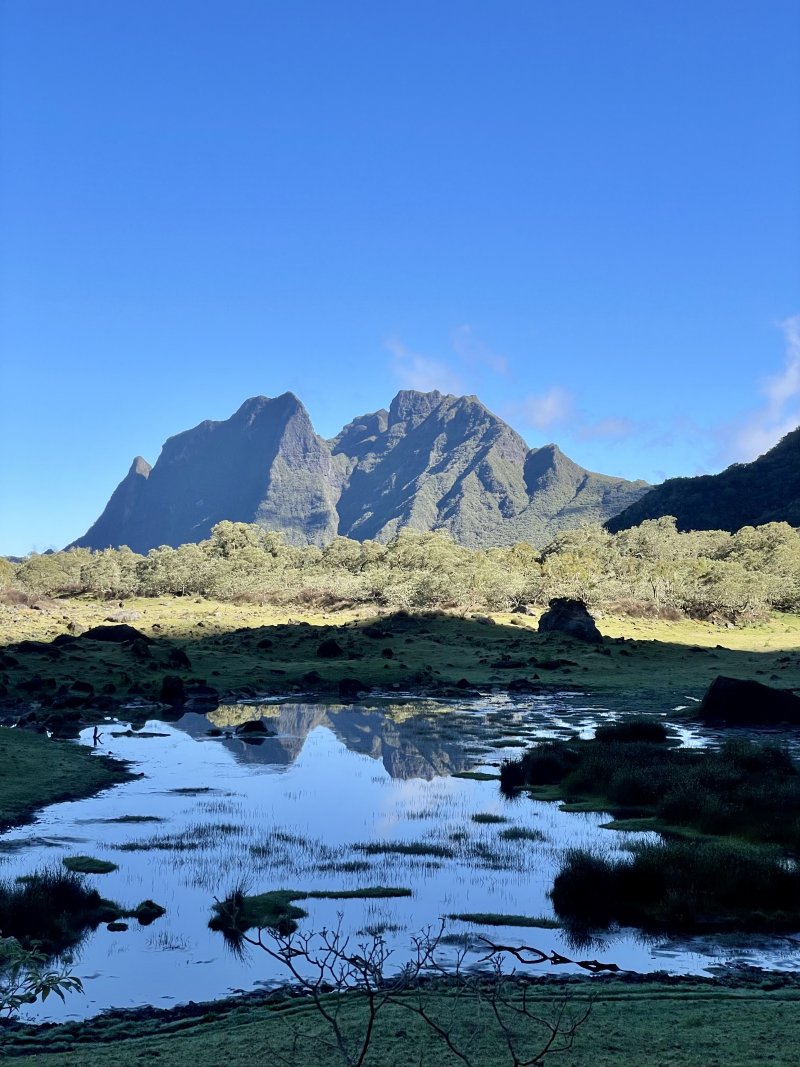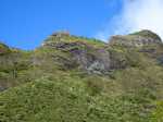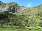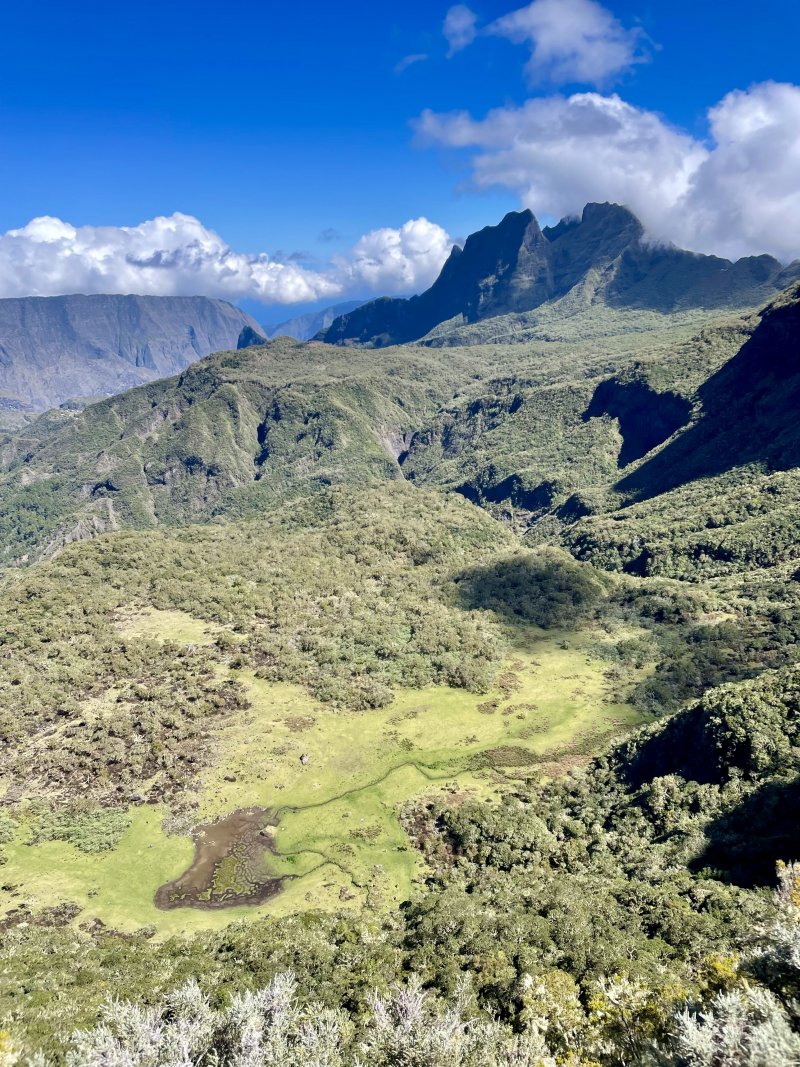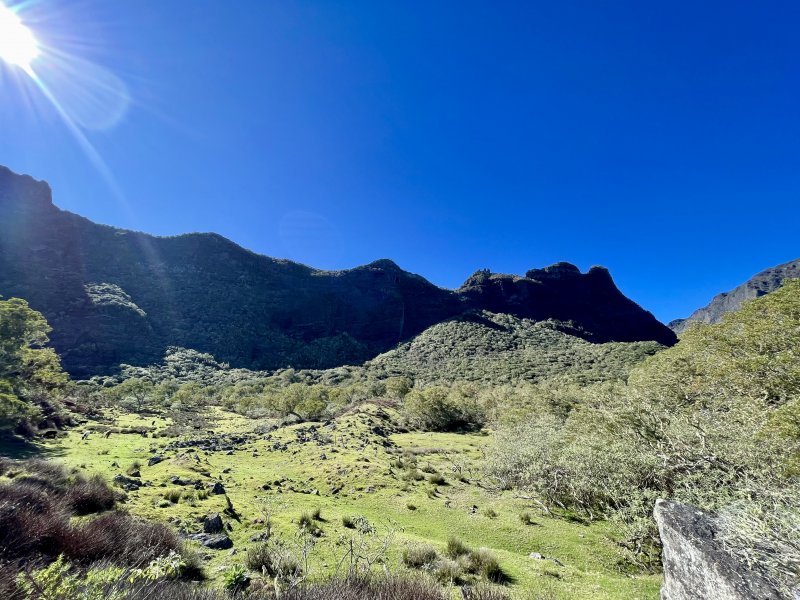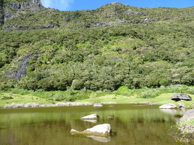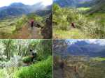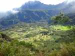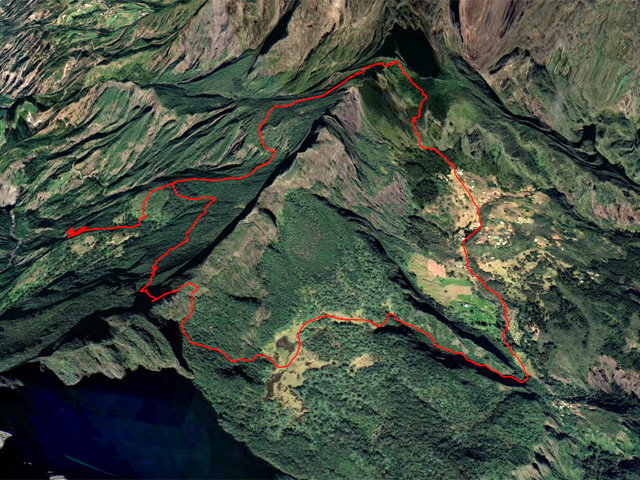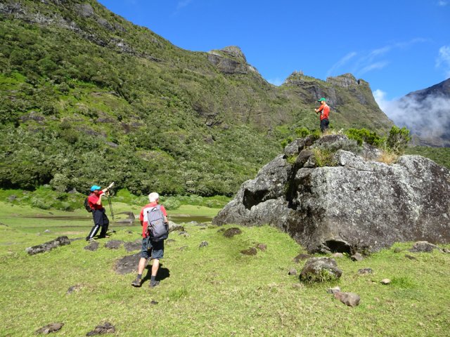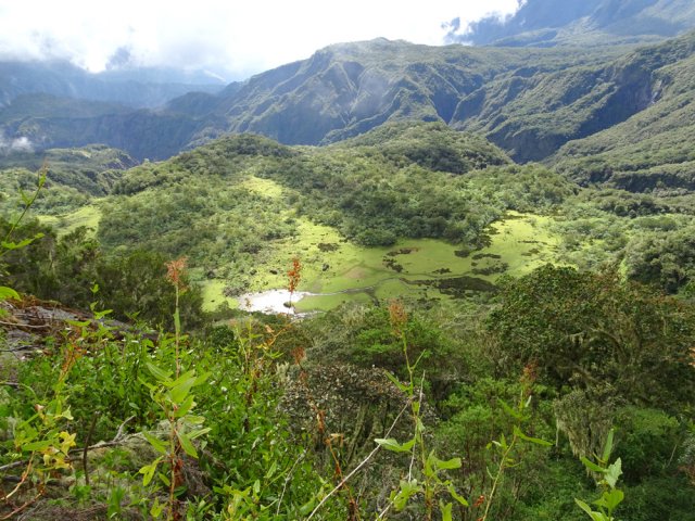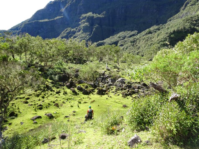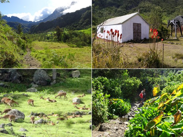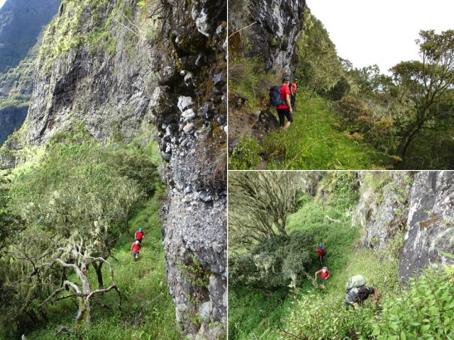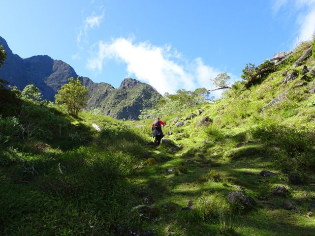 La randonnée débute à la route de l'Îlet à Cordes par la très classique montée du GRR1/2 vers le Col du Taïbit. Sans échauffement, inutile de partir trop vite pour cette longue ascension parfois technique. Les marches succèdent aux marches tout comme les lacets aux lacets avec deux seuls endroits plus plats vers l'Îlet des Salazes et la Plaine aux Fraises (Photo 1). Ce sentier très fréquenté est une entrée prisée pour pénétrer dans Mafate par le Sud. En garder dans les jambes pour la descente vers Marla et la remontée au Kerval. Deux heures après le départ, on s'approche du col pour bénéficier des premiers panoramas sur Mafate à partir du promontoire (Photo 2). Peu de changements pour la descente qui emprunte également de nombreux lacets et quelques belles pentes (Photo 3). Des portions glissantes et un peu vertigineuses se passent avec précautions et l'on parvient en 45 minutes aux premières cases de Marla à plus de 1600 m d'altitude. La traversée de l'îlet verdoyant s'effectue en légère descente facile en passant près de quelques vaches, de chèvres attachées, de gîtes et d'épiceries où il est possible de se ravitailler. Ne pas manquer le troupeau de biches aux alentours de la chapelle avant de parvenir à la Ravine Kerval (Photo 4). Le sentier débute en rive droite dans le sous-bois, quelques mètres après la ravine. Très vite, la pente s'accentue et les roches encombrant le fond de la ravine servent de hautes marches (Photo 5). Pas de sentier officiel mais des traces de passage et des petits cairns permettent de rassurer sur l'itinéraire. Après le franchissement d'une vieille porte en bois délabrée empêchant le bétail de s'échapper, poursuivre vers le plateau dans la ravine ou sur ses berges (Photo 6). Ne pas chercher à quitter le lit tant que les cairns ou la disposition du terrain facilitent la montée (Photo 7). Les 200 m de montée se terminent sur un sol plus dénudé où bouses et empreintes de sabots confirment que le plateau est habité par les bovins (Photo 8). On bénéficie de quelques panoramas en direction du cirque pour apprécier le chemin parcouru (Photo 9). Le paysage de cette zone de pâturages d'altitude est magnifique avec les trois Salazes qui dominent toute la région (Photo 10). Marcher dans la prairie caillouteuse en direction du rempart. Le Gros Morne domine également tout le plateau recouvert par endroits de magnifiques tamarins des hauts (Photo 11). Le sol est un peu vallonné, couvert par endroits de roches ou de tamarins (Photo 12). On atteint très facilement la mare abritant quelques petits poissons et servant d'abreuvoir au troupeau de vachettes vivant dans ces lieux (Photo 13). L'endroit est charmant sous le soleil (Photo 14). Il attire fréquemment les campeurs venant y passer une nuit. Les vachettes vivent ici paisiblement en profitant de l'herbe rase. On peut les approcher sans grand danger à condition de ne pas les effrayer par des gestes brusques (Photo 15). Un rocher isolé permet de profiter de ce coin bucolique en reprenant des forces avant d'entamer la montée au rempart (Photo 16). C'est de ce rocher que l'on a le meilleur angle pour apprécier la suite du trajet qui débutera près de la petite cascade alimentant le lac (Photo 17). Se diriger vers la fine chute puis obliquer à gauche vers la ravine presque à sec venant du rempart. Pas de sentier à cet endroit. Il faut choisir le meilleur passage entre les roches et surtout les jouvences qui recouvrent le sous-bois, cachant quelques pièges entre les pierres (Photo 18). La solution la plus facile consiste à suivre cette ravine au plus près, soit le long des rives soit en empruntant le fond moussu et glissant (Photo 19). En marchant plein est pour se rapprocher du rempart, on parvient facilement sur de vastes pierriers moussus où poussent de magnifiques bois de couleurs dont mahots, mapous et bois de nèfles (Photo 20). Les jouvences sont petit à petit remplacées par le persil et pourpier marrons, fraises d'lo ou des bois, oseilles sauvages ou chasse vieillesse (Faujasia salicifolia). Les barbes de Jupiter ont envahi toutes les branches (Photo 21). Le sol se dénude graduellement à l'approche des falaises constituées d'orgues basaltiques (Photo 22). Il est surtout constitué d'un immense pierrier moussu assez stable. Suivre longuement la falaise entre hautes roches et bois de couleurs (Photo 23). Si jusque là la montée était un hors sentier technique, la suite est autrement plus sportive, tant pour les bras que pour les jambes. Ne pas manquer l'étroit passage à la fin de la falaise verticale pour s'en échapper. La rude grimpette sur un sol recouvert de jouvence doit se pratiquer avec beaucoup de prudence jusqu'à une première corde vieillissante (Photo 24). Plus haut un câble en acier rassure pour franchir un passage vertical barré par un énorme arbre mort. L'effort est intense pour y parvenir et le passage étroit entre tronc et roche pour passer corps et sac à dos. Une corde apportée pour l'occasion peut aider à monter le sac une fois l'écueil franchi. L'arête approche et les panoramas sur le plateau du Kerval se multiplient (Photo 25). Ne jamais baisser la garde pour les derniers franchissements parfois étroits et dominant le vide. L'effort est récompensé en franchissant les branles moussus bordant l'étroite arête des Salazes (Photo 26). La montée prend fin à quelques mètres d'une dent rocheuse repérée depuis le rocher dans la prairie des bovins 300 m plus bas (Photo 27). Les difficultés ne sont pourtant pas encore terminées car il faut affronter la rude descente vers le sentier de Cap Bouteille. La pente y est très forte, les roches glissantes mais quelques cordes facilitent des passages (Photo 28). Après tous ces efforts, la pente paraît interminable mais on parvient enfin au sentier de Cap Bouteille qui semble une autoroute après ces trois heures plus aventureuses. Partir sur la droite puis poursu