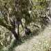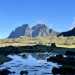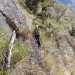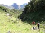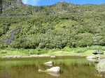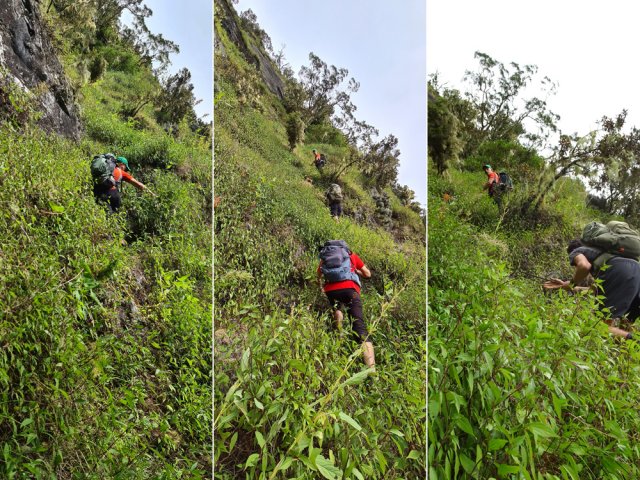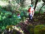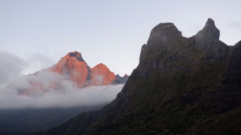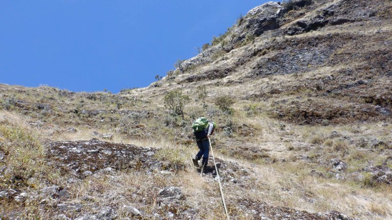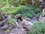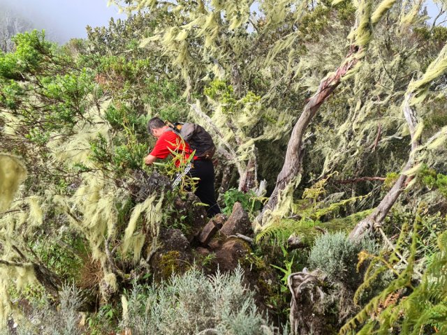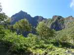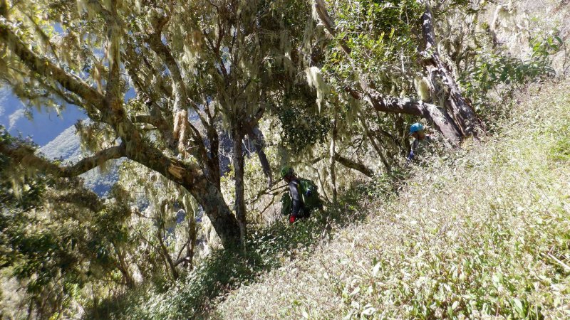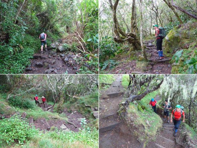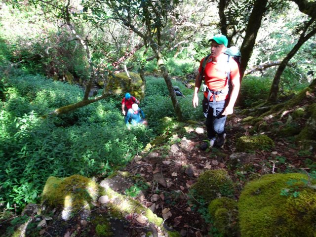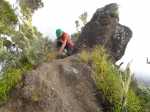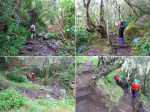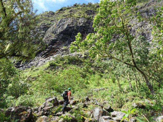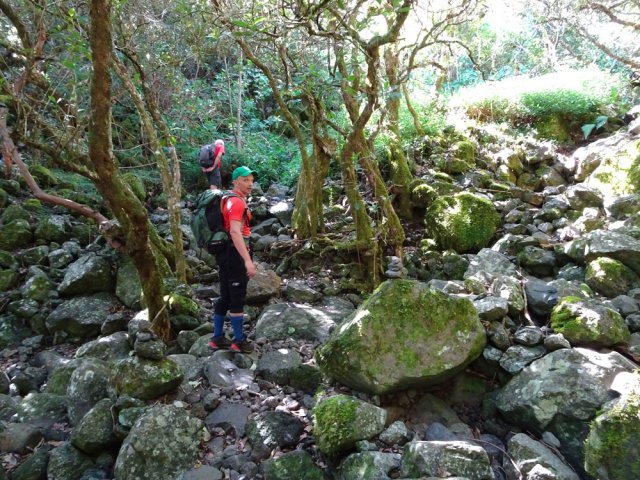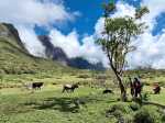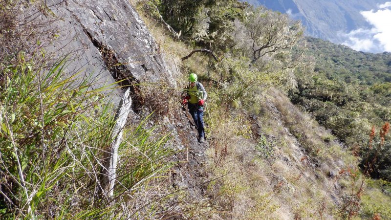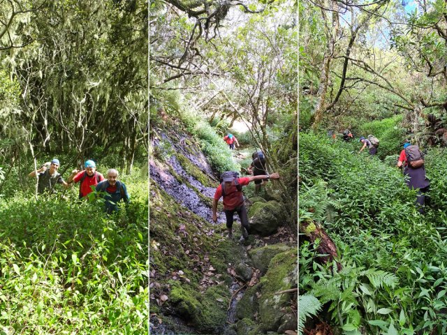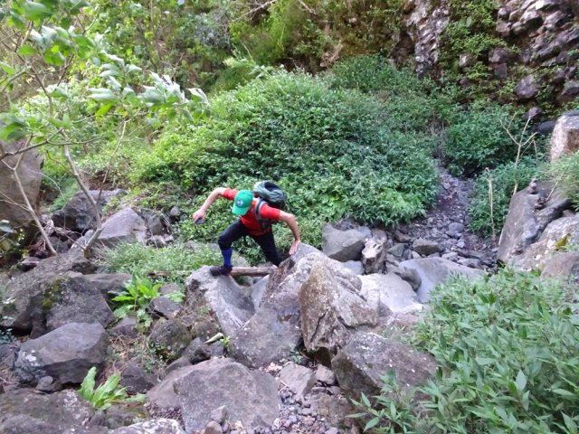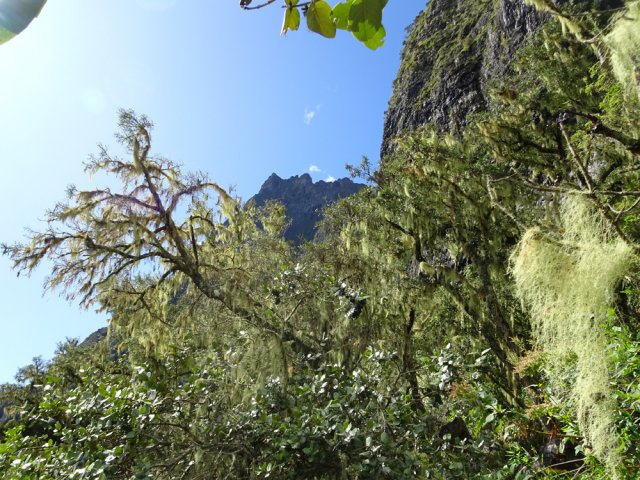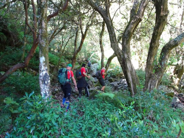 La randonnée débute à la route de l'Îlet à Cordes par la très classique montée du GRR1/2 vers le Col du Taïbit. Sans échauffement, inutile de partir trop vite pour cette longue ascension parfois technique. Les marches succèdent aux marches tout comme les lacets aux lacets avec deux seuls endroits plus plats vers l'Îlet des Salazes et la Plaine aux Fraises (Photo 1). Ce sentier très fréquenté est une entrée prisée pour pénétrer dans Mafate par le Sud. En garder dans les jambes pour la descente vers Marla et la remontée au Kerval. Deux heures après le départ, on s'approche du col pour bénéficier des premiers panoramas sur Mafate à partir du promontoire (Photo 2). Peu de changements pour la descente qui emprunte également de nombreux lacets et quelques belles pentes (Photo 3). Des portions glissantes et un peu vertigineuses se passent avec précautions et l'on parvient en 45 minutes aux premières cases de Marla à plus de 1600 m d'altitude. La traversée de l'îlet verdoyant s'effectue en légère descente facile en passant près de quelques vaches, de chèvres attachées, de gîtes et d'épiceries où il est possible de se ravitailler. Ne pas manquer le troupeau de biches aux alentours de la chapelle avant de parvenir à la Ravine Kerval (Photo 4). Le sentier débute en rive droite dans le sous-bois, quelques mètres après la ravine. Très vite, la pente s'accentue et les roches encombrant le fond de la ravine servent de hautes marches (Photo 5). Pas de sentier officiel mais des traces de passage et des petits cairns permettent de rassurer sur l'itinéraire. Après le franchissement d'une vieille porte en bois délabrée empêchant le bétail de s'échapper, poursuivre vers le plateau dans la ravine ou sur ses berges (Photo 6). Ne pas chercher à quitter le lit tant que les cairns ou la disposition du terrain facilitent la montée (Photo 7). Les 200 m de montée se terminent sur un sol plus dénudé où bouses et empreintes de sabots confirment que le plateau est habité par les bovins (Photo 8). On bénéficie de quelques panoramas en direction du cirque pour apprécier le chemin parcouru (Photo 9). Le paysage de cette zone de pâturages d'altitude est magnifique avec les trois Salazes qui dominent toute la région (Photo 10). Marcher dans la prairie caillouteuse en direction du rempart. Le Gros Morne domine également tout le plateau recouvert par endroits de magnifiques tamarins des hauts (Photo 11). Le sol est un peu vallonné, couvert par endroits de roches ou de tamarins (Photo 12). On atteint très facilement la mare abritant quelques petits poissons et servant d'abreuvoir au troupeau de vachettes vivant dans ces lieux (Photo 13). L'endroit est charmant sous le soleil (Photo 14). Il attire fréquemment les campeurs venant y passer une nuit. Les vachettes vivent ici paisiblement en profitant de l'herbe rase. On peut les approcher sans grand danger à condition de ne pas les effrayer par des gestes brusques (Photo 15). Un rocher isolé permet de profiter de ce coin bucolique en reprenant des forces avant d'entamer la montée au rempart (Photo 16). C'est de ce rocher que l'on a le meilleur angle pour apprécier la suite du trajet qui débutera près de la petite cascade alimentant le lac (Photo 17). Se diriger vers la fine chute puis obliquer à gauche vers la ravine presque à sec venant du rempart. Pas de sentier à cet endroit. Il faut choisir le meilleur passage entre les roches et surtout les jouvences qui recouvrent le sous-bois, cachant quelques pièges entre les pierres (Photo 18). La solution la plus facile consiste à suivre cette ravine au plus près, soit le long des rives soit en empruntant le fond moussu et glissant (Photo 19). En marchant plein est pour se rapprocher du rempart, on parvient facilement sur de vastes pierriers moussus où poussent de magnifiques bois de couleurs dont mahots, mapous et bois de nèfles (Photo 20). Les jouvences sont petit à petit remplacées par le persil et pourpier marrons, fraises d'lo ou des bois, oseilles sauvages ou chasse vieillesse (Faujasia salicifolia). Les barbes de Jupiter ont envahi toutes les branches (Photo 21). Le sol se dénude graduellement à l'approche des falaises constituées d'orgues basaltiques (Photo 22). Il est surtout constitué d'un immense pierrier moussu assez stable. Suivre longuement la falaise entre hautes roches et bois de couleurs (Photo 23). Si jusque là la montée était un hors sentier technique, la suite est autrement plus sportive, tant pour les bras que pour les jambes. Ne pas manquer l'étroit passage à la fin de la falaise verticale pour s'en échapper. La rude grimpette sur un sol recouvert de jouvence doit se pratiquer avec beaucoup de prudence jusqu'à une première corde vieillissante (Photo 24). Plus haut un câble en acier rassure pour franchir un passage vertical barré par un énorme arbre mort. L'effort est intense pour y parvenir et le passage étroit entre tronc et roche pour passer corps et sac à dos. Une corde apportée pour l'occasion peut aider à monter le sac une fois l'écueil franchi. L'arête approche et les panoramas sur le plateau du Kerval se multiplient (Photo 25). Ne jamais baisser la garde pour les derniers franchissements parfois étroits et dominant le vide. L'effort est récompensé en franchissant les branles moussus bordant l'étroite arête des Salazes (Photo 26). La montée prend fin à quelques mètres d'une dent rocheuse repérée depuis le rocher dans la prairie des bovins 300 m plus bas (Photo 27). Les difficultés ne sont pourtant pas encore terminées car il faut affronter la rude descente vers le sentier de Cap Bouteille. La pente y est très forte, les roches glissantes mais quelques cordes facilitent des passages (Photo 28). Après tous ces efforts, la pente paraît interminable mais on parvient enfin au sentier de Cap Bouteille qui semble une autoroute après ces trois heures plus aventureuses. Partir sur la droite puis poursu