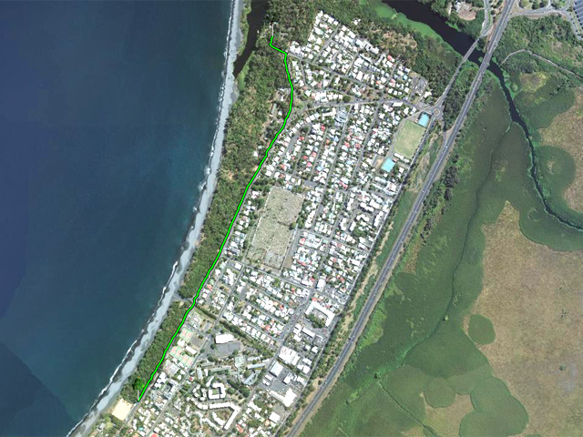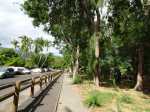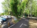La sortie a été reconnue à partir du grand parking proche de l'étang mais il est tout à fait envisageable de rouler à partir du parking proche du CRESP (Photo 21). Débuter tout simplement par la Rue de la Croix en rejoignant la piste cyclable très facile à repérer (Photo 1). On parvient très vite au rond-point marquant le début de l'Avenue du Front de Mer. Son centre est occupé par un bois noir des bas, très impressionnant en période de floraison. Il dépasse à peine les 20 m de hauteur mais il est plus large que haut et possède un tronc énorme (Photo 2). Il apparaîtra un jour dans la liste des arbres remarquables de l'Île. Le circuit longe l'école Louise Siarane dont la clôture affiche quelques beaux paysages de La Réunion (Photo 4). La piste est totalement rectiligne, excepté quelques virages pour contourner des parkings aménagés le long de l'avenue (Photo 5). Elle frôle plus loin une aire dédiée aux sportifs désirant compléter le parcours par des exercices plus violents (Photo 8). On peut d'ailleurs les voir trottiner par moments dans le sous-bois qui longe la piste (Photo 9). Quelques portions ombragées sous les tamarins d'Inde favorisent des arrêts pour souffler (Photo 12). La parcours n'est guère fleuri à l’exception de quelques jardins de l'autre côté de l'avenue (Photo 13). A la fin officielle du circuit sportif, la piste cyclable se prolonge vers la médiathèque. Franchir un pont enjambant une petite ravine (Photo 17). On ne tarde pas à s'approcher de la médiathèque facilement accessible en prenant garde à la circulation (Photo 18). On s'approche de plus en plus de la ville de Saint-Paul et les immeubles se multiplient en bordure d'avenue (Photo 19). La Rue Julius et Ary Lebond, de l'autre côté, marque la fin proche de la sortie. Après une belle case de style créole, se préparer à faire demi-tour (Photo 20). Le retour, tout aussi facile, s'effectue par le même itinéraire.