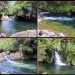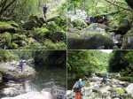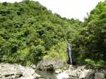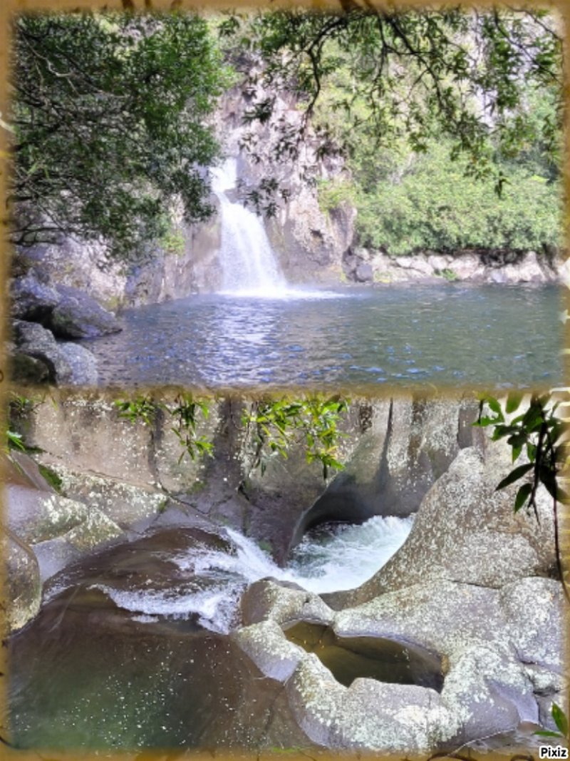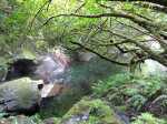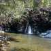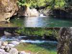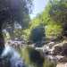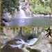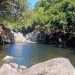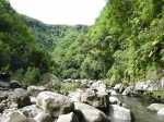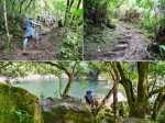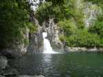 La cascade est en point de mire mais juste auparavant un grand bassin profond qui barre totalement la rivière encadré par de jolies falaises moussues! Martial avance et traverse à la nage en rive droite. Nicolas le suit... Et moi qui ne sait pas nager ? Notre hantise d'avoir à faire demi-tour, de revenir en arrière dans des hors sentiers touffus, longs et difficiles ne va t-elle-pas être inévitable. Et surtout si près du but. Jean Paul me propose de carrément traverser pour rejoindre la rive gauche et là on verra bien. Il va falloir suivre Jean Paul, de l'eau jusqu'aux épaules, qui s'agrippe à la paroi rocheuse, glissante et en pente. Quelques points d'ancrage pour les mains mais peu à mon goût. Si je glisse, je n'ose penser au pire ! je poursuis car je ne vois pas trop d'autre issue (?) et là je panique car je ne vois pas le fond dans l'eau trouble remuée par mes compagnons. Soit disant, le pire est passé et j'ai toujours pied! La victoire semble proche lorsque Nicolas revient me chercher en me tendant son bâton salvateur.
