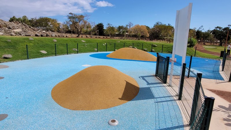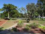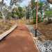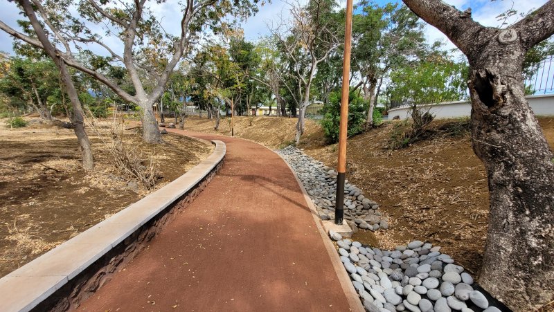 Après de longs mois de travaux, le Parc Laurent Vergès a rouvert ses portes en juillet 2022. Le Parc Boisé paraît assez déboisé et il est difficile d'imaginer que 2000 arbres ont été plantés sur les 17 hectares au cœur de la ville du Port. Ils ont remplacé une grande partie des bois noirs des Bas qui recouvraient une grande partie du parc. S'il reste encore de ces arbres, on voit un peu partout ceux qui les remplacent et mettront quelques années à procurer l'ombre salutaire recherchée dans cette ville surchauffée de l'Ouest. De nouveaux kiosques, une belle aire de jeux d'eau, des bancs ont été installés près d'une piste de 1000 m pour personnes ne se déplaçant qu'en fauteuil roulant. On croise du monde en faisant le tour à pied, signe que l’information est bien passée. On peut se demander pourquoi le béton et le goudron rouge n'ont pas été préférés à la terre battue, plus salissante mais surtout plus fragile lors d'épisodes cycloniques qui détruisent tout par écoulement des eaux. L'îlot central, nettoyé et décoré d'une cascade artificielle de graviers blancs sur fond rouge, n'est pas encore ouvert au public. Plusieurs entrées sont prévues aux horaires d'ouverture du parc. La fiche propose un départ à la Porte des Mascareignes rejointe par le boulevard éponyme.