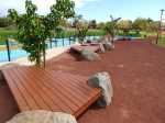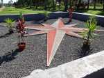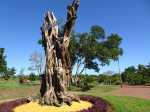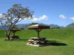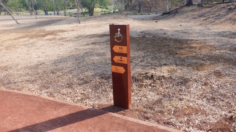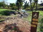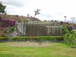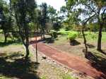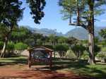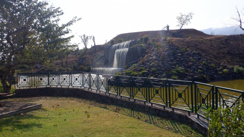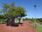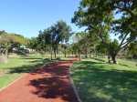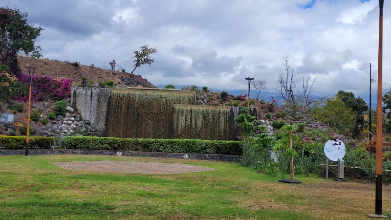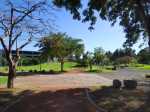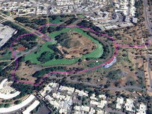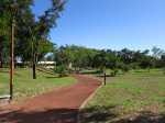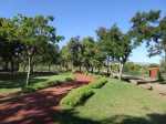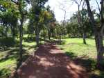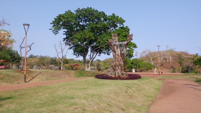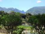 La boucle débute ici à la Porte des Mascareignes. Une dizaine d'autres entrées sont possibles à partir de nombreux endroits de la ville. Tout le parc est entouré d'une grille fermée durant la nuit (Photo 1). Un panneau comporte le plan pour renseigner sur le lieu (Photo 2). S'avancer jusqu'à la piste en terre battue où l'on est accueilli par un arbre mort (Photo 3). Un petit monument est installé au départ depuis l'inauguration du parc en juillet 2022 (Photo 4). Les premiers bancs, un peu ombragés, font leur apparition (Photo 5). Partir sur la gauche en direction de l'aire des jeux d'eau qui devrait faire le plein de marmailles en période de vacances d'été (Photo 6). D'autres bancs triangulaires originaux sont installés en nombre pour se reposer (Photo 7). Poursuivre sur la piste bordée de très jeunes arbres plantés récemment ainsi que de plus anciens laissés après les travaux (Photo 8). Après avoir passé l'école Françoise Dolto, on s'approche du petit lac avant de s'en éloigner aussitôt (Photo 9). La piste en terre rouge est très plate et légèrement sinueuse (Photo 10). Ne pas manquer la belle fresque sur la gauche à l'approche de la clinique (Photo 11). Quelques grands arbres, principalement des bois noirs des Bas ont été laissés pour procurer de l'ombre (Photo 12 et 13). La piste longe même une partie encore boisée (Photos 14). A l'horizon, on distingue très bien l'entrée du Cirque de Mafate du côté de Dos d’Âne et de Sans Souci (Photo 15). La piste arrive ensuite à l'allée des palmiers. Marcher jusqu'à la rose des vents et obliquer à droite (Photo 16). Prendre à droite puis longer le béton jusqu'au point de vue sur la cascade. On passe tout d'abord devant le monument surmonté d'un rocher enchaîné, régulièrement repeint pour ôter les traces de pieds des acrobates qui l'escaladent (Photo 18). La chute, qui ne coule pas toujours, est un large filet d'eau se jetant dans la douve aux eaux vertes entourant le tertre central (Photo 19). Reprendre le chemin inverse pour retrouver le circuit en longeant la prairie bordée de bois noirs des Bas (Photo 20). Poursuivre vers l'est en profitant de belles vues sur Mafate dans les trouées entre les arbres (Photo 21). Par beau temps, on distingue très bien le Piton Cabris et les plus hauts sommets (Photo 23). Continuer en longeant une autre piste séparée par des bois noirs et de nombreux galets d'où l'on aperçoit la décoration ornant la petite colline (Photo 24). La balade se poursuit entre bambous nains (Photo 25) et vétiver (Photo 26). La boucle est terminée lorsque l'on rejoint la grille d'entrée qui est fermée avant la nuit. On peut alors effectuer une halte sous un des kiosques se trouvant près de l'entrée (Photo 27). On peut ainsi profiter encore des magnifiques points de vue sur le cirque (Photo 28). On peut ensuite rejoindre le véhicule, tenter de poursuivre la balade sur une des pistes en terre battue longeant le Boulevard des Mascareignes ou même emprunter la piste cyclable bétonnée pour rallonger cette sortie verdure.