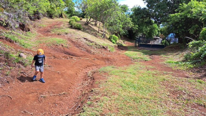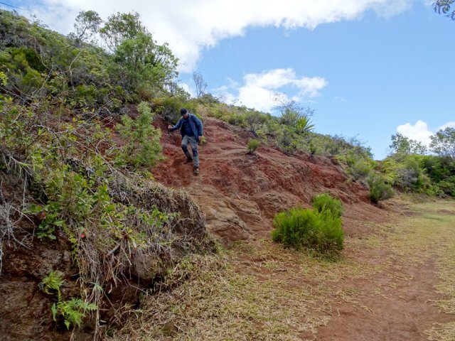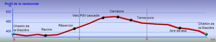 Cette petite boucle familiale à quelques minutes du Boulevard Sud représente une manière originale de proposer, dans le sens de la fiche, des jeux pour enfants en récompense d'un effort de montée de moins de 100 m. Un large sentier transformé en piste par endroits est très connu des sportifs qui le pratiquent dans le cadre de leurs entraînements. La montée est rectiligne mais assez faible. La descente s'effectue souvent en lacets, traverse des terres rouges et la Ravine de la Glacière sur un petit pont avant de parvenir à une aire de repos et de loisirs. Les toboggans, le terrain de basket, les tables de ping-pong semblent bien peu utilisés, sans doute en raison de l'éloignement de la route. Cet important investissement de la municipalité mettra sans doute longtemps à être amorti. Les équipements pour sportifs, eux, voient plus de monde pour les échauffements avant le départ ou étirements après l'effort. Les tables de pique-nique mériteraient une remise en état. Espérons que la lecture de cette fiche amènera en ce lieu quelques enfants désireux de marcher autant que de s'amuser pendant le casse-croûte des parents.