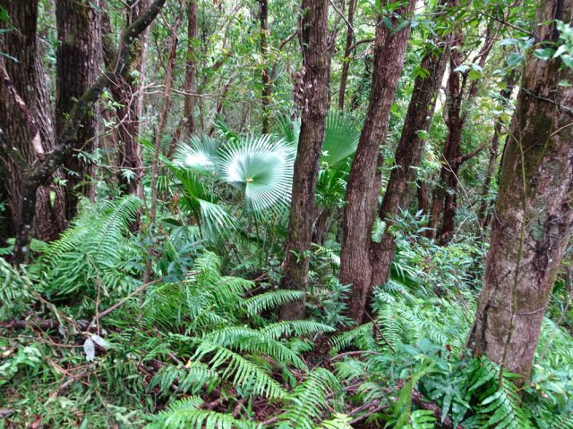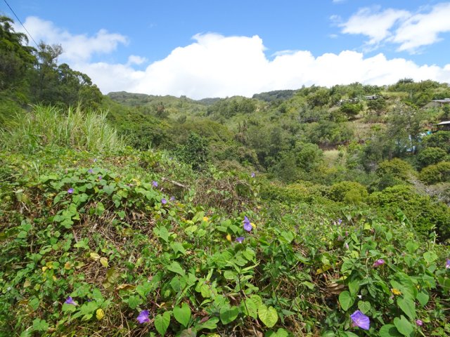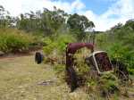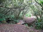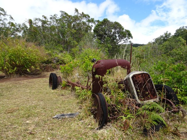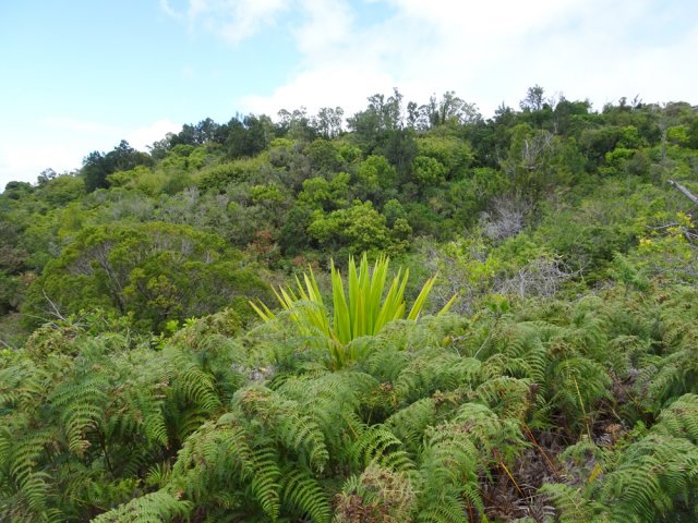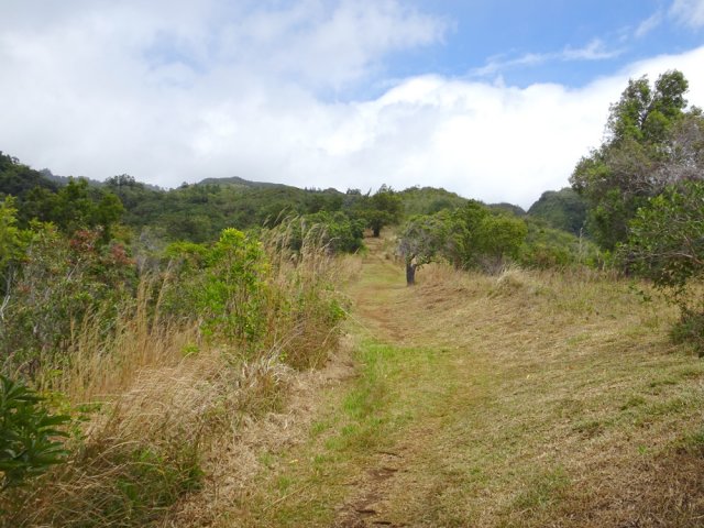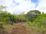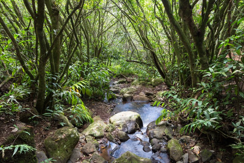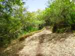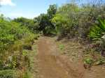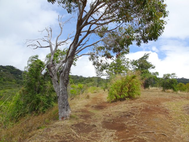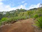 La randonnée débute au Chemin de la Glacière à quelques mètres de la fin de la boucle, le long d'un mur où quelques emplacements permettent de stationner. Cette fiche propose d'entamer la boucle par la route sur un court tronçon qui amène à un gros réservoir d'eau. Les 900 m de route alternent habitations et campagne (Photo 1). On profite de quelques vues sur la campagne autour du Brûlé (Photo 2) ou en direction de Saint-Denis et de ses quartiers vers Sainte-Marie (Photo 3). Franchir le pont sur la Ravine de la Glacière avec possibilité de s'approcher du petit bassin en amont (Photo 4). Après une dernière partie entre les habitations, partir à gauche puis à droite pour contourner l'énorme réservoir Colline Camélias entouré de grillage (Photo 5). La montée sur large sentier débute au réservoir en longeant la rive gauche de la Ravine de la Glacière (Photo 6). La végétation est assez pauvre. Elle est constituée de quelques touffes de bambous balais et de faux poivriers (Photo 7). Le sentier, assez fréquenté des sportifs, est large, très facile malgré la faible pente. Les petits bois de remparts se multiplient tout au long du parcours. Ils atteignent ici des tailles rarement rencontrées (Photo 8). Les presque 100 m montés pour atteindre le haut de la boucle offrent de plus vastes panoramas sur le chef-lieu (Photo 9). Le sentier tourne légèrement à gauche et devient plat à travers les poivriers ou jamrosats (Photo 10). La végétation devient plus touffue à travers les fougères (Photo 11). Avant de traverser un affluent de la Ravine de la Glacière, on peut repérer un sentier discret partant sur la droite pour atteindre un point de vue sur la Cascade de la Ravine du Butor. L'aller-retour ne prend que quelques minutes pour une superbe vue sur la cascade mais sur un sentier beaucoup plus difficile à suivre que celui de la boucle. Il vaut mieux l'avoir reconnu préalablement avant d'y amener de jeunes enfants venus ici pour jouer en fin de boucle sur les toboggans. Après la visite ou non de la cascade, poursuivre sur le sentier totalement plat jusqu'au croisement facilement repérable à la vieille carcasse de camion laissée à l'abandon qui pourra également amuser les marmailles (Photo 13). La descente peut débuter en utilisant la large piste ou le sentier qui lui est parallèle (Photo 14). Comme le circuit proposé est court et classé en familial, il est recommandé de parcourir l'ensemble de la piste et non ses raccourcis parfois un peu abrupts (Photo 16). Que l'on emprunte le sentier ou la piste, on traversera une courte zone des terres rouges habituelles du nord du département (Photo 17). Le sentier continue sa descente en pente douce jusqu'à la Ravine de la Glacière qu'on traverse sur un petit pont (Photo 18). La végétation change pour quelques hectomètres. Le parcours traverse un bois de camphriers envahi de fougères et de palmiers (Photo 19). On retrouve plus bas les faux poivriers et quelques plants de vétiver plantés le long du sentier (Photo 20). Sur la gauche, au-dessus des camphriers et de l'autre côté de la ravine, on devine le sentier emprunté dans la montée (Photo 21). Les manguiers se multiplient le long du parcours, signe que l'endroit était habité ou du moins cultivé il y a quelques décennies (Photo 22). Plus bas, on arrive à une aire de loisirs où l'on rencontre pêle-mêle des tables de pique-nique, des appareils de musculation, des terrains de sport, une table de ping-pong et des jeux pour enfants (Photo 24). Il est l'heure de la halte casse-croûte pour les parents et de l'amusement pour les jeunes sur ces appareils neufs et peu usités. Après la pause, poursuivre par les nombreuses pistes (Photo 26) ou raccourcis vers la fin de la boucle qui se repère à son portail et à sa chicane depuis longtemps évitée pour créer un nouveau sentier où un robinet permet de se rafraîchir.