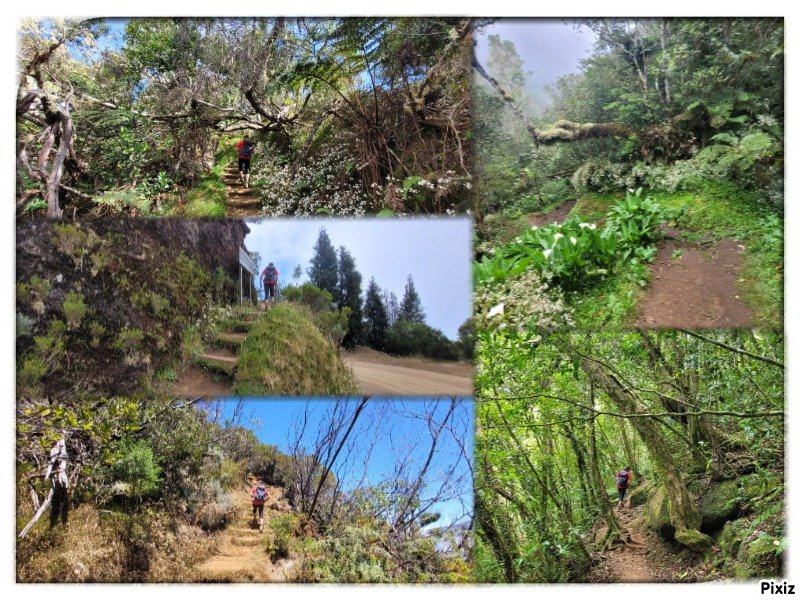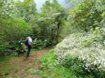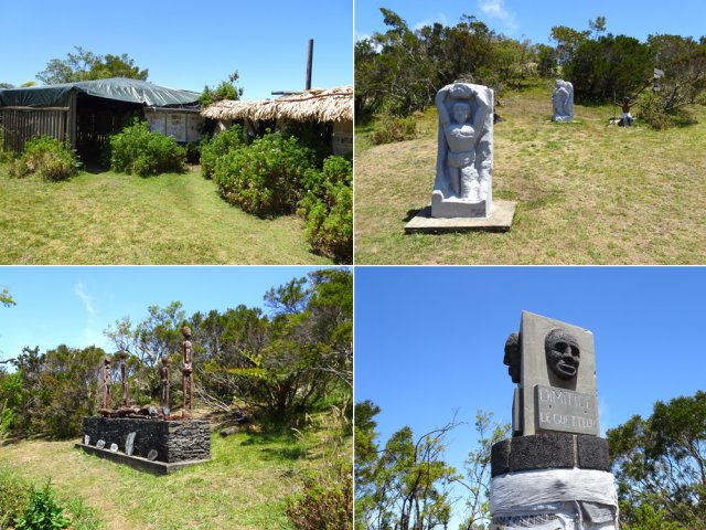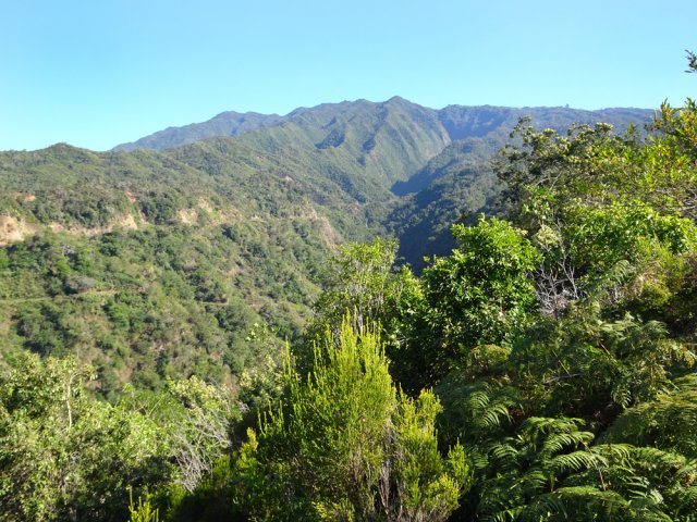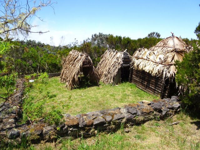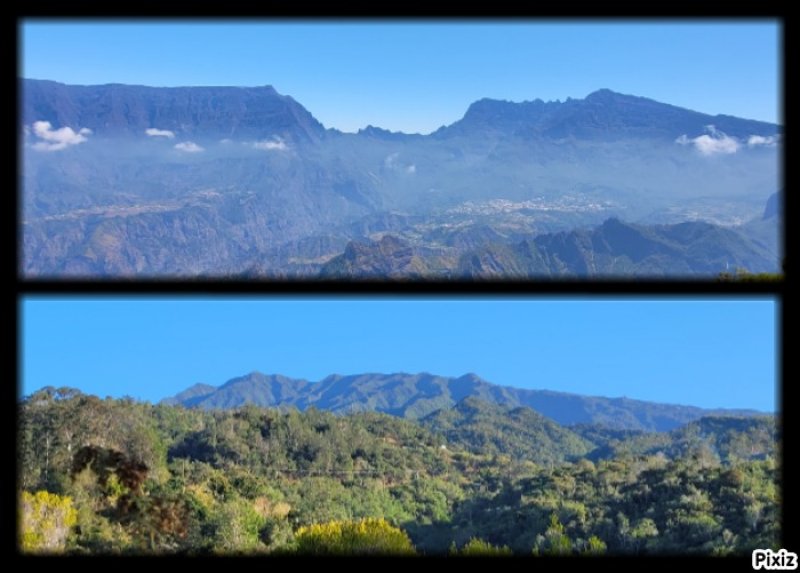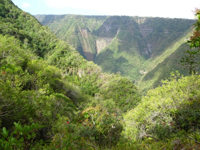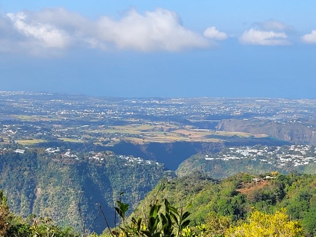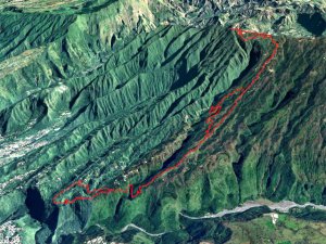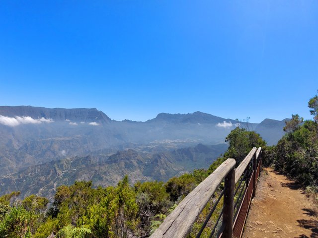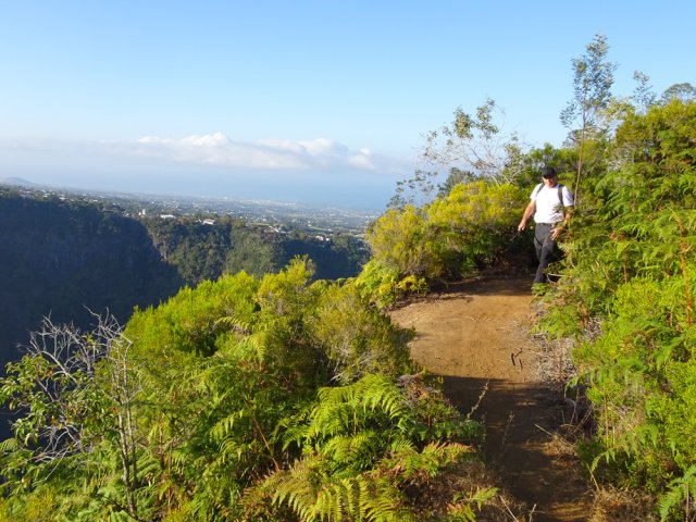 La randonnée débute à l'Impasse des Prunes, la première rue rencontrée après avoir franchi la Ravine Jean Lauret. La ruelle descend en longeant quelques cases et finit dans un virage bordé de bambous. Le sentier prolonge la rue et rejoint assez rapidement le Sentier Le Doyen à travers les bois de couleurs. Il est large, très bien entretenu et fréquenté des coureurs qui ont trouvé là le moyen d'effectuer une courte boucle (Photo 1). La jonction s'effectue par une forte descente. Partir sur la gauche et poursuivre la descente jusqu'au Bras d'Antoine, à sec, qu'on franchit aisément. L'interminable montée vers le Dimitile commence à cette ravine par des lacets en se rapprochant du rempart. Le sentier est de bonne qualité. Il est bordé de fougères, de branles, de jouvences et de quelques bois de couleurs. Certaines pentes constituées de marches sont parfois très raides en bordure de ce rempart qui permet déjà d'apercevoir la vallée du Bras de La Plaine. A gauche on devine souvent le Dimitile et ses dents de scie caractéristiques. On parvient à de nombreux points de vue sur le Bras de La Plaine et sur les villages de l'autre côté (Photo 2). La vallée est profonde mais on distingue bien la rivière coulant dans le bas et le pont de l'Entre-Deux en aval (Photo 3). Repérer au passage le sentier partant sur la gauche qu'on empruntera pour les derniers hectomètres dans 8 heures. Profiter des nouvelles vues sur la campagne environnante et sur l'océan avant d'entamer la descente vers la Ravine de l'Argamasse (Photo 4). Délaisser les deux sentiers rencontrés dans la descente se dirigeant vers Bellevue et traverser la Ravine de l'Argamasse au fond très rocheux. Une nouvelle montée en lacets suivie d'une marche en ligne de crête permet de se rapprocher des maisons isolées de l'Argamasse après avoir emprunté quelques tronçons de pistes poussiéreuses. Des centaines d'acacias noirs, tombés lors du dernier cyclone, bordent le passage. On devine en face le Chemin du Dimitile très utilisé par les marcheurs se rendant au sentier de la Chapelle (Photo 5). Impossible de manquer le croisement des sentiers des Trophées Mondiaux et de la Clape qu'on délaissent pour rester sur la piste. 300 m plus loin, ne pas manquer le départ d'un nouveau sentier plus discret que les précédents (Photo 6). Il est plus étroit mais en comporte toutes les caractéristiques : il est le plus souvent en ligne de crête, bordé de jouvences ou de fougères mais également de centaines de carcasses enchevêtrées d'acacias noirs (Photo 7). La pente y est moins forte sans qu'il soit jamais plat (Photo 8). Plus loin, on parvient à une pierre gravée proche d'une piste que l'on traverse. Le sentier est parfois profondément creusé dans la terre, parfois en bordure de rempart (Photo 9). Il traverse aussi une trentaine de mètres envahis par la vigne marronne qui pourrait le boucher faute de passage (Photo 10). A 1350 m d'altitude, une nouvelle pierre gravée indique le Sentier de La Chapelle qui longe un moment la piste Jean Dubard. La pente s'intensifie sur un parcours agréable, bordé de jouvences et d'acacias (Photo 11), tellement fréquenté qu'il dépasse souvent le mètre de largeur (Photo 12). Il coupe également la piste ou la frôle par endroits près d'habitations fleuries très rarement habitées. Il est souvent creusé dans le sol ou pourvu de nombreuses marches. La pente est parfois assez forte à partir de 1600 m (Photo 13). La montée prend fin sous de beaux tamarins des hauts. On remarque une stèle fleurie entourée de grilles à la mémoire des habitants morts lors du cyclone de 1948, le plus meurtrier du siècle précédent. Plus haut c'est la chapelle qu'on rencontre sur la droite. Au premier croisement de pistes, délaisser celle de droite en direction du Piton des Neiges et s'orienter à gauche vers le Camp Marron (Photo 14). La piste en terre, bordée de haies de spirées, sillonne sur le plateau en effectuant de longs méandres (Photo 15). Prendre à gauche le sentier débutant sous les branles nommé Traces du Guetteur (Photo 16). Ce très agréable parcours sinueux et ombragé mène en quelques minutes aux abords d'un camp entouré d'une clôture en bois. Se diriger vers l'entrée muni de sa pièce de 2€ et entamer la visite par les panneaux sous l'abri avant de vaquer de sculpture en cabane pour visiter l'écomusée (Photo 17). Le Camp du Capitaine Dimitile comporte quelques cases en bois et reconstitutions d'ajoupas recouverts de feuilles de palmiers (Photo 18). Après cette visite qui peut prendre 30 minutes sans se presser, partir en direction du sommet du Dimitile en effectuant une visite aux tamarins bordant le camp (Photo 19). Certains ont atteint un âge respectable et ont bien mieux tenu le choc des cyclones que les centaines de nouveaux cadavres d'acacias noirs. La pente est raide pour mener au belvédère et sa table d'orientation mais la vue sur Cilaos vaut absolument de s'en approcher (Photo 20). Repartir par le même sentier et bifurquer à gauche sur le sentier de Bord pour marcher en direction du gîte de la Caverne Dufour. Les acacias couchés bouchent totalement la vue sur le cirque mais le parcours est très agréable (Photo 21). Tamarins et fougères procurent plus d'ombre que lors de la montée (Photo 22). Le sentier oblique sur la droite, passe devant des installations puis se termine à la piste empruntée une heure avant. Reprendre le chemin inverse en repassant devant la chapelle puis en descendant jusqu'à la pierre gravée. Poursuivre alors sur le Sentier de la Chapelle qui descend vers la Route du Dimitile entre jouvences et arums dans les bois de couleurs (Photo 23). La descente dans les sous-bois verdoyants peut comporter des passages assez pentus (Photo 24) mais on parvient assez rapidement à la piste Jean Dubard. Ne pas prendre à droite au gué vers le parking mais obliquer à gauche sur la piste. Après un long lacet, bifurquer