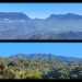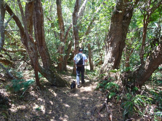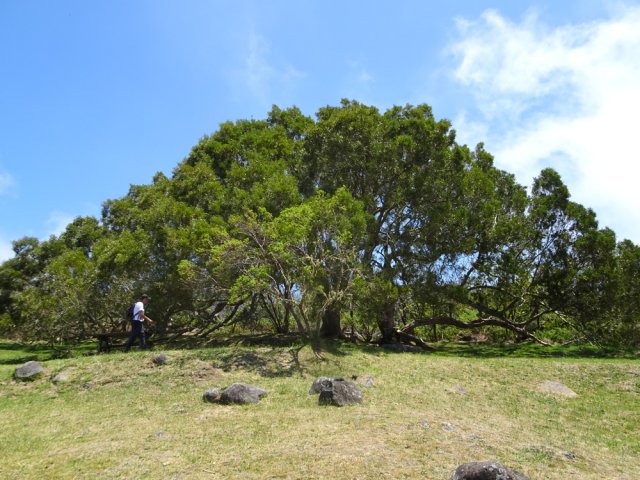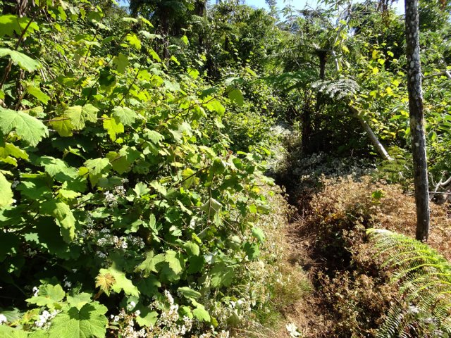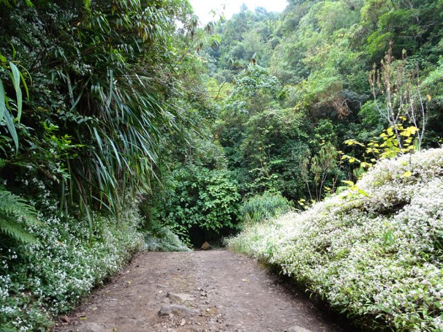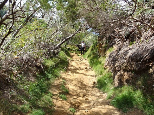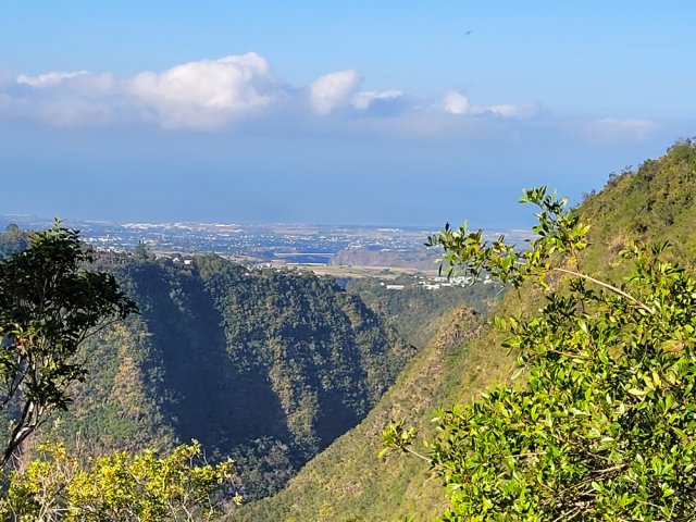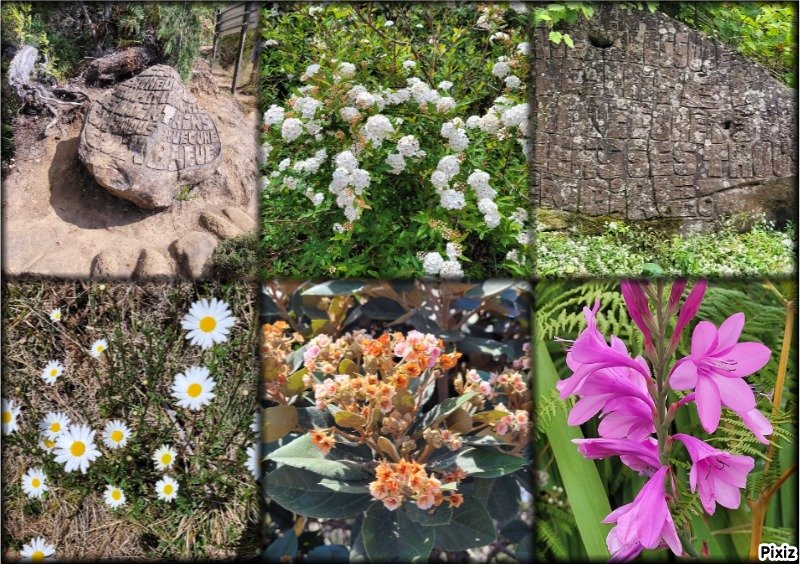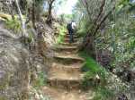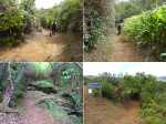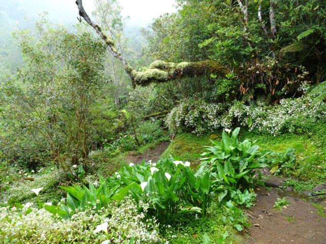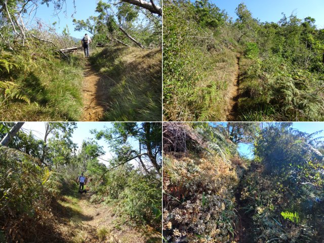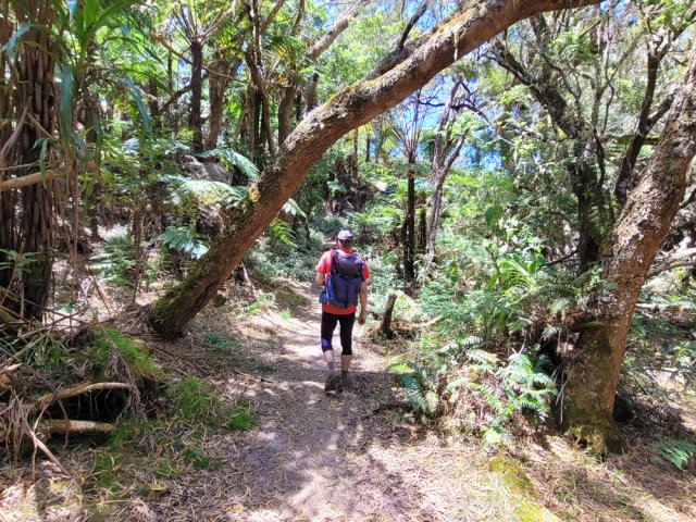 La randonnée débute à l'Impasse des Prunes, la première rue rencontrée après avoir franchi la Ravine Jean Lauret. La ruelle descend en longeant quelques cases et finit dans un virage bordé de bambous. Le sentier prolonge la rue et rejoint assez rapidement le Sentier Le Doyen à travers les bois de couleurs. Il est large, très bien entretenu et fréquenté des coureurs qui ont trouvé là le moyen d'effectuer une courte boucle (Photo 1). La jonction s'effectue par une forte descente. Partir sur la gauche et poursuivre la descente jusqu'au Bras d'Antoine, à sec, qu'on franchit aisément. L'interminable montée vers le Dimitile commence à cette ravine par des lacets en se rapprochant du rempart. Le sentier est de bonne qualité. Il est bordé de fougères, de branles, de jouvences et de quelques bois de couleurs. Certaines pentes constituées de marches sont parfois très raides en bordure de ce rempart qui permet déjà d'apercevoir la vallée du Bras de La Plaine. A gauche on devine souvent le Dimitile et ses dents de scie caractéristiques. On parvient à de nombreux points de vue sur le Bras de La Plaine et sur les villages de l'autre côté (Photo 2). La vallée est profonde mais on distingue bien la rivière coulant dans le bas et le pont de l'Entre-Deux en aval (Photo 3). Repérer au passage le sentier partant sur la gauche qu'on empruntera pour les derniers hectomètres dans 8 heures. Profiter des nouvelles vues sur la campagne environnante et sur l'océan avant d'entamer la descente vers la Ravine de l'Argamasse (Photo 4). Délaisser les deux sentiers rencontrés dans la descente se dirigeant vers Bellevue et traverser la Ravine de l'Argamasse au fond très rocheux. Une nouvelle montée en lacets suivie d'une marche en ligne de crête permet de se rapprocher des maisons isolées de l'Argamasse après avoir emprunté quelques tronçons de pistes poussiéreuses. Des centaines d'acacias noirs, tombés lors du dernier cyclone, bordent le passage. On devine en face le Chemin du Dimitile très utilisé par les marcheurs se rendant au sentier de la Chapelle (Photo 5). Impossible de manquer le croisement des sentiers des Trophées Mondiaux et de la Clape qu'on délaissent pour rester sur la piste. 300 m plus loin, ne pas manquer le départ d'un nouveau sentier plus discret que les précédents (Photo 6). Il est plus étroit mais en comporte toutes les caractéristiques : il est le plus souvent en ligne de crête, bordé de jouvences ou de fougères mais également de centaines de carcasses enchevêtrées d'acacias noirs (Photo 7). La pente y est moins forte sans qu'il soit jamais plat (Photo 8). Plus loin, on parvient à une pierre gravée proche d'une piste que l'on traverse. Le sentier est parfois profondément creusé dans la terre, parfois en bordure de rempart (Photo 9). Il traverse aussi une trentaine de mètres envahis par la vigne marronne qui pourrait le boucher faute de passage (Photo 10). A 1350 m d'altitude, une nouvelle pierre gravée indique le Sentier de La Chapelle qui longe un moment la piste Jean Dubard. La pente s'intensifie sur un parcours agréable, bordé de jouvences et d'acacias (Photo 11), tellement fréquenté qu'il dépasse souvent le mètre de largeur (Photo 12). Il coupe également la piste ou la frôle par endroits près d'habitations fleuries très rarement habitées. Il est souvent creusé dans le sol ou pourvu de nombreuses marches. La pente est parfois assez forte à partir de 1600 m (Photo 13). La montée prend fin sous de beaux tamarins des hauts. On remarque une stèle fleurie entourée de grilles à la mémoire des habitants morts lors du cyclone de 1948, le plus meurtrier du siècle précédent. Plus haut c'est la chapelle qu'on rencontre sur la droite. Au premier croisement de pistes, délaisser celle de droite en direction du Piton des Neiges et s'orienter à gauche vers le Camp Marron (Photo 14). La piste en terre, bordée de haies de spirées, sillonne sur le plateau en effectuant de longs méandres (Photo 15). Prendre à gauche le sentier débutant sous les branles nommé Traces du Guetteur (Photo 16). Ce très agréable parcours sinueux et ombragé mène en quelques minutes aux abords d'un camp entouré d'une clôture en bois. Se diriger vers l'entrée muni de sa pièce de 2€ et entamer la visite par les panneaux sous l'abri avant de vaquer de sculpture en cabane pour visiter l'écomusée (Photo 17). Le Camp du Capitaine Dimitile comporte quelques cases en bois et reconstitutions d'ajoupas recouverts de feuilles de palmiers (Photo 18). Après cette visite qui peut prendre 30 minutes sans se presser, partir en direction du sommet du Dimitile en effectuant une visite aux tamarins bordant le camp (Photo 19). Certains ont atteint un âge respectable et ont bien mieux tenu le choc des cyclones que les centaines de nouveaux cadavres d'acacias noirs. La pente est raide pour mener au belvédère et sa table d'orientation mais la vue sur Cilaos vaut absolument de s'en approcher (Photo 20). Repartir par le même sentier et bifurquer à gauche sur le sentier de Bord pour marcher en direction du gîte de la Caverne Dufour. Les acacias couchés bouchent totalement la vue sur le cirque mais le parcours est très agréable (Photo 21). Tamarins et fougères procurent plus d'ombre que lors de la montée (Photo 22). Le sentier oblique sur la droite, passe devant des installations puis se termine à la piste empruntée une heure avant. Reprendre le chemin inverse en repassant devant la chapelle puis en descendant jusqu'à la pierre gravée. Poursuivre alors sur le Sentier de la Chapelle qui descend vers la Route du Dimitile entre jouvences et arums dans les bois de couleurs (Photo 23). La descente dans les sous-bois verdoyants peut comporter des passages assez pentus (Photo 24) mais on parvient assez rapidement à la piste Jean Dubard. Ne pas prendre à droite au gué vers le parking mais obliquer à gauche sur la piste. Après un long lacet, bifurquer
