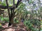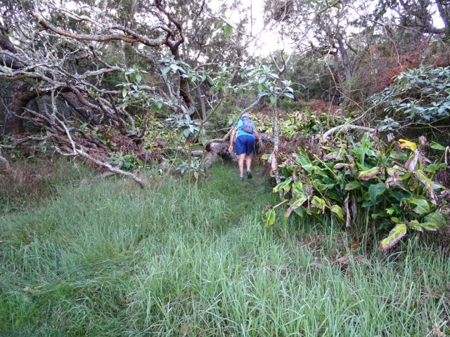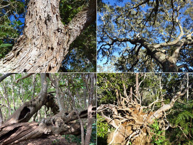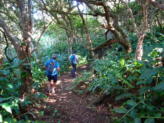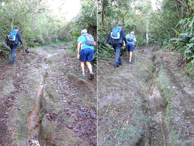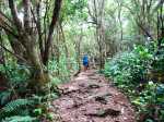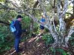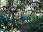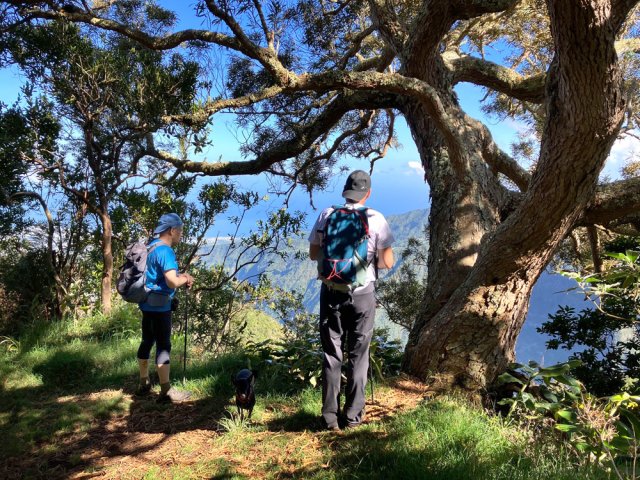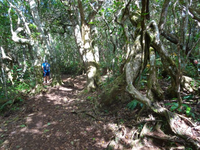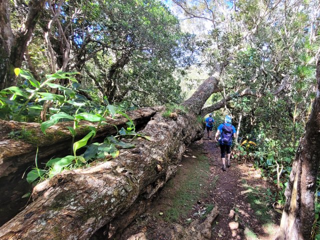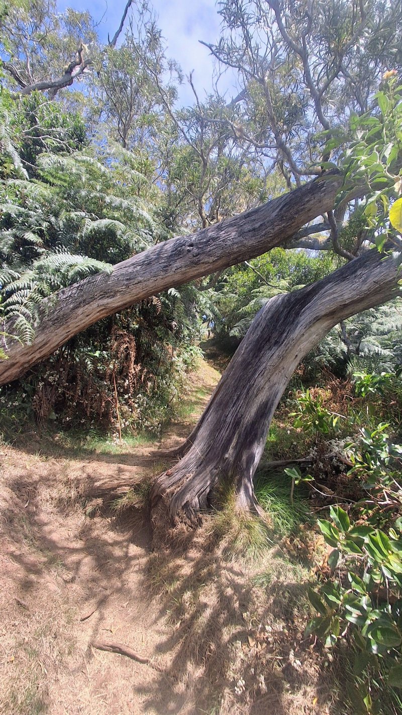 La randonnée débute au parking situé à la fin de la RF des Cryptomerias d'où partent de nombreux circuits vers les forêts, rempart ou Îlet Alcipe. Revenir vers la route du Maïdo pour emprunter l'ancien sentier Lebreton ou le raccourci que l'on peut emprunter dans un virage de la route, en face d'un tamarin esseulé (Photo 1). Les deux premiers kilomètres sont très faciles à décrire : piste en pente régulière, glissante, marquée en deux parties par les milliers de passages de pneus de VTT (Photo 2). Les 300 m de montée s'effectuent en cherchant toujours le meilleur passage le moins glissant. Les abords du large passage sont couverts de longoses et parfois de vigne marronne. Les derniers hectomètres sont plus agréables avec un sol moins creusé et recouvert d'herbe rase (Photo 3). On parvient en moins de 40 minutes à des travaux pour la construction d'une réserve d'eau. La fin de la route Oméga, d'ordinaire agréable, est désormais bordée de tous les monticules de terre ayant permis le creusement de la réserve. En quelques mois, ces talus artificiels seront heureusement recouverts de verdure. Dans le premier lacet rencontré, à la fin du Sentier de Cambour, chercher à quelques pas du panneau de l'ONF la trace discrète remontant vers l'est dans les longoses et bringeliers (Photo 4). La sente est peu fréquentée mais se perd difficilement des yeux malgré quelques fougères (Photo 5). La pente y est parfois forte mais il en est ainsi des sentiers de raccourci qui font gagner des hectomètres mais peuvent faire monter le palpitant (Photo 6). Le parcours s'éloigne d'une petite ravine profonde et arrive bientôt au lacet suivant de la route forestière. L'emprunter sur 200 m et repérer, à deux pas du poteau du Parc National, le nouveau sentier en direction du rempart qui pénètre sous les tamarins des hauts (Photo 7). Il est plus large, plus facile, moins envahi que le précédent et accueille de beaux arbres (Photo 8). Il se termine au sentier du Rempart de Mafate en direction du Maïdo ou de l'Îlet Alcipe, à une vingtaine de mètres du rempart. La végétation cache les points de vue sur le cirque. Partir à gauche sur ce très agréable sentier bordé de tamarins (Photo 9). Il se rapproche du vide pour de premières vues en direction du Grand Bénare (Photo 10). Il n'est pas totalement plat et effectue parfois des montées et descentes sans grande difficulté à travers une végétation constituée essentiellement de tamarins (Photo 11). Beaucoup ont souffert du passage de Batsirai en 2022 mais rares sont ceux qui ne survivront pas (Photo 12). Le sentier se poursuit dans les herbes et sous les tamarins à quelques mètres du vide (Photo 13). Les points de vue se multiplient sur l'ensemble du cirque pour des panoramas n'ayant rien à envier à ceux du Piton des Orangers ou du Maïdo (Photo 14). On domine les trois îlets des Orangers qu'on peut observer à loisir. Puis le sentier s'éloigne petit à petit du bord et pénètre dans la Réserve Biologique des Hauts de Bois de Nèfles. C'est une réserve biologique dont le but n'est pas de préserver les longoses qui recouvrent la totalité du sol (Photo 15). Heureusement, on rencontre à tout instant de magnifiques arbres méritant le respect et même une halte (Photo 16). La marche est toujours aisée, en légère descente (Photo 18). On bénéficie de nouveaux panoramas en direction du Cap Noir, de Dos d'Ane et de la côte près d'un majestueux tamarin (Photo 19). Le sentier domine le plateau de l'Îlet Alcipe. On distingue très bien l'emplacement de l'îlet envahi par la végétation et tous les pitons alentour (Photo 20). Prendre à gauche le sentier de Cambour, également fréquenté et en très bon état (Photo 21). Il effectue constamment des montées et descentes qui ne suffisent pas à couper les jambes (Photo 22). Délaisser ce sentier pour partir à la première bifurcation vers la RF des Cryptomerias. Le sentier est identique au précédent, peut-être un peu plus envahi de racines. On ne tarde pas à frôler le Roi des Tamarins qui, malgré une branche cassée, résiste plus facilement aux cyclones que ses congénères en bord de rempart (Photo 23). Le sentier, large et propre, passe au milieu de superbes bois de couleurs (Photo 24). Aucun espace n'est délaissé par les longoses qu'on ne quittera plus jusqu'au véhicule (Photo 25). Il faut encore franchir de nombreuses ravines plus ou moins encaissées pour de nouvelles montées et descentes. Certaines ont le fond plus rocheux que d'autres et peuvent même être glissantes (Photo 26). Après avoir franchi la plus importante d'entre elles, la Ravine la Plaine, la descente se poursuit avec les mêmes paysages de beaux arbres et de longoses (Photo 27). On ne tarde pas à rejoindre une table de pique-nique et le départ de nouveaux sentiers à la fin de la Route Forestière des Cryptomerias. Poursuivre à gauche sous les grands conifères puis rejoindre le rond-point servant de parking, fin de cette boucle de 10 km (Photo 28).