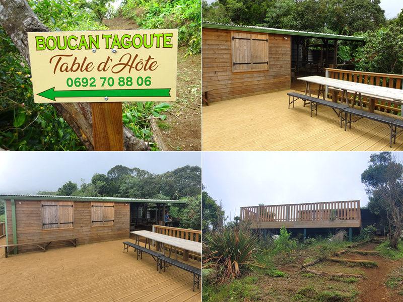 A 1200 m d'altitude, entre le Bois de Sans Souci et les anciens champs cultivés de la région des Boucans, s'est installée la table d'hôte Boucan Tagoute. Située à moins de 100 m du sentier emprunté en descente, l'emplacement est très facile à trouver. Un autre sentier se rencontre en venant de Sans-Souci. En prenant la peine de réserver, on peut déjeuner sur place lors d'une randonnée pour une vingtaine d'euros. Pour moins de 50 euros, il est possible d'y passer la nuit. Plusieurs emplacements de tentes sont aménagés à quelques mètres du bâtiment principal. Une belle manière de varier les pauses casse croûte lors d'une randonnée dans les Hauts de Sans Souci ou de dormir au calme en chambre ou sous toile. Réservation obligatoire au 06 92 70 88 06 ou 06 92 70 50 54.