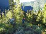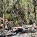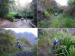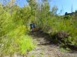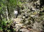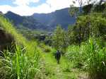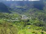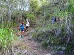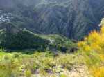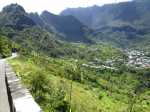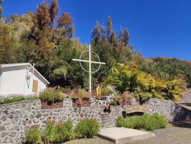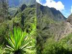 Deuxième boucle : Elle débute à la sortie du tunnel de Peter Both en direction de Saint-Louis. On reconnaît la petite route ayant mené au départ du précédent sentier. Quelques mètres plus loin, un autre sentier remonte sur la droite après un pont sur la ravine canalisée. Le village de Peter Both est plus grand qu'il n'y paraît quand on roule sur la route. Entamer la remontée de ce premier sentier suivi d'un autre et emprunter ensuite une petite route redescendant à travers les jardins fleuris ou quelques cultures pour se rapprocher de la chapelle (Photo 17). Une fois la visite terminée, rejoindre la nationale et entamer la descente vers le Rocher en profitant de belles vues sur les pitons visités il y a une heure (Photo 18). Après le Rocher, son arrêt de bus et son oratoire, poursuivre jusqu'au départ du sentier. Il plonge vers le Petit Bras de Cilaos par quelques lacets et beaucoup de marches. Les filaos ne sont guère plus hauts que vers le Piton Papangues et procurent peu d'ombre (Photo 19). La descente est rapide jusqu'à une case sur la gauche gardée par un chien bruyant. Puis les hautes marches en pierre et les lacets se multiplient (Photo 20). Le sentier oblique à gauche et devient plus plat jusqu'au croisement avec celui de l'Îlet Haute. De nombreux manguiers bordent le passage. Certains sont couverts de fruits qui tombent au sol par dizaines (Photo 21). On frôle l'ancien Îlet de Petit Bras où quelques cases sont encore visibles dans une végétation qui gagnera très vite l'invasion. Il se rapproche doucement du bras qu'on entend couler depuis le sentier en corniche (Photo 22). La jonction avec le torrent est rapide. Quelques bassins et petites chutes incitent à la pause sous les filaos qui ont bien grandi depuis le départ. Le sentier longe encore le cours d'eau pour quelques temps (Photo 23). Très vite, il s'en éloigne et la pente devient de plus en plus forte sur d'importants pierriers (Photo 24). Un nouveau sentier escarpé et technique a remplacé celui emporté par des éboulis récurrents dans cette zone. On s'approche à nouveau du bras avant de le quitter très vite par de nouvelles fortes pentes offrant sur la région des paysages sauvages (Photo 25). On parvient en fin de montée à d'anciennes vignes repérables aux centaines de poteaux restés en terre. Il n'y a plus de vigne et les champs ont été également abandonnés malgré la fertilité du sol. On termine en légère descente en direction de Palmiste Rouge qu'on devine de plus en plus souvent à travers les hautes herbes (Photo 26). Le sentier Fougères prend fin à la rue du même nom entre des murs bordant les cases. Il faut désormais repartir sur la gauche et rejoindre le tunnel en remontant la rude pente de la RD240 car aucun raccourci n'a été créé dans cette région. La circulation est assez faible et les beaux paysages font oublier le goudron (Photo 27). Un dernier coup d'œil sur Palmiste Rouge et on atteint le grand parking à l'entrée du tunnel (Photo 28).