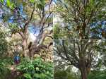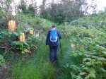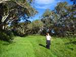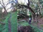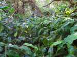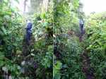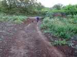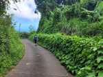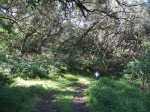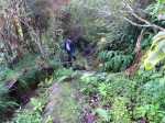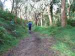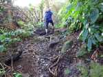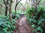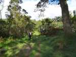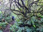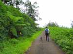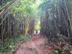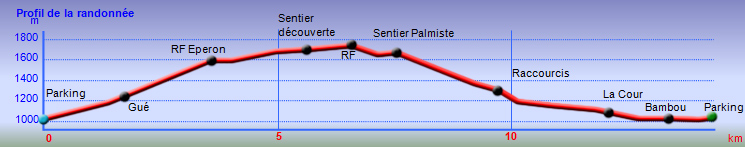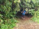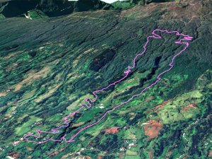La randonnée débute à la toute fin de la Route Vaudeville barrée de grosses roches à deux pas de la Ravine Bernica. Un emplacement de stationnement se trouve sur la droite en arrivant, juste au début du sentier déjà très envahi par les branches. Pour s'épargner deux cents mètres de griffures, marcher vers la ravine et ses bambous qu'on retrouvera en fin de boucle. Emprunter la piste débutant à droite par une montée pouvant être glissante (Photo 1). Elle passe entre la Ravine Bernica et le Fond Maunier en offrant quelques points de vue sur les prairies. A la fin de la piste, ne pas poursuivre mais obliquer légèrement sur la droite sur un passage peu marqué ou abîmé par les roues des engins (Photo 2). On parvient donc sur le sentier laissé au parking. La trace est impossible à perdre mais il faut déjà faire attention aux longues tiges de vigne marronne (Photo 3). Très vite, la liste des invasives augmente et il est impossible de les éviter (Photo 4). Le coupe-coupe a vite fait de sortir du sac pour élargir un peu le passage à moins qu'un chasseur de tangues ou de guêpes ne soit passé quelques jours auparavant. Compter 15 minutes inoubliables faisant perdre d'un coup 3 cœurs à cette boucle ! Puis le sentier devient plus propre et les outils peuvent retrouver leur place (Photo 5). Les portions glissantes avec ornières profondes créées par des années de pneus se multiplient. Le sentier reprend un aspect normal avec ses racines, ses pierres moussues et ses parties boueuses par endroits (Photo 6). Après 30 minutes de montée constante, on parvient à une tuyauterie longeant plus ou moins le sentier (Photo 7). Les invasives ont disparu, excepté les longoses, et les bois de couleurs se multiplient (Photo 8). On domine la Ravine Bernica qui semble difficile à atteindre car la pente est forte et le terrain glissant. Quelques coups de rein sont nécessaires pour franchir les obstacles du terrain parfois rocheux (Photo 9). A 1500 m, le sentier franchit un petit affluent de la Ravine Bernica puis pénètre doucement dans une forêt de plus en plus belle de tamarins envahie de longoses cachant à nouveau le passage sans l'obstruer (Photo 10). Puis les fougères remplacent les longoses sous les magnifiques troncs de tamarins (Photo 11). C'est dans ce paysage dominé par les grands arbres que se termine la montée sur le sentier. Il finit à la Piste Forestière de l'Eperon, totalement recouverte d'herbe très pratique pour nettoyer les chaussures de la boue accumulée (Photo 12). Elle coupe la Ravine Bernica, très modeste à cette altitude, près de petits bassins d'eau sombre. Très vite, on se retrouve sur la Piste Forestière des Palmistes. En prenant à gauche, il est possible de terminer plus rapidement la boucle. Cette fiche propose de partir sur la droite et de poursuivre sur ce large chemin empierré sous les tamarins (Photo 13). A l'approche du sentier de découverte de la Tamarinaie , partir à gauche sur la Piste Forestière du Bernica puis marcher 150 m jusqu'au discret sentier envahi de branles verts permettant d'accéder au parcours touristique (Photo 14). On croit se retrouver au début de la boucle mais aucune plante ne vient griffer sur cette très courte distance. La boucle a perdu tous ses panneaux explicatifs mais le sentier fréquenté est toujours de bonne qualité (Photo 15). Emprunter le parcours officiel qui longe la route pendant un moment puis marcher sur le goudron pendant 100 m. Traverser la Ravine de la Pompe et entamer la longue descente sur un sentier emprunté par les vététistes. Aucune difficulté pour le suivre et surtout aucune invasive ne vient troubler la marche (Photo 16). Ce sentier se termine à la PF du Bernica qu'on emprunte à droite jusqu'au prochain départ de sentier vers l'ouest. Il débute par une longue portion dans les herbes sous les derniers tamarins (Photo 17) et se poursuit sur une magnifique portion dans les bois de couleurs dominés par d'imposants pieds de tans rouges sans doute centenaires (Photo 18). Cette partie, très empruntée par les vététistes est lisse et glissante. Il faut prendre garde aux glissades possibles dans les tronçons les plus pentus (Photo 19). On retrouve la PF des Palmistes qu'il faut suivre de temps à autres (Photo 20). Les lacets se multiplient tout comme les raccourcis faciles à trouver (Photo 21). On retrouve la végétation identique à la montée de l'autre côté de la vallée de la Ravine Bernica. La marche est facile sur des sentiers bien marqués. Les points de vue sont toujours aussi rares sur l'océan et les prairies (Photo 22). Plus bas, les derniers raccourcis traversent des cryptomerias où l'on retrouve les passages sur racines mises à nu par les pneus (Photo 23). Débute alors un assez long parcours sur la petite route des Calumets à longer à nouveau galaberts et invasives (Photo 24). La pente est faible, la route étroite avec de longs lacets, la campagne est verdoyante et les vastes prairies abritent quelques troupeaux. Un premier hameau bordé de très hauts eucalyptus se traverse en admirant les fleurs plantées le long des habitations et en longeant de longues treilles de chouchous bordées de hauts bambous (Photo 25). Vient ensuite le hameau de Bambou où est installée la bambusaie d'un collectionneur. Si rendez-vous a été pris, il est possible d'y effectuer une visite pour moins de 10 euros. Poursuivre sur le Chemin des Calumets et repérer, à quelques mètres du Chemin de Savannah, une trouée dans les bambous (Photo 26). Suivre le large sentier glissant, à l'ombre de plusieurs espèces de bambous (Photo 27). Il passe près de l'ancienne distillerie de géranium avant de se terminer au premier mètre de la Route Vaudeville, au gué sur la Ravine Bernica. Un grand bassin sur la gauche n'invite guère à la baignade mais peut impressionner par la taille (Photo 28). Un étroit sentier en rive gauche permet de remonter la ravine vers la petite casca