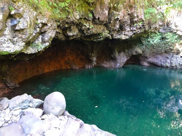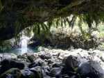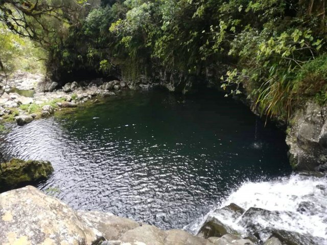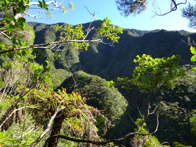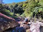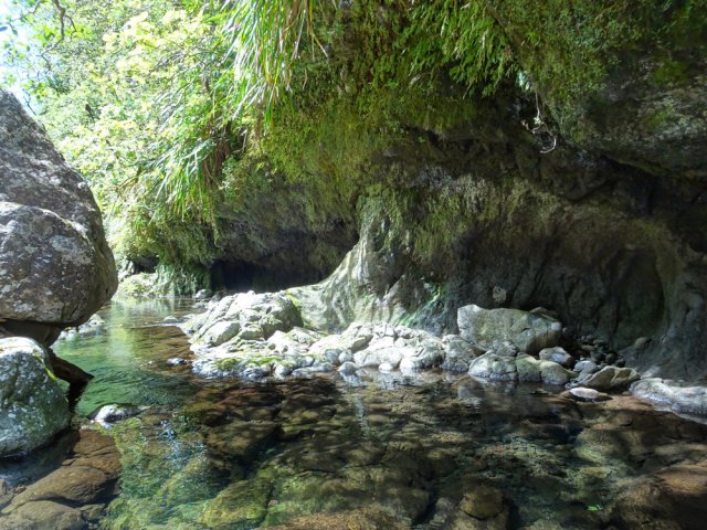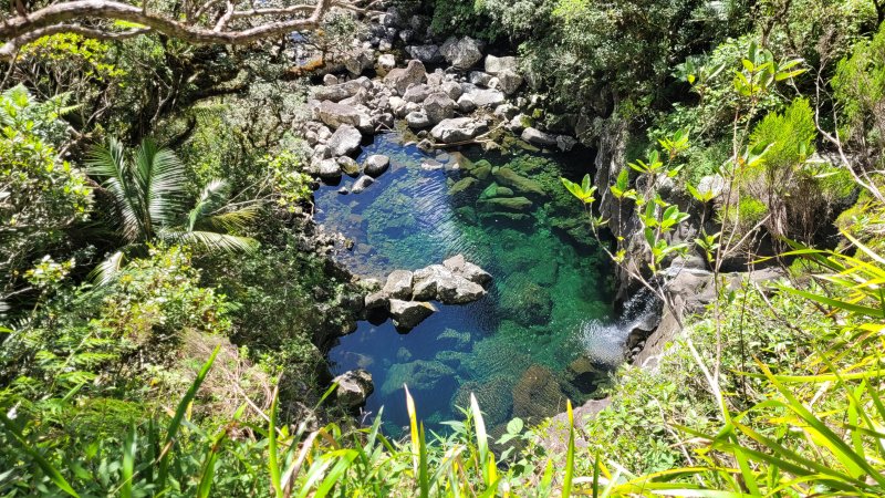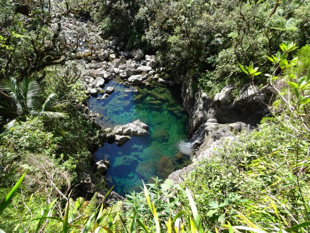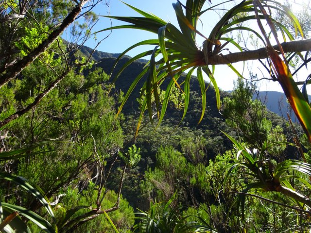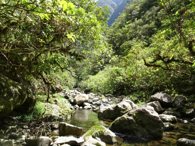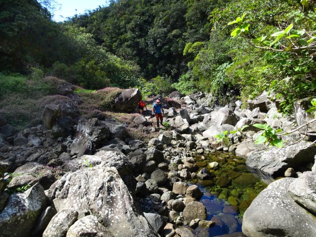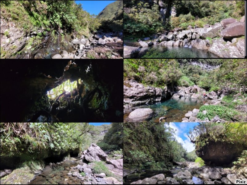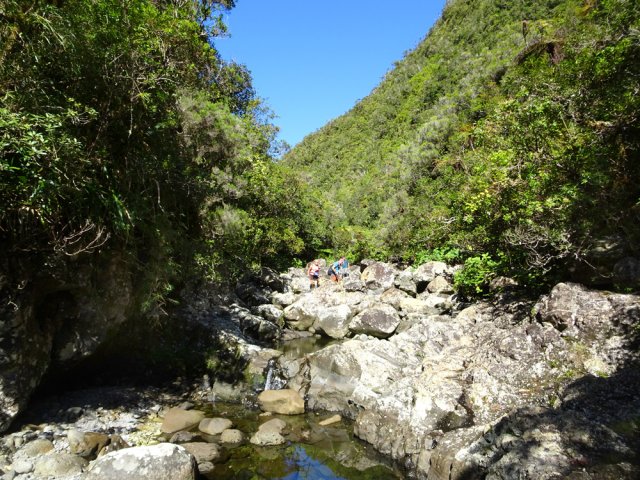 La randonnée débute sur la route de Bélouve, à l'emplacement de parking juste avant la Piste Forestière de Takamaka. Comme elle est fermée d'une barrière, il faut donc entreprendre la longue descente prenant environ 45 minutes. Ce sera un peu plus long au retour en raison de la pente. Aucune difficulté pour suivre ce large chemin au milieu de la forêt de Bébour, riche en espèces végétales. Le cheminement alterne parties plates avec bandes de roulement, portions bétonnées et d'autres où subsistent quelques ornières (Photo 1). Plus on descend et plus on s'approche du Plateau du Mazerin qui domine toute la région (Photo 2). Les bois de couleurs sont envahis de hauts fanjans plus ou moins rabougris en fonction de la saison. A la rencontre du sentier de Takamaka, ne pas hésiter à pousser un peu d'une centaine de mètres jusqu'aux installations du téléphérique desservant le barrage situé au fond de la vallée de la Rivière des Marsouins. Un coup d'œil sur la vallée permet de l'apercevoir ainsi que le Plateau Duvernay de l'autre côté (Photo 3). Remonter un peu et partir vers Takamaka par le sentier de droite. Le poteau de l'ONF confirme la destination. Prendre à gauche pour suivre l'étroit mais agréable sentier de Takamaka (Photo 4). Attention, ce sentier n'est emprunté que sur une centaine de mètres. Repérer, sur la droite, un départ de sentier beaucoup plus étroit que le précédent. Il reste cependant visible et se suit facilement jusqu'à la Ravine Misère qu'on a repérée à droite avant de tourner puis de descendre (Photo 5). La ravine se traverse aisément en repartant de quelques mètres vers l'amont. Le fond est constitué de cavités très agréables si elles sont en eau. On devine sur la droite un grand bassin qu'il est possible d'approcher. La partie sportive débute à la Ravine Misère. Le sentier permettant de quitter le lit grimpe, quasi verticalement, à travers la végétation. Des arbres abattus, humides, très glissants sont les seuls moyens de se retenir et l'obstacle coupe un peu le souffle (Photo 6). La suite de la traversée jusqu'au rempart comportera encore quelques pentes mais plus faibles et très courtes (Photo 7). Plusieurs embranchements, plus ou moins marqués, peuvent désorienter ou poser questionnement. Le GPS s'avère donc utile à moins d'avoir un bon sens de l'orientation et deviner la direction du rempart. La végétation est très fournie en bois de toutes espèces, difficiles à reconnaître en raison de la mousse épaisse recouvrant les troncs. Le cheminement est rarement droit puisqu'il faut slalomer entre les arbres vivants ou couchés, fanjans, pimpins ou palmistes au tronc piquant (Photo 8). Compter près de 45 minutes pour effectuer ce petit kilomètre inoubliable par sa végétation. L'apparition de la lumière indique qu'on vient d'atteindre le bord du rempart, au seul endroit prévu pour le descendre (Photo 9). La partie plate est terminée et les mains peuvent sortir des poches. La plongée est immédiate dans les pailles sabres sur une trace à peine visible. Les points de vue sur la vallée qu'on cherche à atteindre sont rares entre les branches de mapous, bois de tambour ou magnifiques tans rouges (Photo 10). La pente et la qualité du sol empêchent d'ailleurs de s'intéresser aux panoramas. Il faut constamment chercher la racine, la branche ou la marche pour s'assurer dans une pente frisant souvent les 80° (Photo 11). Heureusement, cette descente est très courte et l'on peut, 10 minutes plus tard, rincer les chaussures dans le Bras Patience dans un premier petit bassin. Partir vers l'aval pour la visite du tronçon le plus court mais le plus riche en curiosités (Photo 12). La marche ne surprendra pas les habitués des fonds de ravines. L'absence de cyclone laisse le fond recouvert de renouées teignant en rose tout le fond du cours d'eau (Photo 13). Le sol peut être couvert de cailloux, de rochers ou de plaques basaltiques usées par les crues (Photo 14). Difficile à repérer derrière un éperon rocheux en rive droite, une modeste arche minérale peut s'atteindre rapidement. A quelques dizaines de mètres en aval, un profond bassin d'eau paraissant sombre barre le passage (Photo 15). Ne pas quitter le lieu sans voir les superbes grottes en rive droite. Elles dominent le bassin mais se visitent sans danger (Photo 16). Repérer en rive gauche, quelques mètres en amont, le sentier des pêcheurs permettant d'atteindre le bassin sans grands efforts. D'ici, il paraît beaucoup moins sombre. On en distingue le fond plusieurs mètres sous la surface de l'eau aux tons turquoise (Photo 17). Une nouvelle grotte très vaste au plafond couvert de fougères peut donner l'occasion d'une halte ombragée (Photo 18). Quitter ce lieu magique et sauvage pour poursuivre jusqu'à une nouvelle cascade. Impossible de poursuivre après le gros rocher qui domine un vaste bassin 20 m plus bas (Photo 19). Ce bassin, en forme de cœur, présente lui aussi une eau claire et transparente (Photo 20). Pour se baigner, il faut avoir emporté 50 m de corde, mais ce n'est plus alors de la randonnée !!! Reprendre donc le chemin inverse en remontant à travers roches et renouées fleuries (Photo 21). Le lit ne varie guère. On retrouve les roches plus ou moins imposantes et les gros galets pouvant être instables ou humides (Photo 22). Un nouveau bassin d'eau claire apparaît dans la montée. Pour atteindre la petite cascade qui l'alimente, partir à nouveau en rive gauche à travers la végétation touffue sur une modeste trace (Photo 23). La baignade y est possible sans danger si l'eau n'est pas trop fraîche. Plus haut, ce sont de très courtes portions de petits canyons, de grosses roches à contourner, de restes de falaises dans le lit ou de jolies petites grottes creusées dans la rive par les courants (Photo 24). En fonction de la lumière, il y a moyen de régaler les amateurs de photos naturalistes (Photo 25). Les bassins