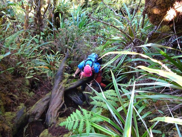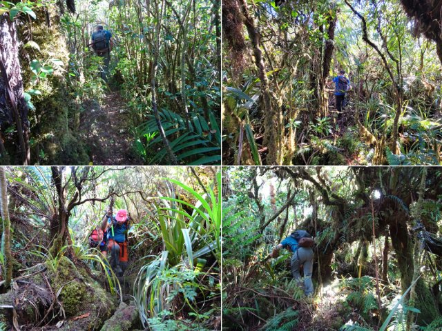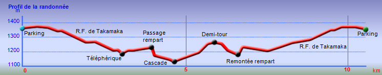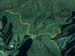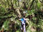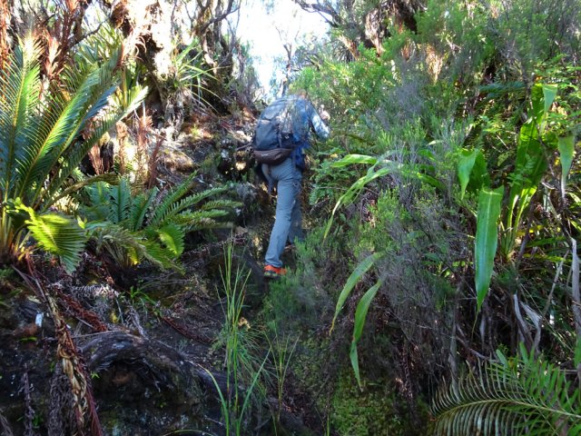 Le plat sur la RF Takamaka, une piste assez lisible en bifurquant en hors sentier sur la droite, puis une vegetation de plus en plus dense et c’est surtout un peu avant d’arriver au rempart qu’il faut scrupulement suivre la trace gps car il y a des gros caros de vignes marronnes impossible a franchir.