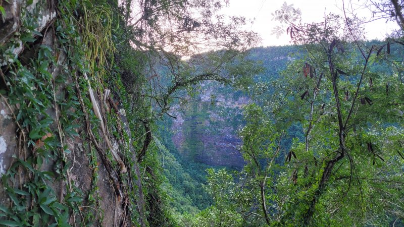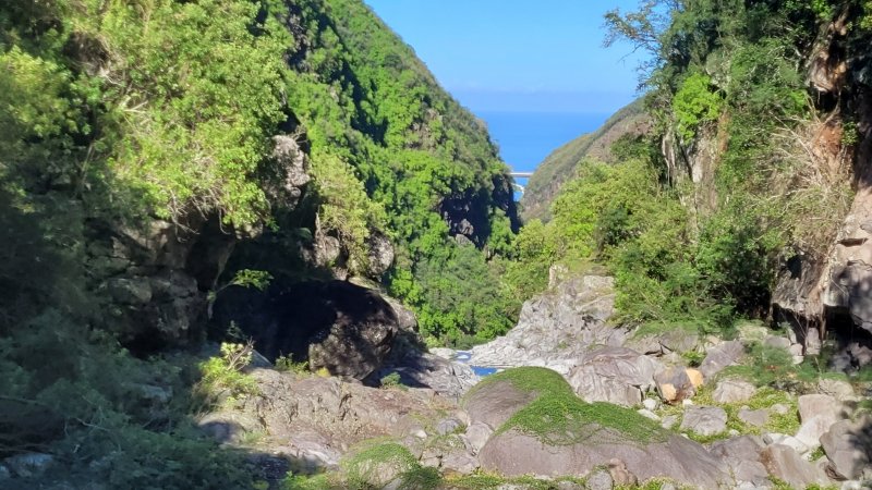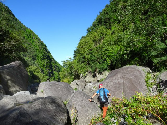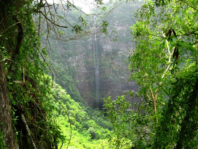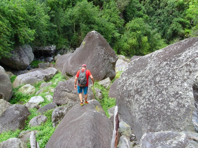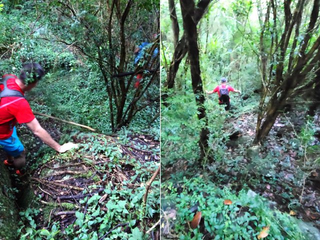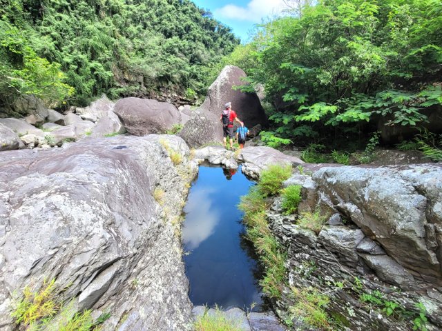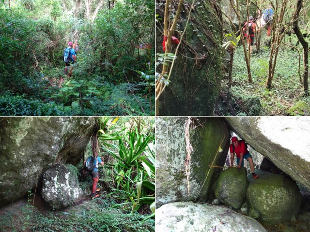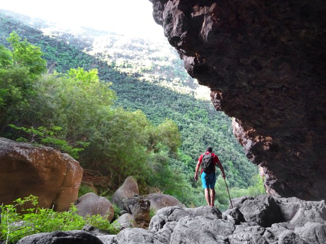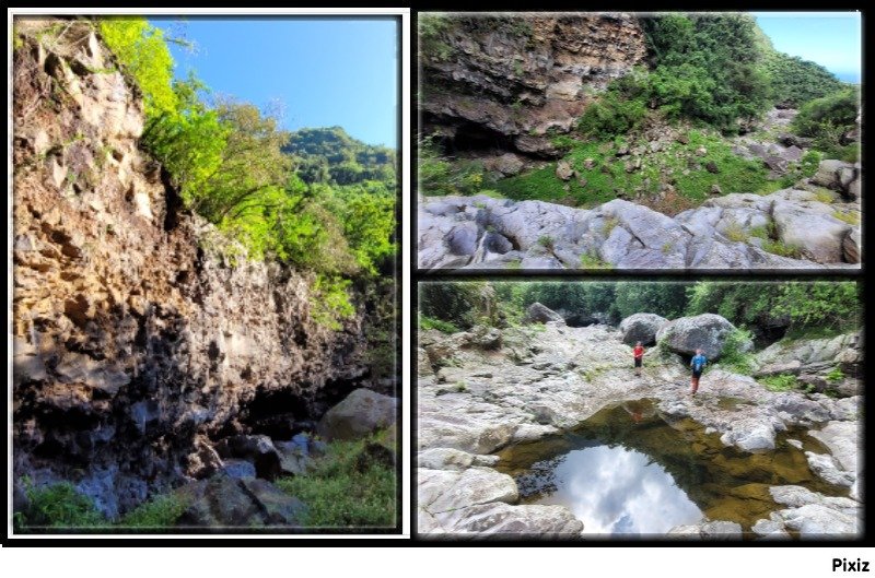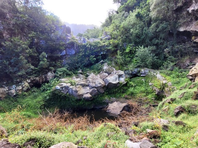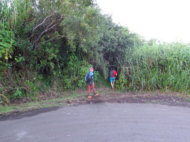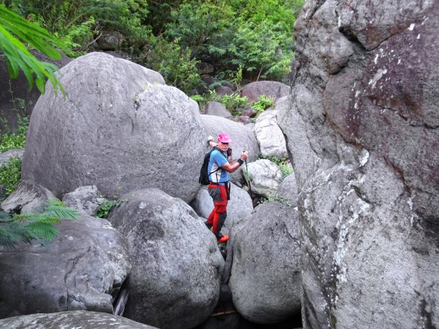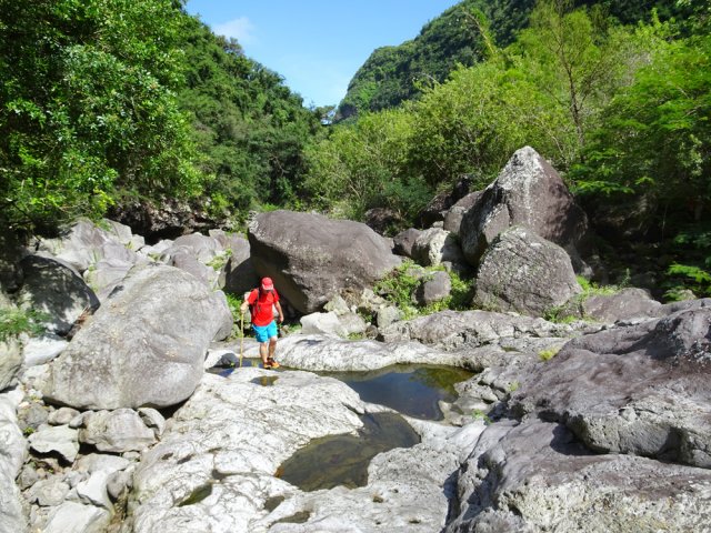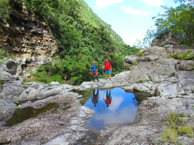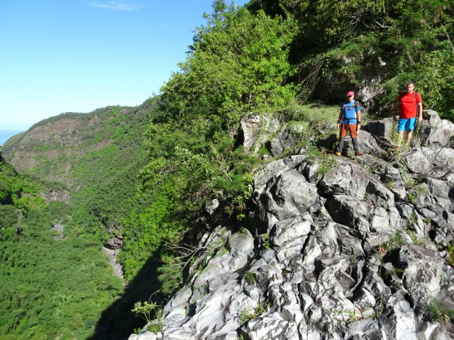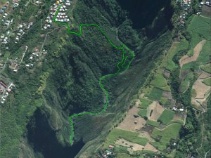 La randonnée débute ici dans la forte montée de la Rue du Père Colineau. Un emplacement sommaire se trouve pourtant à deux mètres du début du sentier mais les véhicules en stationnement peuvent gêner les gros camions lorsqu'ils prennent le lacet serré de la route. Une fois la descente sur route effectuée, trouver dans ce virage le départ discret du sentier dans les faux poivriers et hautes herbes (Photo 1). Les 20 premiers mètres longent le rempart dans les détritus. Prendre le premier sentier rencontré à gauche puis entamer la descente dans une végétation assez fournie (Photo 2). La plongée est immédiate. Elle réclame déjà toute l'attention du marcheur. Un rocher sur la gauche permet des points de vue sur la vallée et sur la cascade du côté de Trois Bassins (Photo 3). Attention, une seule personne à la fois pour éviter la chute ou ne pas précipiter la roche vers le bas. Les répits sont très rares et ne dépassent pas les 10 m. Le sentier longe à un moment une barre rocheuse. La pente est tantôt rocheuse, tantôt terreuse et il faut constamment chercher la branche qui va ralentir la descente (Photo 4). Des pierriers instables et des éboulis ralentissent un peu la progression par moments surtout s'ils ont emporté des arbres au passage (Photo 5). Après deux tiers à dévaler cette pente, on parvient dans les zones recouvertes de lianes griffes de chat. Si l'aspect visuel peut être agréable, il faut surtout regarder où poser ses semelles car les tiges sont très solides et ne lâchent pas la chaussure (Photo 6). Après la nième forte descente, le sentier passe près d'un gros rocher qu'il est préférable d'éviter en partant à gauche. On se retrouve sur une berge haute très plate et les premiers blocs du lit sont visibles sur la gauche. Partir à droite en cherchant le meilleur passage entre les arbustes ou rochers recouverts de griffes de chat (Photo 7). Ne pas chercher à aller trop à gauche vers la rivière. Plusieurs itinéraires sont possibles dans ce sous-bois assez clairsemé, par endroits recouvert de longoses (Photo 8). Après 200 m d'aventure sans danger on parvient à la Grande Ravine et ses premiers monstrueux rochers (Photo 9). Partir à droite et, comme toujours, chercher le meilleur passage entre les grosses roches (Photo 10). Certains passages plus techniques imposent quelques acrobaties ou des franchissements de très hautes marches (Photo 11). La distance à parcourir est courte, la pente assez faible mais il faut constamment fournir de gros efforts en raison de ce sol rocheux. Des grottes creusées par le courant durant des siècles peuvent servir d'abri (Photo 12). Quelques hautes falaises en rive droite confirment qu'il vaut mieux avoir rejoint la rivière après 200 m plutôt que de poursuivre dans les bois (Photo 13). On ne quitte jamais les griffes de chat qui grimpent aux rochers tout comme les affouches cherchant à les étouffer. A la saison, les caliandras se remarquent de très loin à leurs interminables étamines rouges (Photo 14). Les blocs érodés alternent avec ceux tombés des falaises, parfois récemment qui se remarquent aux angles de la roche et à la couleur de la pierre. Certains blocs auraient pu faire de belles assises aux piliers de la Nouvelle Route du Littoral (Photo 15) ! Après une heure de descente, un cassé d'une dizaine de mètres se présente. Des marches naturelles se devinent vers la gauche près de petits arbres tortueux. Il est possible de descendre en prenant son temps et en cherchant la meilleure place pour poser les pieds. Une courte sangle dans le sac, attachée à un rocher tout près, peut rassurer (Photo 18). Elle sera inutile au retour. Une fois franchi cet obstacle, on se retrouve pour une courte distance entre les roches couvertes de griffes de chat (Photo 19). 150 m plus loin, la sangle devra être remplacée par une très longue corde car un cassé de près de 100 m met fin à la descente de la ravine. On aperçoit au loin, dans un virage, un court tronçon du pont de la Route des Tamarins (Photo 20). Profiter des vues sur le bassin plus bas, sur la vallée ou sur les grottes dans la falaise puis entreprendre le retour vers le cassé central (Photo 21). On retrouve les mêmes passages délicats, souvent plus difficiles à franchir à la montée qu'en descente (Photo 22). On arrive, longtemps après, près des gros blocs du début de la descente. Les dépasser et marcher vers l'amont de la ravine au fond de plus en plus constitué de basaltes nus abritant des petits bassins peuplés de têtards (Photo 23). Le cassé central, à le voir, pourrait donner l'idée qu'on peut le franchir aisément (Photo 24). C'est sans compter sur la profondeur du bassin et les éboulis instables qui le bordent. Pour le contourner, il faut repartir un peu vers l'aval, marcher en rive droite pour ne pas manquer les chiffons noués aux arbres indiquant le début du sentier de contournement (Photo 25). On retrouve à peu près le même type de cheminement qu'à la descente mais cet itinéraire entièrement balisé de chiffons rouges est plus facile à deviner (Photo 26). Il serpente selon le relief et la végétation, frôle quelques grosses roches et se termine par un petit tunnel de roches empilées à quelques mètres du haut du cassé étudié depuis le bassin. Les bassins décrits lors de la remontée vers Trois Bassins sont toujours là (Photo 27). Le départ du sentier emprunté à l'aller depuis la route n'est qu'à une centaine de mètres qui se parcourent toujours entre les roches de dizaines de tonnes (Photo 28). Là aussi, repérer en rive droite les chiffons, rubalises ou fils électriques indiquant le début de la rude montée. On retrouve l'étroit sentier, les très fortes pentes, les pierriers et les éboulis pour une montée qui durera une heure en raison des jambes fatiguées par les sauts de centaines de roches. La pente de la Rue du Père Colineau peut finir d'épuiser les plus coura