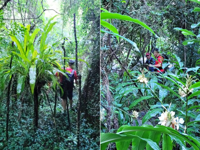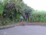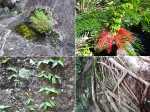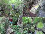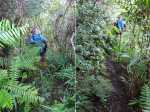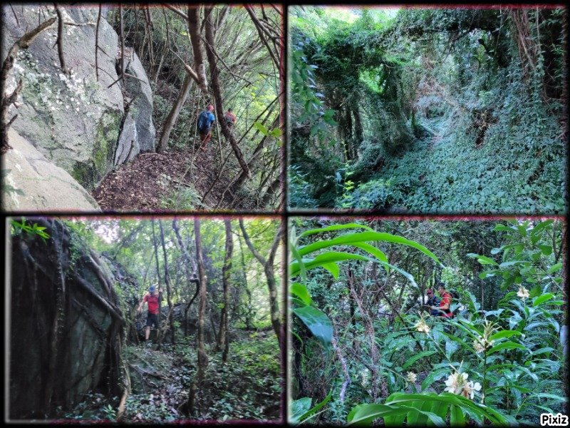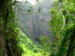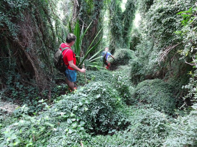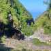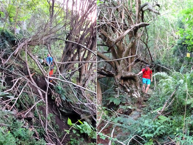 Les amateurs de fortes pentes et de fonds de ravines rocheux prendront certainement cinq heures de leur temps pour terminer cette exploration de la partie aval de la Grande Ravine. En effet, une première randonnée débute à la mer pour rejoindre la première cascade. Une autre, comme celle présentée ici, quitte Trois Bassins pour se rapprocher de la plus haute d'entre elles à deux pas du village. Si la première débute au plus près des vagues, les deux autres empruntent un sentier étroit, glissant et pentu pour franchir les 300 m de dénivelé entre le village et le fond de la ravine. Pratiqué surtout par les canyonistes, il reste bien visible tout au long du parcours. Il doit se pratiquer avec prudence car il ne dépasse guère la largeur d'une semelle par endroits et le vide est toujours proche même si la végétation peut rassurer. Près de la moitié de la descente est encombrée de griffes de chat, une liane très longue, extrêmement solide qui ne lâche pas le pied pris dans ses longs tentacules. Autant elle peut être belle lorsqu'elle décore les roches (Photo 19), autant elle recouvre et étouffe la végétation des sous-bois (Photo 6). Elle envahit progressivement les communes de l'Ouest et rien ne semble convainquant pour s'en débarrasser.