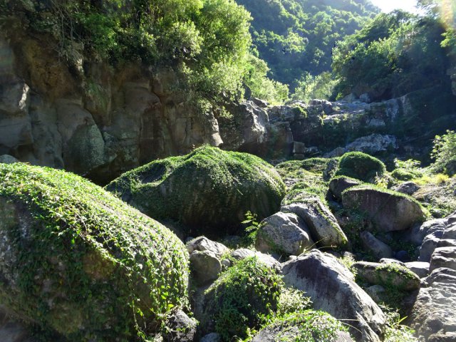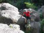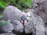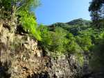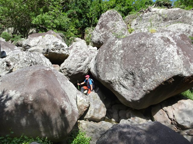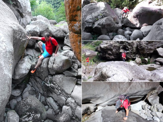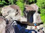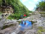 Il y a deux possibilités pour rejoindre la rivière une fois parvenu au bas de la pente. Nous avons effectué la jonction de descente par un hors sentier assez facile dans le sous bois clairsemé. Pour la remontée, il suffit d'emprunter un sentier de contournement du cassé central. Ce dernier est plus facile à trouver et à suivre que le précédent mais il oblige à effectuer deux fois le tronçon entre le sentier et le bas du cassé en cas d'aller-retour par cet itinéraire. A chacun de choisir en fonction de ses habitudes ou de son sens de l'orientation. Une fois le sentier de descente terminé, la tentation est grande de coupler cet itinéraire à la randonnée remontant vers la grande cascade. Prévoir 8 heures et prendre garde à la difficulté des deux circuits demandant une grande habitude des contournements de rochers gros comme des autobus ou des échappatoires de cassés.