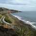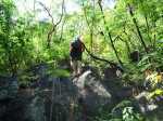 Randonnée pour peu de monde : Au lieu de filer à Saint-Paul à partir de la Ravine Fleurimont, repérer l'échelle qui domine la vallée sur la gauche. Entamer le premier hors sentier dans les roches entourées d'épineux qu'il vaut mieux ne pas utiliser pour se maintenir (Photo 22). Malgré la pente, on se retrouve rapidement au pied d'une très longue échelle fabriquée à l'aide des rails du chemin de fer qui passait à quelques mètres. Elle est longue et semble solide malgré la rouille et un barreau dessoudé. Prendre son temps pour l'ascension qui peut inquiéter si on souffre de vertige (Photo 23). Depuis le rempart rocheux, on a de belles vues sur les Petits Récifs et la route en travaux (Photo 24). De l'autre côté, on se retrouve à la hauteur du rocher peint en blanc qui fait ressortir les contours d'un visage ayant donné son nom au Cap de la Marianne (Photo 25). Les curieux ne voulant voir que l'échelle peuvent également faire demi-tour et rejoindre Saint-Paul. Les autres, plus téméraires ou inconscients, poursuivront assez longuement dans le lit d'une ravine bétonnée destinée à détourner les eaux de la falaise et de la route (Photo 26). Quitter le lit et partir plein est pour retrouver les vestiges de la piste se trouvant là au siècle dernier. Il faut de l'imagination pour la deviner au milieu des hautes herbes, lianes, épineux et zépinards (Photo 27). Le bruit de la RN1 guide les pas jusqu'à l'échangeur de Plateau Caillou. On a sous les yeux le paysage traversé en total hors sentier et, comme on ne peut pas franchir la voie rapide, longer tout simplement la route et la bretelle dans le goulet cimenté la bordant (Photo 28). La demi-boucle est très longue mais sans danger pour parvenir à la station service repérée en arrivant à Plateau Caillou. A la station, traverser la route pour reprendre la piste jusqu'à la croix rencontrée en début de boucle. Terminer par les escaliers du chemin de croix, le fossé longeant les lacets et rejoindre la gare par le même itinéraire ou, comme ici, en empruntant l'Impasse Pied des Rampes pour passer sous la RN.