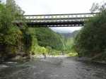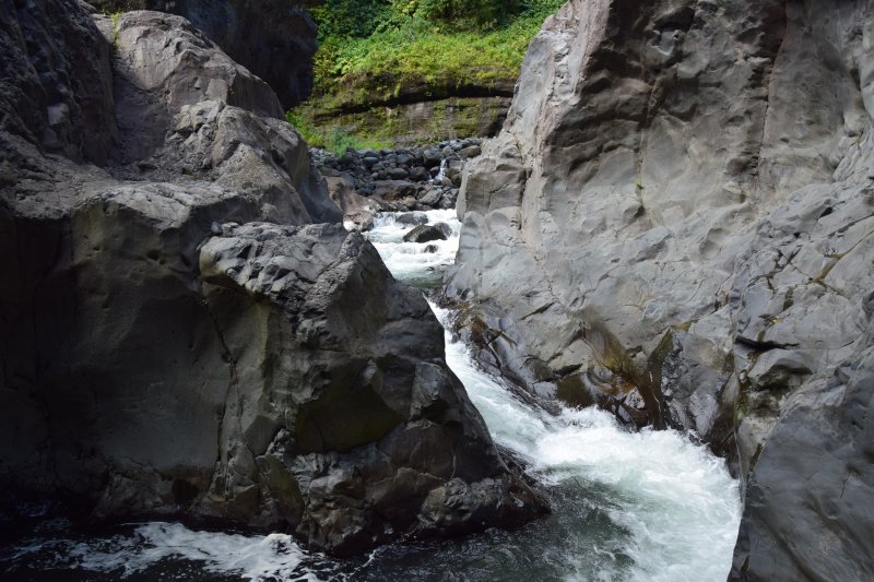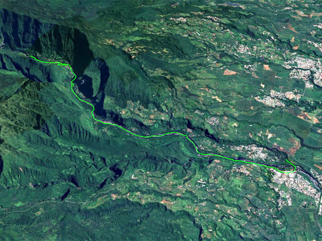 La randonnée débute au Pont de l'Escalier enjambant la Rivière du Mât d'une quinzaine de mètres. La première chose à effectuer avant de se lancer est de regarder le niveau de l'eau. Si les bancs de sable sont visibles et que la puissance de l'eau semble faible, il est possible de poursuivre (Photo 1). Dans le cas contraire, préférer une visite à la Cascade Blanche. Passer devant la sculpture et la chapelle puis marcher en direction de Salazie jusqu'au poteau électrique et au panneau sur les risques d'éboulis. Le sentier débute exactement entre les deux, dévale de manière abrupte par endroits au milieu des longoses et se termine en deux minutes le long des gros galets du lit de la rivière (Photo 2). Entamer la remontée en longeant les berges facilement. On passe devant un kiosque et un long escalier grimpant vers une habitation. Le fleuve est large, calme, très peu encombré de grosses roches. De nombreuses petites cascades tombent des falaises en rive gauche (Photo 3). D'autres surgissent directement du hameau de l'Escalier dominant la rivière (Photo 4). Remarquer au passage la belle falaise en rive droite où les jamrosats maintiennent les rochers au-dessus du vide. Plus haut, la vallée se rétrécit et comporte de jolies zones rocheuses usées par les crues (Photo 5). De nouvelles petites chutes d'eau et sources amplifient le courant qui peut être fort par endroits (Photo 6). On pénètre enfin dans un beau canyon très étroit où l'eau coule paisiblement. Le niveau est très variable selon l'épaisseur du sable qui en tapisse le fond (Photo 7). Prendre tout son temps pour choisir les meilleurs passages où la hauteur d'eau est la plus faible. On parvient à une nouvelle petite cascade tombant dans un minuscule bassin basaltique (Photo 8). Sur la gauche, le torrent devenu très étroit, charrie une eau trop fougueuse pour envisager de poursuivre sans danger. Faire demi-tour, reprendre le chemin inverse, marcher sur les berges et retrouver la falaise aux jamrosats (Photo 9). Le temps de monter, de faire demi-tour et de revenir aux modestes cascades rencontrées à l'aller, le soleil s'est élevé et éclaire les voiles de mariées tombant de la falaise (Photo 10). Spectacle garanti et douche possible en période chaude (Photo 11) ! On frôle à nouveau le kiosque, le sentier pris en descente et la marche se poursuit jusqu'au nouveau canyon creusé de toutes parts de grottes plus ou moins vastes (Photo 12). On parvient très rapidement au pont qui a permis d'évaluer le courant en début de parcours. Par temps humide, éviter de trop marcher en rive droite constituée d'amoncèlements de couches sédimentaires ne demandant qu'à dégringoler dans l'eau (Photo 13). Plus bas, à la verticale de la route, là où les véhicules ralentissent sous les éclaboussures du "pisse en l'air", la rivière fait un coude creusé par l'eau (Photo 15). On se retrouve ensuite à traverser le Bras de Caverne qui finit sa course à travers de grosses roches (Photo 16). Cent mètres plus loin, un escalier partant de la berge attire le regard. Il mène à une belle aire de pique-nique visitée pour l'occasion (Photo 17). Attention cependant car cette aire est privée. Depuis la route, elle se rejoint à partir d'un snack installé près d'un portail fermé. Des chiens gardent cette aire et il est plus prudent de rester à la première table rencontrée au plus près de la rivière. La descente se poursuit de manière très agréable dans une eau claire, une large vallée et en profitant des superbes vues sur les pitons environnants (Photo 18). Ne pas manquer les deux nouvelles chutes signant la fin de la courte Ravine Gaye ayant pris sa source sur les flancs du Morne des Lianes (Photo 19). La marche est toujours aussi facile sur le sable ou les petits cailloux des berges avec vues nombreuses sur le Piton Bonnet d'Evêque (Photo 20). La vallée se rétrécit au niveau de l'Îlet Payet perché au sommet de la falaise verticale recouverte de bambous nains du plus bel effet (Photo 21). Le fleuve coule dans une vallée de plus en plus large mais encore très agréable (Photo 22). Quelques gros rochers se remarquent mais ils sont rares (Photo 23). Un pont Bailey a été installé dans la partie aval la plus étroite de la vallée pour relier l'îlet à la route de Salazie (Photo 24). Une fois le pont franchi, la vallée, toujours aussi plate, s'élargit à nouveau et se couvre de roches plus grosses ne gênant cependant pas la progression (Photo 25). La rivière effectue un important virage vers la gauche avant de s'enrichir des eaux du Bras des Lianes, très facile à traverser. Les roches deviennent de plus en plus nombreuses et la descente perd de son intérêt ludique (Photo 26). La rivière est si calme par endroits qu'il n'y aurait aucun danger de s'y baigner (Photo 27). La pente s'accentue et quelques rapides peu dangereux par eaux basses amènent au barrage situé au village de la Rivière du Mât les Hauts. A partir d'une petite cascade en rive droite, les incursions des baigneurs venant des berges et du sentier du Bassin de la Mer sont fréquentes. Nous avons choisi d'escalader la petite chute d'eau et de retrouver ce sentier moins de 10 m plus loin (Photo 28). Finis les galets, le sable dans les chaussures et l'eau jusqu'au mollet. La marche en pleine verdure sur un sentier large, bien entretenu, mène sans effort au Parc des Berges. Le pont et le point de départ se rejoignent en quelques minutes.