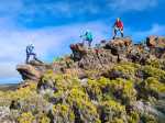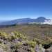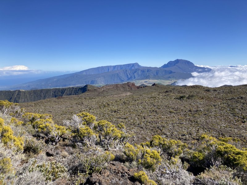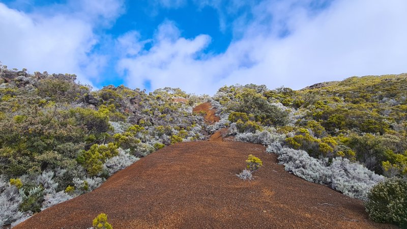 La randonnée débute à l'aire de pique-nique de Bois Ozoux sous des dizaines de petits tamarins. Rejoindre le GRR2 qui remonte vers l'Oratoire Ste-Thérèse. Le sentier, en pente légère, est bien marqué à travers les brandes d'altitude (Photo 1). Marcher jusqu'à la Stèle Josémont Lauret en profitant de magnifiques panoramas sur le Piton des Neiges et vers le Nez de Bœuf. Dix mètres avant le monument vieillissant, obliquer à gauche puis emprunter un étroit sentier remontant en direction du sommet du Piton des Feux de Manzac. Il est emprunté principalement par les fidèles qui viennent prier la petite vierge perchée à 2384 m d'altitude. La croix qui lui tient compagnie et qui orne le sommet n'est visible ni de la route ni sur les cartes (Photo 2). Poursuivre sur l'arête sommitale rocheuse où peu de végétation vient gêner la marche (Photo 3). Redescendre et obliquer à droite pour retrouver pour quelques instants le GRR2 et la piste empierrée menant à la Caverne des Lataniers. La caverne, fouillée par les archéologues en 2017, a retrouvé son aspect habituel et peut abriter plusieurs personnes en cas de pluie. Elle aurait longuement abrité le roi Manzac, sa femme la Reine Fouche, plusieurs marrons au 18ème siècle ainsi que des chasseurs d'esclaves ou premiers explorateurs. Les abords de la caverne auraient même accueilli un abri dont on peut apercevoir quelques traces de murets (Photo 4). Quitter les lieux pour marcher vers l'ouest en direction de collines non marquées sur la carte mais bien visibles sur le terrain (Photo 5). La marche est aisée et respectueuse de la flore si l'on prend soin de contourner les touffes de branles blancs ou verts (Photo 6). La végétation rase de la région permet des panoramas de tous côtés. On domine la Plaine des Cafres, la vallée de la Rivière des Remparts et le Cratère Commerson datant de 60 ap. JC (Photo 7). Se diriger ensuite vers le piton 2390 qui se remarque aux roches empilées au sommet et se rejoint très rapidement à travers de vastes étendues de thym marron (Photo 8). Le chaos rocheux se traverse facilement avant d'entreprendre la jonction avec le piton 2399 (Photo 9). Les grandes étendues de thym permettent une marche rapide totalement à plat (Photo 10). Le bord du cratère comporte des zones rocheuses avec de belles formes minérales (Photo 11). Longer le cercle presque parfait du cratère puis prendre ensuite la direction du Rempart des Basaltes en escaladant ou en évitant le piton 2412 déjà présenté dans une autre boucle hors sentier (Photo 12). Rejoindre la piste puis le sentier menant à l'oratoire Ste-Thérèse et le Piton des Basaltes surmonté d'antennes. Profiter des superbes vues sur le Fond de la Rivière de l'Est et sur le piton éponyme (Photo 13). On peut filer en hors sentier pour rester dans l'esprit de cette boucle ou longer le sentier menant au Piton de l'Eau pour continuer à profiter des paysages sur la droite (Photo 14). Rapidement, trouver un passage facile dans la végétation pour atteindre le piton 2361 que l'on remarque depuis le sentier (Photo 15). La montée rapide est facile. Poursuivre vers l'est en serpentant entre les touffes de diverses brandes. Après un km on se retrouve face à un cône éruptif récent, nu, où des traces de sentiers montrent qu'il est régulièrement visité (Photo 16). Les gratons de la coulée de lave du Petit Cratère sont instables autour de la bouche abritant quelques instruments de l'observatoire du volcan. Après ce cratère, se diriger ensuite vers le Piton Sauvetage qu'on escalade quelques minutes plus tard. Une fois au sommet on domine à nouveau la région et la prairie circulaire occupant le fond de l'ancien cratère (Photo 17). Partir sur la gauche en longeant l'arête du cratère et trouver dans le bas le petit sentier menant à la prairie (Photo 18). Avant de poursuivre, monter un peu dans les branles puis rejoindre la grotte qu'on devine depuis la prairie. Cet abri naturel a sans doute connu la visite de Manzac même si on n'en trouve mention nulle part (Photo 19). Il reste dans la région de nombreux petits cônes éruptifs anciens entre le Piton Sauvetage et la Piste Forestière du Piton de l'Eau (Photo 20). Le premier rencontré est le piton 2276 recouvert de tant de végétation qu'on n'y trouve que très peu de traces de passages des bovins. Son ascension est courte mais intense car il faut se baisser constamment pour passer sous les branches. Il faut même ramper par endroits pour faire passer plus facilement le sac à dos (Photo 21). Cette ascension est facultative pour cette raison même si on y rencontre une grotte originale dans la descente. Le piton 2220 est plus facile d'accès. On chemine dans des branles plus grands que depuis le départ, ponctués par endroits de quelques tamarins (Photo 23). On peut là aussi éviter le piton ou en escalader les flancs en passant toujours sur des zones sableuses sans végétation ou sur des sentiers créés par les petites vaches. La végétation devenant plus dense, filer plein nord pour rejoindre le sentier du Piton de l'Eau. Partir à gauche pour traverser la tamarinaie au pied du Piton Tangues, idéale pour une pause sur la pelouse. Certains arbres, tombés au sol, poursuivent leur croissance dans des positions très biscornues (Photo 24). Il est alors possible de poursuivre par les sentiers jusqu'au Bois Ozoux ou, comme ici, entamer une longue boucle pour atteindre et contourner le piton 2368. C'est parti pour un long périple qui zigzague entre les touffes ou bosquets en cherchant toujours à marcher sur les plaques sableuses (Photo 25). Ces espaces deviennent glissants dans les fortes pentes (Photo 26). Une fois au plus près du sommet il est possible de rejoindre le Piton des Feux de Manzac ou de longer la vallée d'un affluent du Grand Bras Piton. Dans ce cas, le parcours passe près d'un rocher dans lequel on voit deux nouvelles Vierges. Seuls les randonneurs aimant le ho