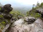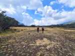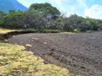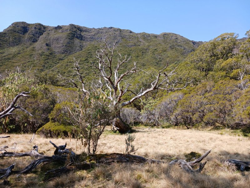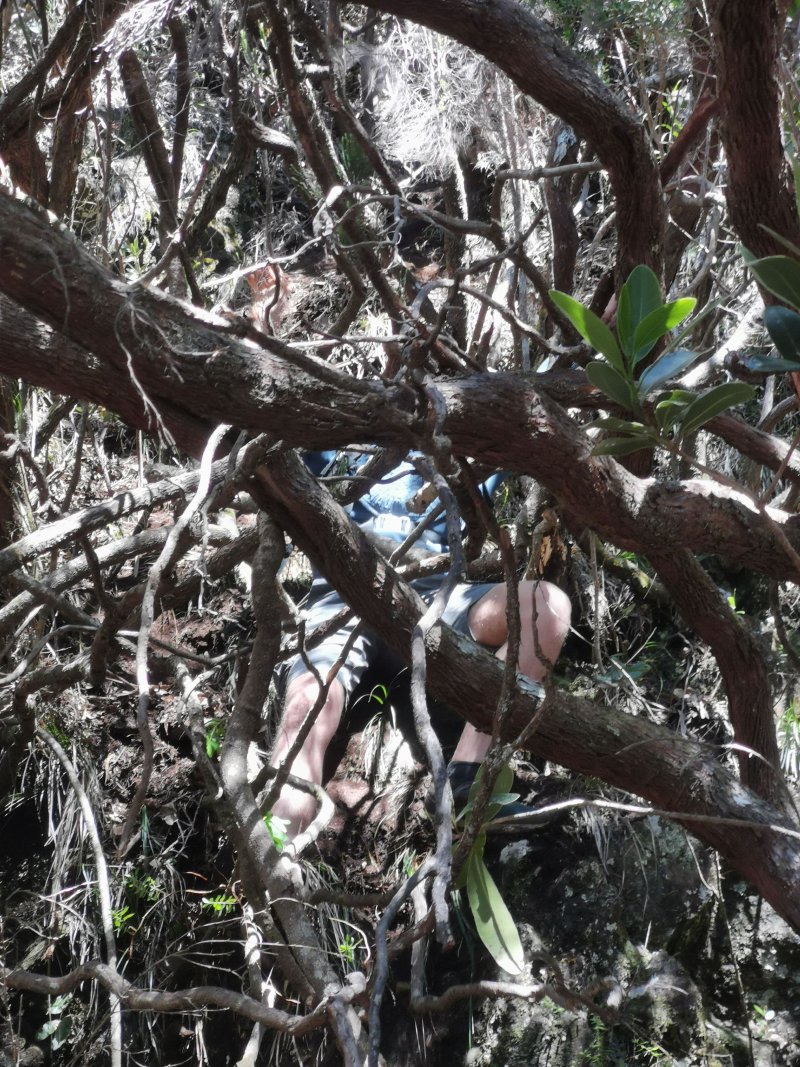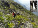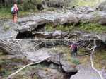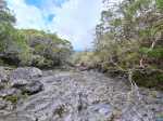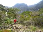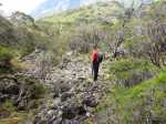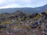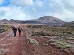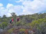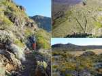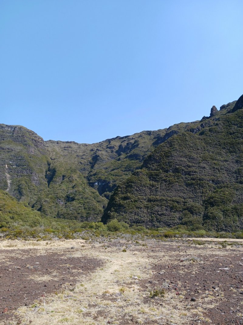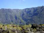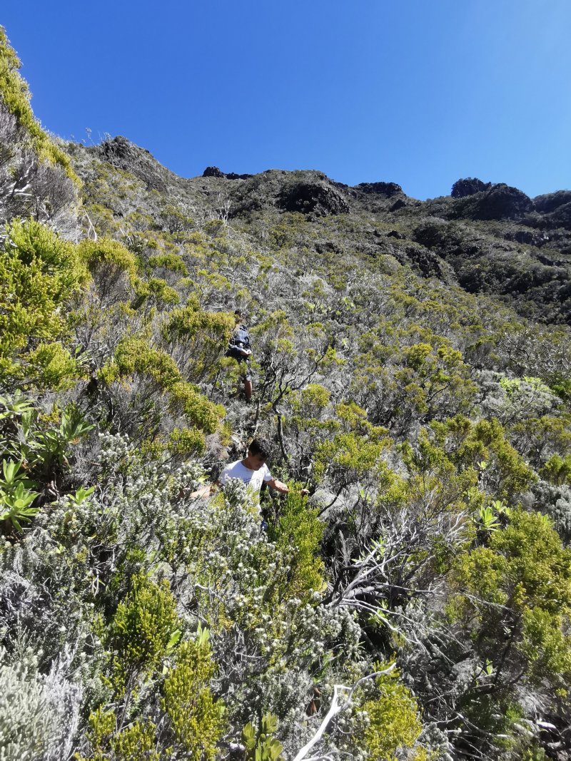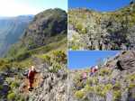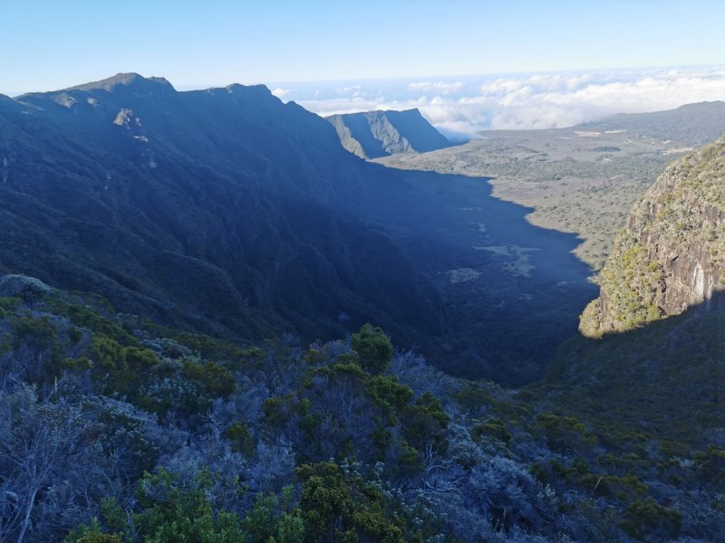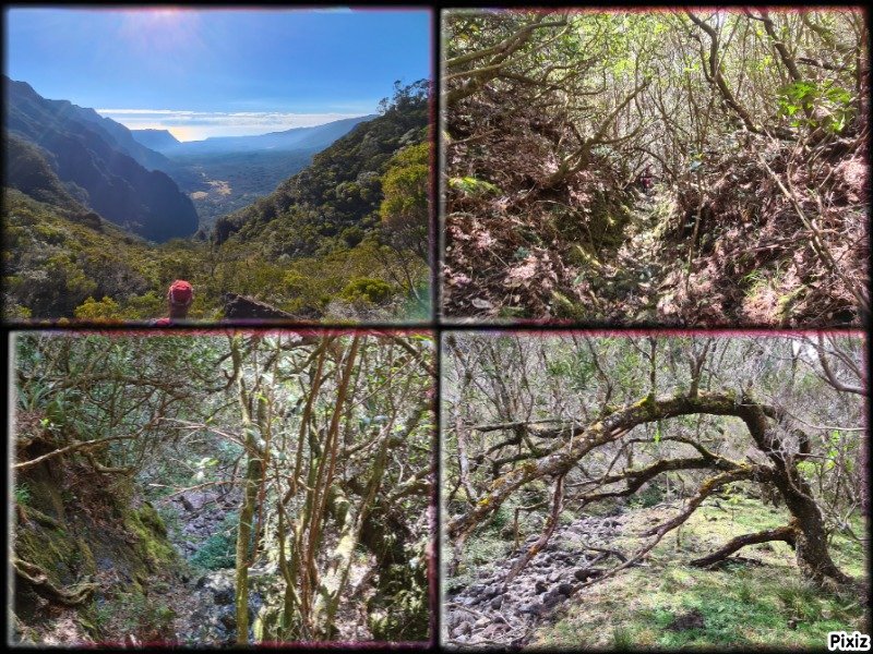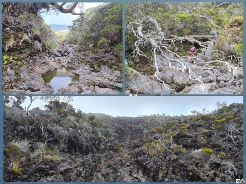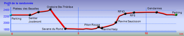 La randonnée débute au pied du Pas des Sables où quelques emplacements permettent de stationner au moment où la piste est couverte de nids de poules. Commencer la boucle en longeant le rempart en direction du Plateau des Basaltes. En hiver, le sol peut être couvert de gelée blanche et la température est alors assez basse (Photo 1). Le sable de la plaine, l'herbe et les cristaux de glace crissent sous le pied tant que le soleil n'est pas haut (Photo 2). La marche hors sentier est très agréable puisque toujours à plat. On rencontre bientôt un petit sentier longeant le rempart avant de rejoindre le GRR2 venant du gîte et partant à l'assaut du Plateau des Basaltes. La montée en plusieurs lacets s'effectue sur un large sentier, très encombré de cailloux de toutes tailles (Photo 3). La grimpette de 150 m s'effectue assez rapidement jusqu'au plateau qui se traverse en quelques minutes en direction de l'Oratoire Ste-Thérèse. Juste avant d'y parvenir, on a de nombreux points de vue sur le Fond de la Rivière de l'Est et l'on cherche des yeux le meilleur passage pour y descendre (Photo 4). Quelques mètres avant l'oratoire, une zone sableuse plus large que les autres est le point de départ de la descente. Les branles verts, ambavilles ou rares fleurs jaunes sont assez ras et le début de la descente est "presque facile" en cherchant des yeux les endroits sans végétation (Photo 5). Quelques minutes après le départ, on rencontre une vierge si cachée que peu de fidèles doivent en connaître l'existence. La désescalade comporte déjà quelques hautes marches obligeant à employer les mains pour se maintenir (Photo 6). On foule du pied des ajoncs d'Europe éradiqués par les agents de l'ONF, preuve que si des ouvriers passent, les randonneurs peuvent également se frayer un passage. La pente est raide même si elle est irrégulière, présentant parfois des pourcentages plus forts qu'ailleurs (Photo 7). Le Plateau des Basaltes, énorme en début de descente diminue de taille de minute en minute (Photo 8). La végétation grandit régulièrement et quelques arbres font leur apparition (photo 9). Lorsqu'elle dépasse la taille d'un homme et que la pente s'accentue par endroits, difficile de naviguer à l'œil. Il faut régulièrement faire le point pour éviter ou contourner les barres rocheuses bien marquées sur la cartes IGN (Photo 10). Même bien étudié, le parcours comporte cependant quelques passages acrobatiques où les mains sont de nouveau nécessaires ainsi que les arbustes pour ralentir la descente (Photo 11). Après 500 m assez sportifs et deux heures de descente, la plaine approche mais il faut encore effectuer quelques périlleuses descentes de petites ravines dont celle du Piton Rond (Photo 12). Un gros bois rouge tortueux marque la fin de la descente. Les bouses de vaches et traces de sabots indiquent que le fond est atteint pour une première pause. On se retrouve dans le lit rocailleux de la Ravine du Piton Rond et il est alors possible de partir dans n'importe quelle direction (Photo 13). Un coup d'œil à l'arrière permet de mieux comprendre à quoi ont été occupées les 170 dernières minutes (Photo 14). Le Fond de la Rivière de l'Est est une vaste zone partagée entre coulées de gratons, prairies naturelles, larges méandres de rivières coulant totalement à plat et vastes étendues de forêts de tamarins des Hauts (Photo 15). La ravine, très large par endroits, a drainé d'importantes quantités de sable venu des remparts (Photo 16). Ailleurs, la marche est une balade familiale comparée à la descente du rempart (Photo 17). Partir un peu sur la droite et prendre le Piton Rouge comme point de repère. Les brandes font leur retour et les multiples sentiers créés par le passage des bovins permettent de marcher rapidement, tout d'abord en direction du Piton de l'Îlet (Photo 18). La traversée d' importants amoncèlements de gratons qui l'entourent rendent difficile son ascension (Photo 19). Tout près, à l'inverse, la montée au Piton Rouge est facile et ludique dans un environnement de sables rougeoyants à l'origine du nom du piton (Photo 20). On a, depuis le sommet, des vues imprenables sur toute la vaste plaine, sur la Ravine Haüy qu'on va bientôt rejoindre et sur un cône éruptif ou de dégazage très esthétique (Photo 21). Le rejoindre ne prend que quelques minutes sur un sol très glissant. La bouche couverte d'éclaboussures de lave cache une cavité d'une quinzaine de mètres de profondeur sans doute visitée depuis longtemps par les spéléologues. A 30 m de là, dans le fond de la vallée, coule la Ravine Haüy qui se rejoint sans problème à travers les branles. Le fond, tout d'abord couvert de galets devient plus haut complètement nu et basaltique et bordé de magnifiques tamarins (Photo 22). Les petits cassés inévitables dans ce type de terrain se contournent aisément (Photo 23). D'autres, plus hauts ou plus déchiquetés demandent quelques petites contorsions sans danger pour les franchir (Photo 24). A partir de l'altitude de 1995 m, il est encore possible de remonter cette large ravine mais un très haut cassé est infranchissable 150 m plus loin. C'est donc par la Ravine Saucisson que se poursuit cette sortie en hors sentier depuis le Fond de la Rivière de l'Est. La Ravine Saucisson, plus étroite, plus encombrée de roches donne immédiatement le ton par une pente très forte (Photo 25). Puis les roches disparaissent, laissant la place aux basaltes lisses et très glissants, à proscrire totalement en cas de pluie. Les grottes, failles, cavités ou curiosités géologiques se multiplient mais la pente ne faiblit toujours pas (Photo 26). C'est même l'inverse qui se produit avec des tronçons aux pourcentages impressionnants où les quatre pattes sont indispensables au cheminement (Photo 27). A 2200 m, la pente s'assagit, le lit retrouve les cailloux, les flaques et un sol sculpté par l'érosion. On parvient rapidement