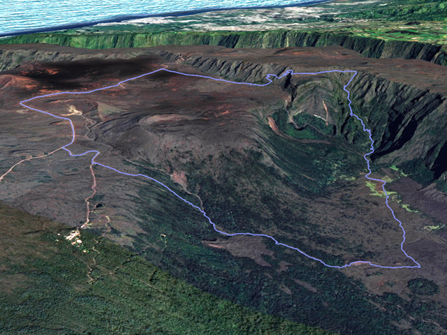 Se rendre à Bourg Murat et prendre la direction du volcan - Rouler jusqu'au Pas des Sables puis descendre les lacets jusqu'au premier parking - Filer tout droit en hors sentier jusqu'au GRR2 et entamer la montée vers le Piton des Basaltes - Poursuivre jusqu'à l'Oratoire Ste-Thérèse - Débuter la descente à partir de la zone sableuse située avant l'oratoire - Rejoindre sportivement la Ravine du Piton Rond et la Savane du Rond - La traverser jusqu'au Piton de l'Îlet et au Piton Rouge - Rejoindre le petit cratère en rive gauche de la Ravine Haüy et entamer ensuite la remontée de cette ravine basaltique - Bifurquer à gauche au confluent de la Ravine Saucisson puis remonter toute la ravine jusqu'à la route du gîte - Partir à droite, rejoindre le parking en suivant la route, le GRR2 ou poursuivre en hors sentier entre les deux.