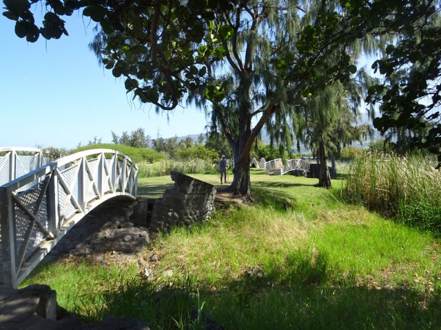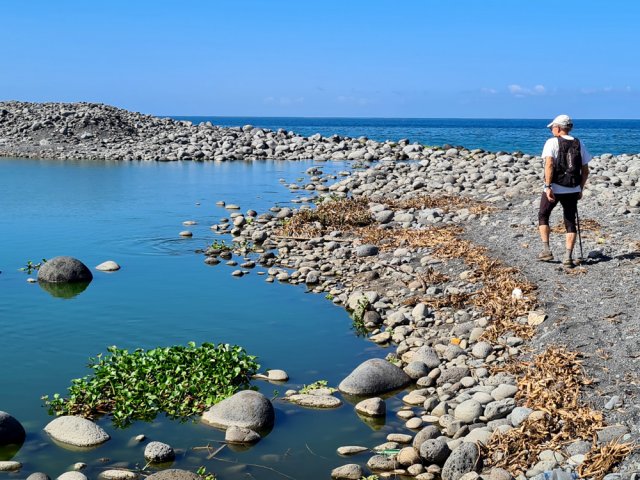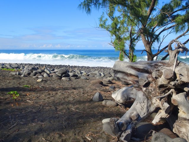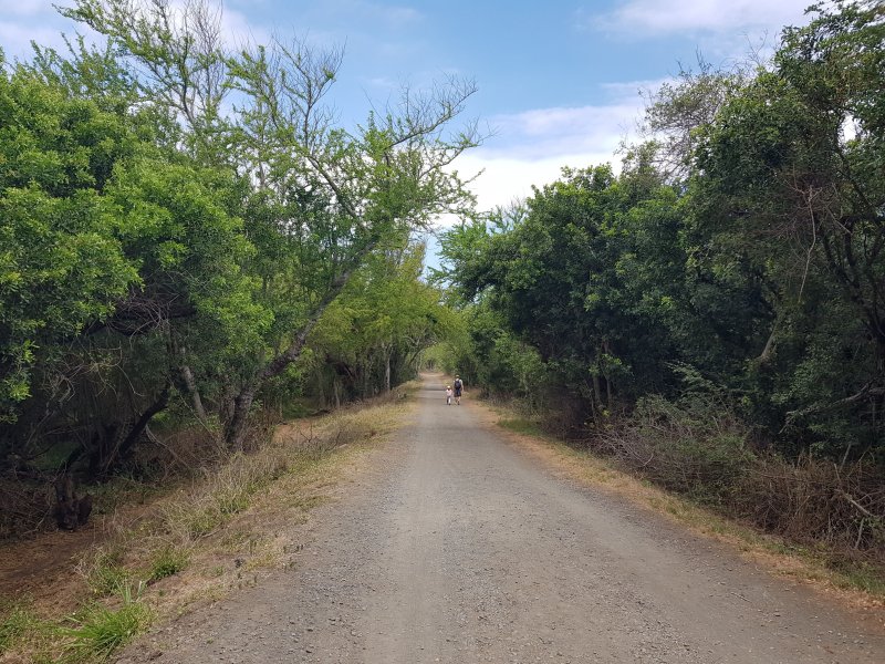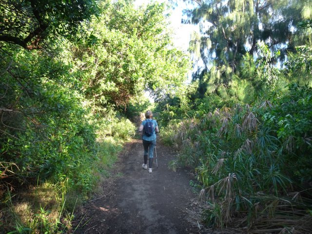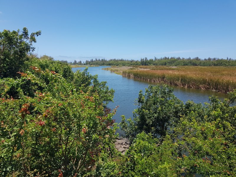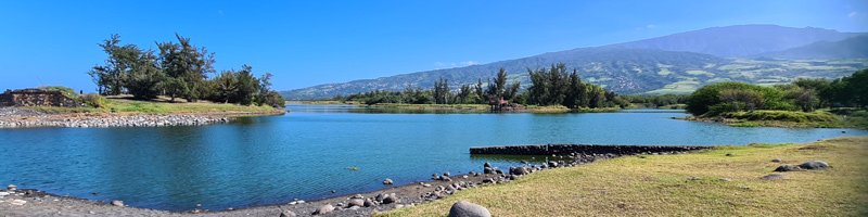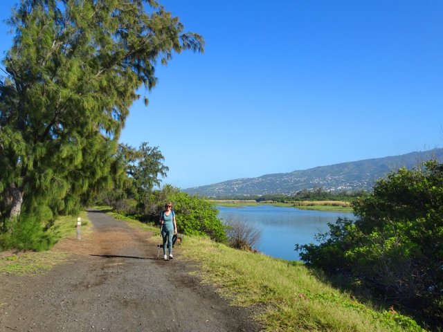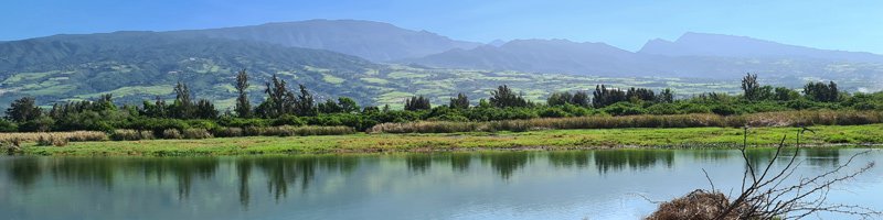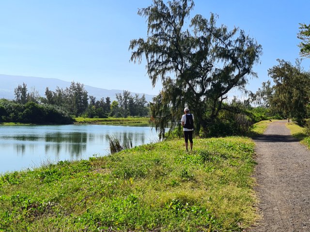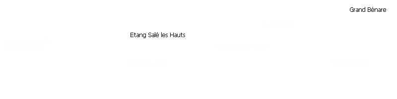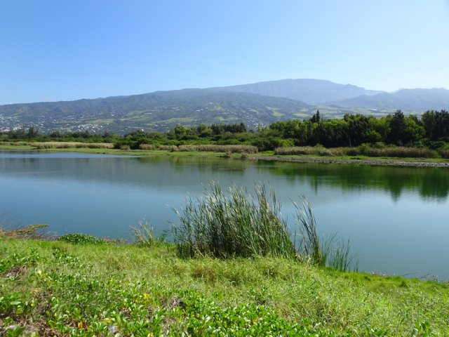 La randonnée débute au nouveau parking aménagé près de la bretelle menant à l'usine du Gol en venant du nord. Un peu de lecture avant de partir permet de se familiariser avec la vue des trois étangs et de repérer d'autres circuits (Photo 1). La première partie de cette boucle n'est pas la plus agréable par la piste sableuse et caillouteuse qui longe la très bruyante route nationale (Photo 2). Il est possible, au début, de s'approcher des berges très connues de pêcheurs qui, hélas, laissent sur place leurs déchets (Photo 3). Poursuivre sur cette piste bordée plus loin de prairies. Une concentration de tisserins a élu domicile dans cette zone qui fournit assez de graines pour nourrir les centaines d'individus bruyants et toujours affairés. Prendre un moment, surtout avec des enfants, pour étudier leur vie grégaire, leur habitat et leur technique très élaborée de couture (Photo 4). Tourner à gauche vers une ferme puis repérer, juste au prochain virage vers la droite, le sentier pénétrant dans les sous-bois. Ce large sentier ombragé, se rapproche des gravières (Photo 5). Prendre à droite au premier croisement et suivre le nouveau sentier bordé de bancs sommaires et d'emplacements pour la pêche. Repartir à droite au nouveau croisement puis poursuivre entre poivriers, papyrus et filaos (Photo 6). On longe quelques ouvrages pour l'assèchement de la zone et l'on devine même l'étang du Gol sur la gauche. Le sentier devient de plus en plus large le long de ces canaux (Photo 7). La végétation très touffue a été taillée pour en faire des tunnels facilitant le passage (Photo 8). La fréquence des passages de sportifs devrait permettre de conserver ces tunnels (Photo 9). On parvient rapidement à une tour d'observation constituée d'un escalier en colimaçon protégé par une belle armature en bois exotique (Photo 10). Quelques marches mènent à un pallier d'observation de l'étang et de la faune habitant les berges et de la typhaieZone couverte de typha, ces roseaux (ou massettes) reconnaissables aux longues quenouilles de la fleur et aux interminables feuilles. occupant une grande partie des marécages de la région. On peut aussi se rapprocher de la berge au pied de la tour pour tenter de voir de plus près les nombreuses poules d'eau (Photo 11). Poursuivre en direction de la passerelle en passant un nouveau tunnel sous les porchers (Photo 12). Après un virage à gauche, on s'approche de la Ravine Maniron désormais enjambée par un pont métallique également habillé de bois (Photo 13). On bénéficie là aussi d'ouvertures pour l'observation du paysage et de la faune (Photo 14). Poursuivre dans la plaine qui suit. Elle est envahie d'herbe mais une belle trace permet de marcher sans difficulté (Photo 15). On se dirige vers le bois de poivriers et tamarins occupant les queues de l'étang tout en contournant les bassins de la pisciculture qui ne se voit pas (Photo 16). Traverser ce bois ombragé. On parvient à la piste venant de l'Etang Salé. Préférer le sentier qui serpente entre la piste et l'étang (Photo 17). Le sol est parfois un peu sableux mais les pieds ne s'enfoncent pas (Photo 18). A la fin du sentier, continuer le tour par la piste qu'on retrouve à travers les filaos (Photo 19). La piste passe à quelques mètres des berges et il est souvent possible de s'en approcher, ne serait-ce que pour observer les poules d'eau se reposant au milieu de l'étang (Photo 20). Continuer ainsi jusqu'à la fin de l'étang (Photo 21). Plus loin, l'espace entre l'étang ou l'océan sont identiques. Il est donc possible de s'approcher de la plage de galets ou siègent quelques cairns (Photo 22) et de vieilles racines de filaos (Photo 23). Contourner les piles ruinées du pont de chemin de fer et se diriger vers le gué de la Ravine du Gol. Ce passage, qui s'effectue sur des galets, comporte peu de difficultés par beau temps (Photo 24). Par forte houle, prendre garde car les vagues viennent se briser sur les galets, rendant la traversée dangereuse. Plus haut, traverser le parking puis poursuivre vers les passerelles qu'on aperçoit tout près. Franchir ces ouvrages sans difficulté (Photo 25). Se diriger ensuite vers le coin ouest du terrain de sport (Photo 26). Continuer sur un sentier facile à repérer en face du coin du stade. Le sentier traverse des sous-bois, des friches et des jardins (Photo 27) avant de se poursuivre sur un chemin longeant des établissements de la zone artisanale. En arrivant à la Rue Vely, prendre à gauche et rejoindre le gué sur la Ravine du Gol qui se passe facilement la plupart du temps (Photo 28). Remonter le sentier en rive gauche et partir à droite pour rejoindre le parking.