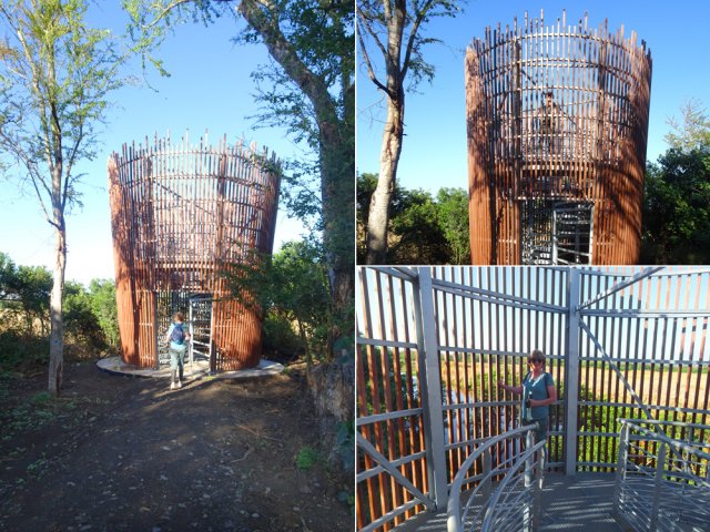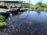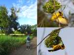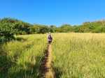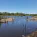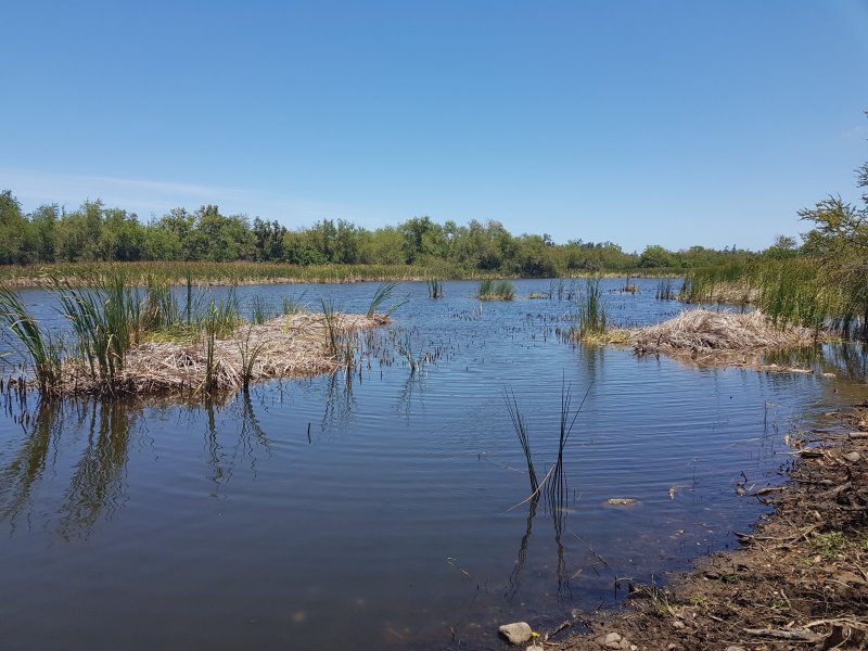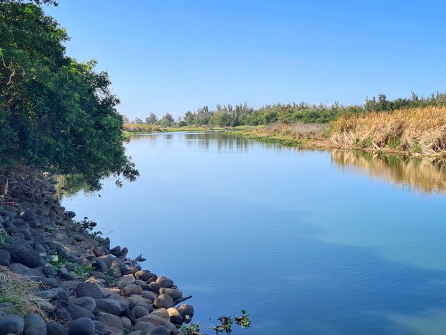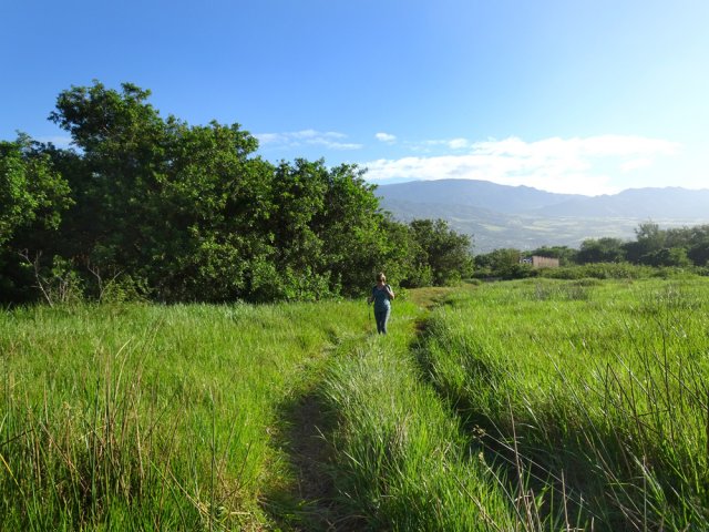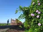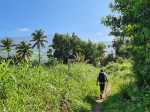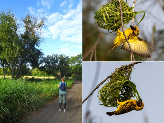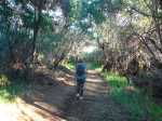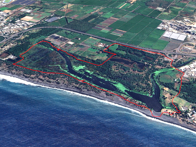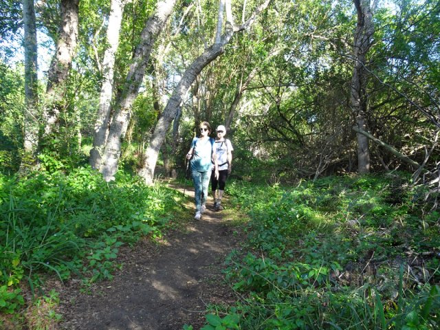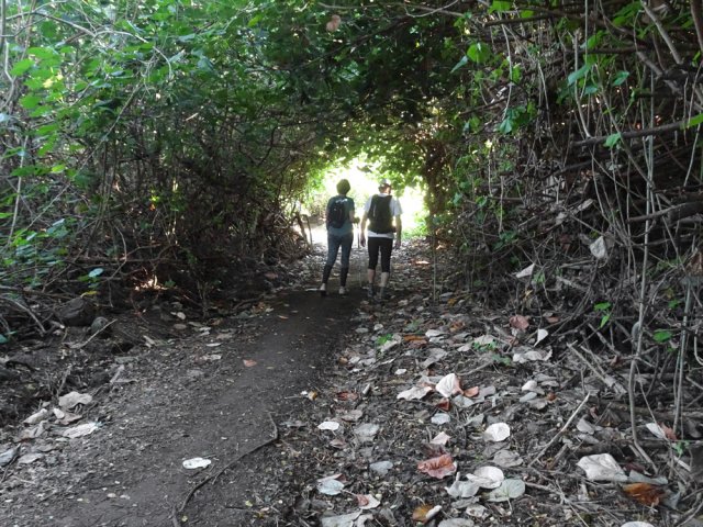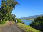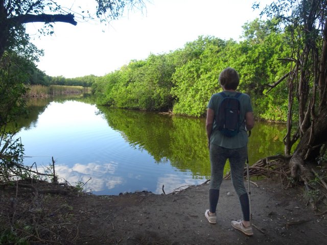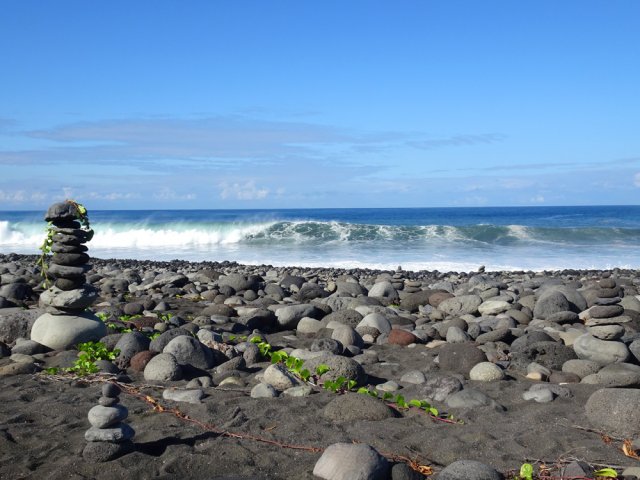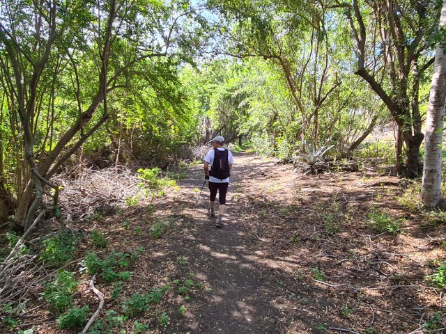 La randonnée débute au nouveau parking aménagé près de la bretelle menant à l'usine du Gol en venant du nord. Un peu de lecture avant de partir permet de se familiariser avec la vue des trois étangs et de repérer d'autres circuits (Photo 1). La première partie de cette boucle n'est pas la plus agréable par la piste sableuse et caillouteuse qui longe la très bruyante route nationale (Photo 2). Il est possible, au début, de s'approcher des berges très connues de pêcheurs qui, hélas, laissent sur place leurs déchets (Photo 3). Poursuivre sur cette piste bordée plus loin de prairies. Une concentration de tisserins a élu domicile dans cette zone qui fournit assez de graines pour nourrir les centaines d'individus bruyants et toujours affairés. Prendre un moment, surtout avec des enfants, pour étudier leur vie grégaire, leur habitat et leur technique très élaborée de couture (Photo 4). Tourner à gauche vers une ferme puis repérer, juste au prochain virage vers la droite, le sentier pénétrant dans les sous-bois. Ce large sentier ombragé, se rapproche des gravières (Photo 5). Prendre à droite au premier croisement et suivre le nouveau sentier bordé de bancs sommaires et d'emplacements pour la pêche. Repartir à droite au nouveau croisement puis poursuivre entre poivriers, papyrus et filaos (Photo 6). On longe quelques ouvrages pour l'assèchement de la zone et l'on devine même l'étang du Gol sur la gauche. Le sentier devient de plus en plus large le long de ces canaux (Photo 7). La végétation très touffue a été taillée pour en faire des tunnels facilitant le passage (Photo 8). La fréquence des passages de sportifs devrait permettre de conserver ces tunnels (Photo 9). On parvient rapidement à une tour d'observation constituée d'un escalier en colimaçon protégé par une belle armature en bois exotique (Photo 10). Quelques marches mènent à un pallier d'observation de l'étang et de la faune habitant les berges et de la typhaieZone couverte de typha, ces roseaux (ou massettes) reconnaissables aux longues quenouilles de la fleur et aux interminables feuilles. occupant une grande partie des marécages de la région. On peut aussi se rapprocher de la berge au pied de la tour pour tenter de voir de plus près les nombreuses poules d'eau (Photo 11). Poursuivre en direction de la passerelle en passant un nouveau tunnel sous les porchers (Photo 12). Après un virage à gauche, on s'approche de la Ravine Maniron désormais enjambée par un pont métallique également habillé de bois (Photo 13). On bénéficie là aussi d'ouvertures pour l'observation du paysage et de la faune (Photo 14). Poursuivre dans la plaine qui suit. Elle est envahie d'herbe mais une belle trace permet de marcher sans difficulté (Photo 15). On se dirige vers le bois de poivriers et tamarins occupant les queues de l'étang tout en contournant les bassins de la pisciculture qui ne se voit pas (Photo 16). Traverser ce bois ombragé. On parvient à la piste venant de l'Etang Salé. Préférer le sentier qui serpente entre la piste et l'étang (Photo 17). Le sol est parfois un peu sableux mais les pieds ne s'enfoncent pas (Photo 18). A la fin du sentier, continuer le tour par la piste qu'on retrouve à travers les filaos (Photo 19). La piste passe à quelques mètres des berges et il est souvent possible de s'en approcher, ne serait-ce que pour observer les poules d'eau se reposant au milieu de l'étang (Photo 20). Continuer ainsi jusqu'à la fin de l'étang (Photo 21). Plus loin, l'espace entre l'étang ou l'océan sont identiques. Il est donc possible de s'approcher de la plage de galets ou siègent quelques cairns (Photo 22) et de vieilles racines de filaos (Photo 23). Contourner les piles ruinées du pont de chemin de fer et se diriger vers le gué de la Ravine du Gol. Ce passage, qui s'effectue sur des galets, comporte peu de difficultés par beau temps (Photo 24). Par forte houle, prendre garde car les vagues viennent se briser sur les galets, rendant la traversée dangereuse. Plus haut, traverser le parking puis poursuivre vers les passerelles qu'on aperçoit tout près. Franchir ces ouvrages sans difficulté (Photo 25). Se diriger ensuite vers le coin ouest du terrain de sport (Photo 26). Continuer sur un sentier facile à repérer en face du coin du stade. Le sentier traverse des sous-bois, des friches et des jardins (Photo 27) avant de se poursuivre sur un chemin longeant des établissements de la zone artisanale. En arrivant à la Rue Vely, prendre à gauche et rejoindre le gué sur la Ravine du Gol qui se passe facilement la plupart du temps (Photo 28). Remonter le sentier en rive gauche et partir à droite pour rejoindre le parking.