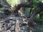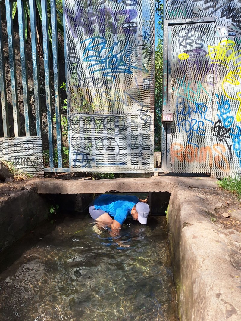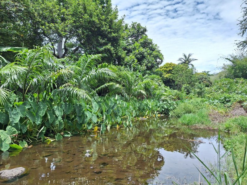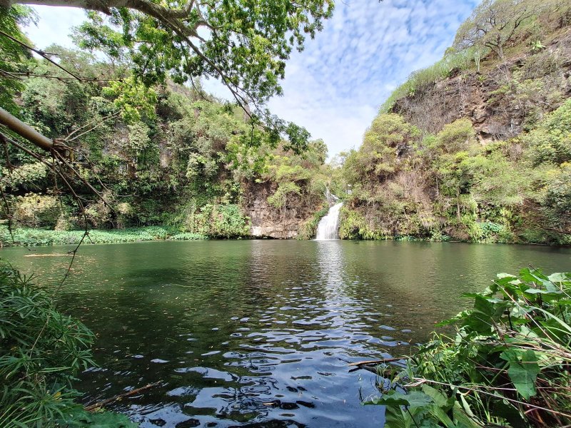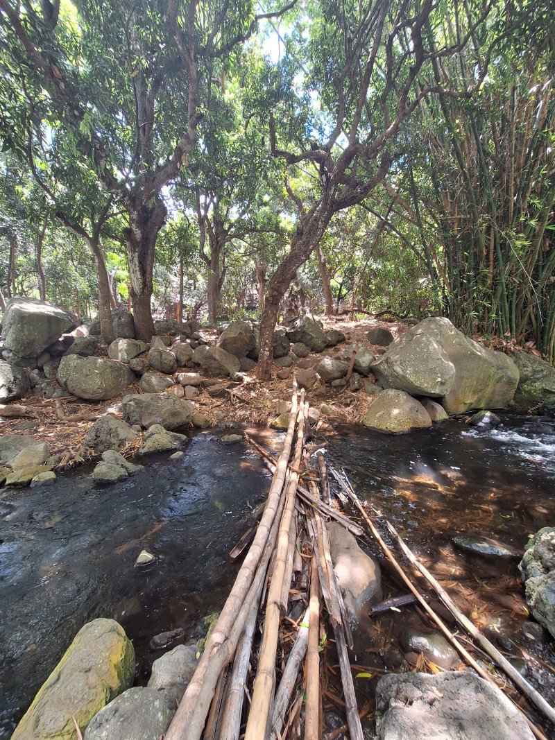 La Ravine de Saint-Gilles propose, à deux pas de la ville, des bassins très connus interdits au public. Les visiteurs s'y précipitent par dizaines, non pour braver les arrêtés mais pour profiter des baignades dans les eaux limpides des bassins. Ils ont même du mal à trouver des emplacements de stationnement le long de la route du théâtre. Cette boucle passe au plus près des cascades et lieux de baignade mais en stationnant 6500 m plus bas, au lieu-dit Œil de Bœuf. Cette longue boucle éclectique permet de longer le lagon, traverser la ville de Saint-Gilles, remonter le sentier des Caméléons et propose une portion aventureuse par une remontée sportive de la rivière à partir du Jardin Bottard. Elle se poursuit par une traversée des savanes herbeuses bordant la Route des Tamarins en tentant de passer là où aucun itinéraire n'est proposé sur le site, afin de varier les découvertes. Parmi ces nouveautés, on peut citer la vigne de l' (H)ermitage qui deviendra peut-être un jour un cru aussi connu que les vins de Cilaos. La partie aventure le long de la ravine Saint-Gilles était au programme de cette nouvelle fiche et a été indirectement encouragée par deux personnes rencontrés en chemin. En leur demandant si la ravine était poissonneuse et si des pêcheurs s'y aventuraient, les demi-sourires échangés entre eux ont suffi à nous décider à tenter cette escapade inédite. Cette courte portion s'adresse tout de même aux randonneurs habitués aux remontées aléatoires de cours d'eau et qui n'hésiteront pas à ramper sous les lianes papillon ou sauter des roches dépassant le mètre de hauteur. Il faudra seulement garder à l'esprit qu'on ne quitte jamais la rive gauche quels que soient le relief, les obstacles et la végétation à traverser. L'arrivée au Bassin Cormoran par la rive gauche vaut à elle seule cet effort de 30 minutes pour 400 m à crapahuter comme des jeunes !