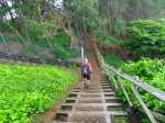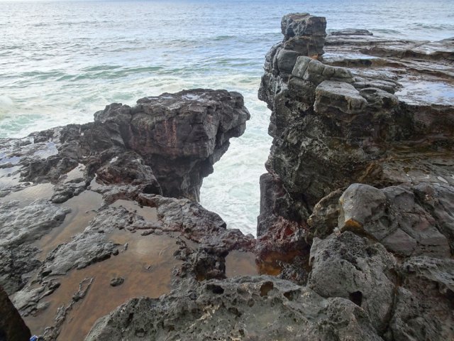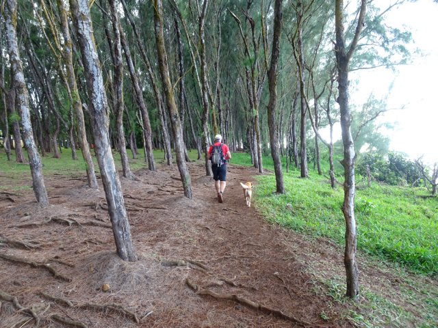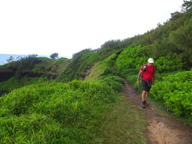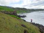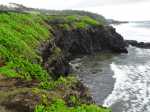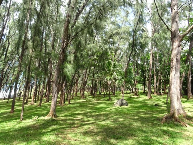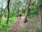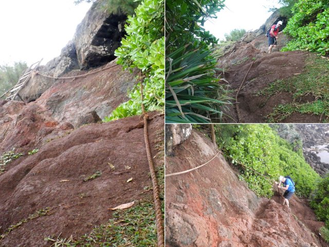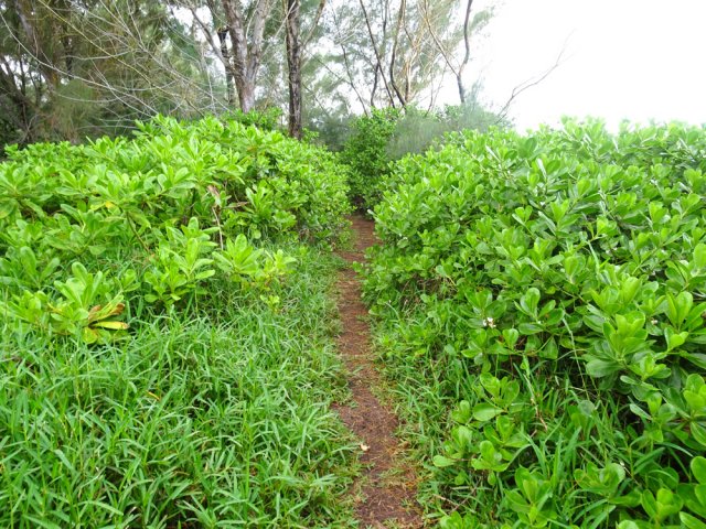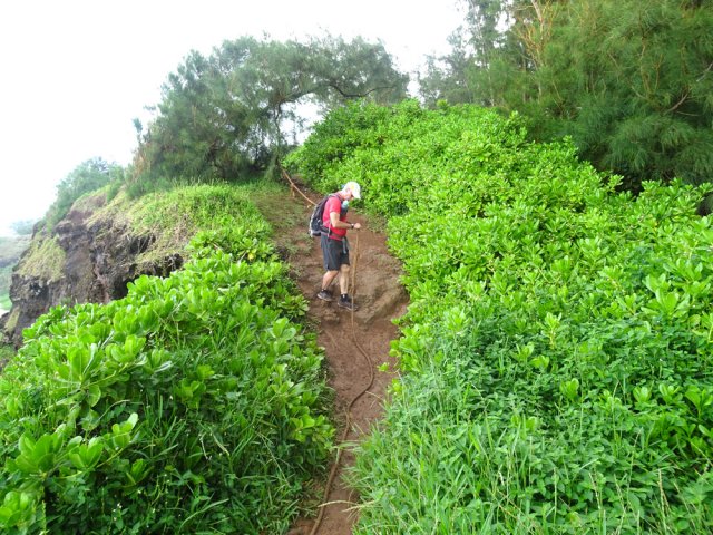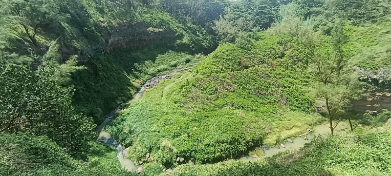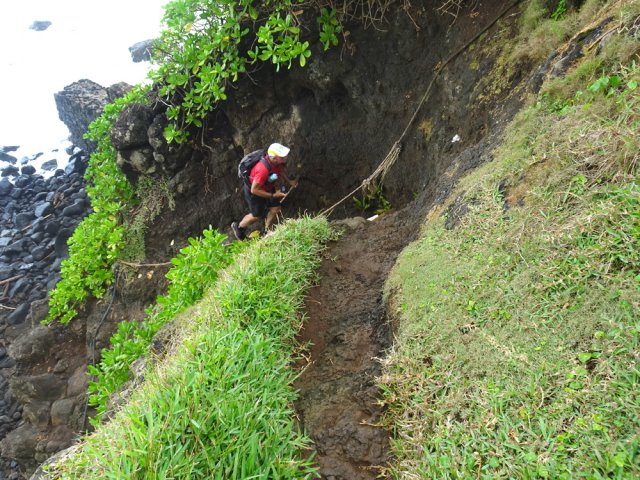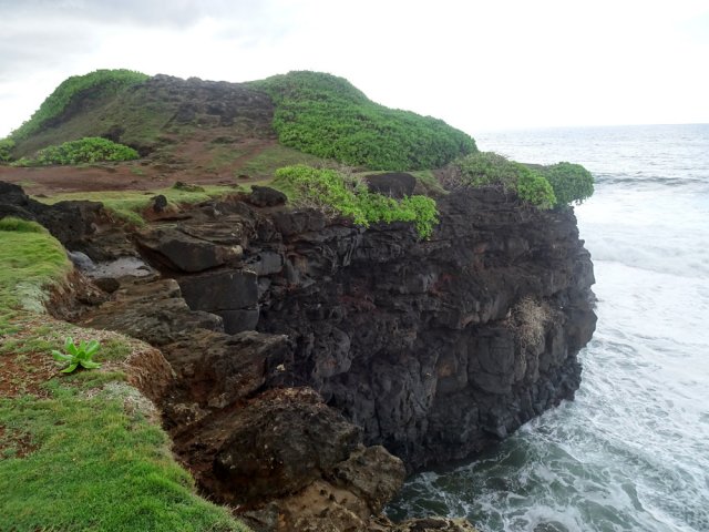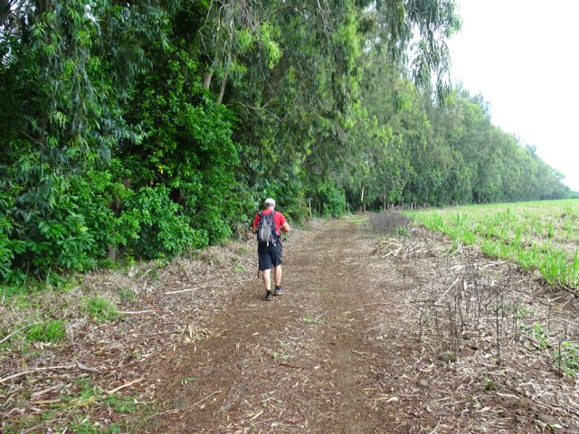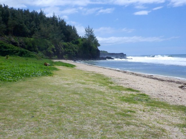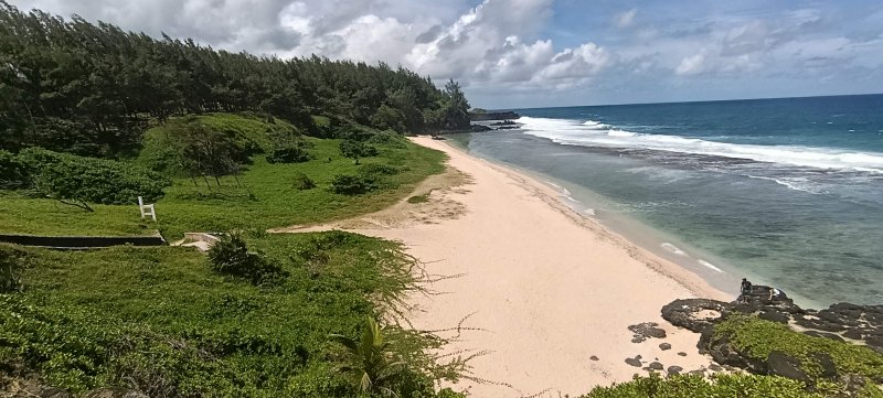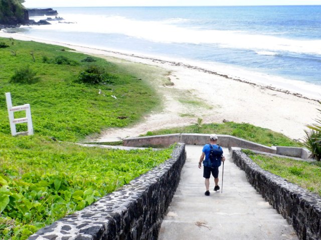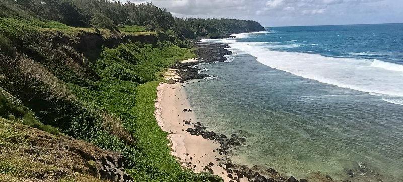 La randonnée débute à l'aire engazonnée bordant la falaise qui domine la plage de Gris-Gris. Elle comporte un kiosque de pique-nique. En passant devant les toilettes publiques, on peut rejoindre la côte et s'approcher de la falaise pour y repérer une grotte importante dans laquelle s'engouffrent les vagues (Photo 1). Suivre le muret construit en bordure et profiter de la vue sur la plage. Un peu plus loin, un escalier passe près d'un panneau avertissant sur le danger de se baigner (Photo 2). L'échauffement peut débuter sur la plage par une balade au plus près des vagues (Photo 3). Remonter et trouver un peu plus haut un autre escalier qui mène à un bois de filaos (Photo 4). Partir sur la droite et longer la plage qu'on domine de quelques mètres. Les chiens, nombreux comme sur toute l'île, viennent glaner un peu de nourriture et peuvent accompagner le marcheur, certainement avec l'espoir d'être nourris (Photo 5). Les filaos, plantés au cordeau, donnent un peu d'ombre. On parvient assez vite à une avancée rocheuse dans la mer. La Roche qui Pleure, un cap classique des côtes sauvages, attire les curieux venus voir l'eau couler des roches copieusement arrosées par les fortes vagues. La roche est nue, seulement couverte d'herbe rase et de quelques maniocs marrons (Photo 6). Partout, des sentiers permettent de rejoindre la pointe et ses petits bassins dans lesquels courent les crabes (Photo 7). Ne pas trop s'approcher des failles si les vagues s'y engouffrent (Photo 8). Faire demi-tour puis rejoindre le sentier en profitant de belles vues sur la côte rocheuse et les vagues (Photo 9). Les petites plages rencontrées en contrebas ne peuvent s'atteindre que de manière acrobatique (Photo 10). Le sentier qui borde la falaise, bordé de hautes herbes et de manioc marron, est toujours de bonne qualité (Photo 11). Un autre, sous les filaos sera emprunté au retour pour créer une boucle. Après une descente glissante secourue d'une longue corde salie de terre rouge on se rapproche du précipice (Photo 12). On aperçoit le haut d'une courte échelle en bois. Entamer la descente très glissante en s'aidant de nouvelles cordes (Photo 13). Le sol est glissant, la terre lisse et la pente forte. Passer quelques roches puis entamer la remontée de la plage en visant la petite cascade qu'on aperçoit au fond (Photo 14). Il faut se mouiller un peu les pieds ou sauter de roche en roche pour franchir la Rivière Bain de Négresses avant de parvenir au pied de la cascade. Elle tombe de la falaise et arrose un bassin avant de terminer dans la mer. Repérer, en rive droite, la nouvelle échelle et les cordes qui permettront de remonter vers le sentier de bord (Photo 15). La pente est comme la précédente et les cordes assez délabrées (Photo 16). Poursuivre vers l'est et franchir une nouvelle petite rivière fermée par un barrage de récupération de l'eau (Photo 17). Le sentier remonte en lacets avant de redevenir plat. Un peu plus loin, la deuxième cascade ne mérite pas une chute mortelle pour gagner le pied n'ayant même pas de bassin (Photo 18). Reprendre le sentier, qui, moins fréquenté, a tendance parfois à s'envahir de manioc ou trainasse (Photo 19). Il se transforme ensuite en piste qui passe près du haut des falaises (Photo 20). Un panneau indique le Parc aux Cerfs. Des poteaux sans grillage sont en place comme si un jour des cervidés avaient pu y être enfermés. La falaise est très haute et le spectacle des vagues mérite une halte pour y repérer de nouvelles roches qui pleurent (Photo 21). Une aire engazonnée sert de lieu de rassemblement pour fêtes ou repas. Poursuivre sur la piste nommée "Balade des Falaises" au moins jusqu'à l'hôtel et ses bungalows situés à la fin de la piste. Faire demi-tour pour rejoindre la Rivière Bain des Négresses en empruntant le même itinéraire ou, comme ici, en effectuant un écart pour se rapprocher des champs de canne (Photo 22). Rejoindre le sentier puis traverser la digue de la retenue d'eau. Ne pas repartir à gauche à l'approche de la rivière mais prendre à droite à l'embranchement. Traverser près de 100 m assez humides ou boueux et se laisser guider par le bruit de la Cascade Mamzelle. Une fois sur la berge, on peut déjà l'apercevoir et se rendre au pied en effectuant la descente rocheuse facile à trouver dans le seul endroit sans falaise (Photo 23). Une petite cascade coule sur la gauche. Remonter le lit sur une courte distance pour atteindre le bassin trop dangereux pour la baignade (Photo 24). Remonter le ravin puis la rivière en rive gauche jusqu'au gué. Franchir le gué bordé de grands arbres parfois biscornus (Photo 25). Depuis les arbres, profiter une dernière fois de la chute avant de poursuivre (Photo 26). Quitter le lieu sur un sentier très glissant, puis reprendre le cheminement sous les filaos en délaissant le sentier littoral emprunté à l'aller afin de varier les paysages (Photo 27). Les sentiers sont nombreux et mènent tous au point de départ. Terminer en traversant le bois de filaos sur une agréable trace herbeuse (Photo 28).