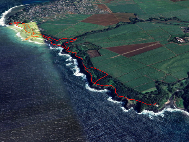 Se rendre à Souillac dans l'extrême Sud de l'île - Rejoindre le bord de mer par la Black River Savane Coast Road et stationner au parking à la fin de la rue - Visiter l'aire de repos puis la côte rocheuse avant de descendre ou non en direction de la plage - Emprunter l'escalier longeant le grillage et rejoindre le bois de filaos - Poursuivre au plus près des falaises jusqu'à la Roche qui Pleure - Continuer sur le sentier littoral en s'approchant des deux premières cascades puis rejoindre l'hôtel situé avant la prochaine rivière - Faire demi-tour et varier l'itinéraire en s'approchant des champs de canne à sucre puis revenir près du littoral - Avant la Rivière Bain des Négresses, partir à droite et traverser une zone humide menant à la dernière cascade - Descendre ou non au pied de la chute puis franchir le gué proche de la cascade - Reprendre le sentier et terminer par le même itinéraire ou, comme ici, en restant plus souvent sur les sentiers dans les terres.