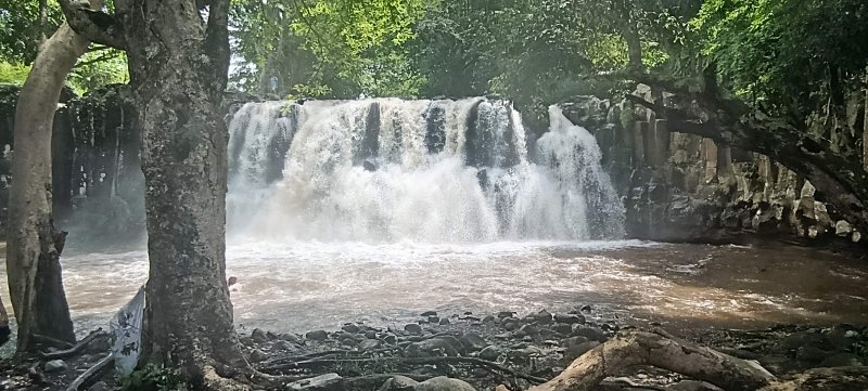 La randonnée débute à la première piste rencontrée à la fin de Rambert Street. Stationner aux alentours de la pancarte sommaire indiquant la direction de la cascade (Photo 1). La piste caillouteuse longe quelques habitations avant d'effectuer deux virages pour franchir un petit affluent de la Rivière Savanne. On débute les lacets dans les filaos où les premiers panneaux confirment la bonne direction (Photo 2). On les termine sous les flamboyants entièrement rouges au mois de décembre (Photo 3). Très vite, la première piste à gauche pénètre dans d'immenses champs de canne totalement plats (Photo 4). Elle est empierrée et fréquentée plus par les minibus et taxis que par les moissonneuses de canne (Photo 5). Suivre les panneaux et parvenir rapidement aux abords de la rivière qu'on a du mal à distinguer dans sa vallée recouverte de haute végétation. La piste, constituée de terre rougeoyate, commence à descendre vers la rivière (Photo 6). Les ravinements et les éboulis en ont emporté une grande partie, créant d'importantes ornières (Photo 7). Le passage est tout de même possible sur le côté un peu glissant (Photo 8). Plus bas, la piste est remplacée par un sentier très humide où les hautes herbes se sont installées (Photo 9). Un dernier virage à gauche et l'arrivée à la cascade s'effectue sur des pierres plates isolant du marécage (Photo 10). Le fracas de la cascade se fait entendre alors qu'elle est encore cachée par les hautes roches (Photo 11). On peut s'approcher du bassin en marchant sur la plage de galets (Photo 13). Les orgues basaltiques verticales attirent autant l'œil que la chute elle-même pour un spectacle garanti (Photo 14). Des arbres poussant en bordure de rivière sont restés en place tandis que le lit s'élargissait crue après crue (Photo 15). Les fruits au sol comportant 5 ailettes désignent le carambole marron ou arjanda des Indes (Terminalia arjuna). On les retrouve souvent sur le bord des routes mauriciennes où ils font penser à nos platanes. Près des rivières, ils développent des racines impressionnantes. Pour atteindre le haut de la cascade, on doit emprunter le sentier que l'on aperçoit en face. Il faut donc se déchausser ou mouiller les pieds pour effectuer la traversée (Photo 16). La rivière file vers l'océan en torrent assez facile à traverser (Photo 17). Le sentier, court mais raide, finit à la piste également très empruntée par les taxis pour déposer des touristes (Photo 18). On rejoint facilement le haut de la chute occupé par un énorme carambole marron. Étudier au passage la façon qu'il a d'envelopper les galets par ses racines pour les emprisonner (Photo 19). Du haut des rochers, on a une vue générale sur le bassin, la cascade et les orgues (Photo 20). Avant de repartir par le même chemin, ne pas hésiter à marcher sur les rives pour remonter la rivière à la rechercher de nouvelles racines (Photo 22). Reprendre le chemin inverse puis traverser à nouveau la rivière (Photo 25). Après la piste défoncée, il est possible de longer la rivière pour varier un peu l'itinéraire sans pour autant avoir la possibilité d'y descendre (Photo 26). Après le coude de la piste et de la rivière, traverser les cannes par une nouvelle piste et terminer par le même chemin.