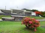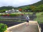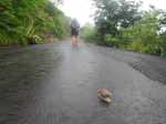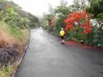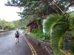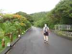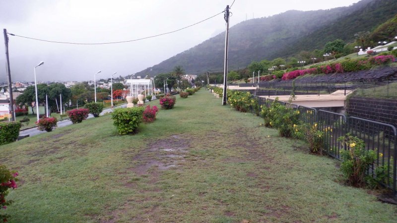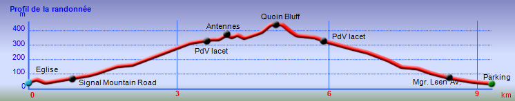 La randonnée débute sur Monseigneur Leen Avenue, sur le parking situé au début de Gaité Street. Partir vers le sud-est et repérer sur la droite l'immense parc fleuri abritant le monument Marie Reine de la Paix (Photo 1). Des escaliers, ponts, sentiers, chemins ou esplanades permettent de marcher en direction de la statue de la Vierge érigée sur le toit de l'édifice (Photo 2). L'œuvre en marbre de Carrare, haute de 3m et pesant 4 tonnes n'a pas bougé depuis le 15 août 1940, jour où elle fut érigée pour protéger la population durant la Seconde Guerre Mondiale (Photo 3). Suivre les allées pour continuer en direction de la route des Signaux pour entamer le Signal Mountain Health Track. Bifurquer légèrement à droite au panneau annonçant le début du parcours sportif (Photo 4). Passer la chaîne, l'abri du gardien et entamer la montée sur le goudron (Photo 5). La pente, tout d'abord faible, permet de chauffer un peu les muscles des sportifs pratiquant le parcours en courant (Photo 6). Les abords de la route sont couverts d'une végétation assez touffue ponctuée de flamboyants (Photo 7). Les points de vue sont donc assez rares. On croise les cyclistes, coureurs, marcheurs de tous types (Photo 8). De petits panneaux indiquent la distance parcourue (Photo 9). Ces distances ont plus d'importance pour les coureurs qui ont souvent le chrono à la main ! Plus on monte et plus les points de vue apparaissent, principalement dans le dernier virage. On peut ainsi voir toute la capitale d'un côté (Photo 11) et le port de l'autre (Photo 12). On parvient très vite à la fin de la route. Une autre, étroite, bétonnée et en forte pente repart sur la droite en direction des antennes (Photo 13). Un escalier sur la gauche permet de contourner ces installations de retransmission (Photo 14). Dans la descente de cet escalier, profiter de nouveaux panoramas sur Pointe aux Sables, Plaine Lauzun et l'estuaire de Grand River North West et St-Louis River (Photo 15). La descente prend fin à un bâtiment supportant de nouvelles antennes (Photo 16). Cependant, une trace discrète mène à la vigie, des roches dominant la capitale permettant à l'époque de signaler l'arrivée et le départ des bateaux (Photo 17). Par beau temps, on peut rester ici à observer la ville. Lorsque le brouillard ou la pluie fine est de la partie, entamer la descente de la petite route bétonnée et viser les prochaines antennes (Photo 18). Une piste bétonnée avec marches remonte la pente bordée de nouvelles et nombreuses antennes. La pente est raisonnable pour une marche rapide. Très vite, le béton laisse place à la terre envahie d'herbe et de roches (Photo 19). Plusieurs destinations sont possibles. Ne pas prendre le sentier de droite à la première barre rocheuse. Celui de gauche longe le rocher sans danger (Photo 20). Plus on grimpe et plus le sommet est dénudé et chaotique (Photo 21). A plus de 400 m d'altitude, on a sous les yeux la totalité de la capitale (Photo 22). En arrivant à la verticale du pic (Photo 23), il est préférable de revenir un jour ensoleillé pour tenter de poursuivre vers Snail Rock mais, hélas, le sentier, peu fréquenté, est de plus en plus difficile à suivre. Trouver le meilleur passage dans les roches et descendre en direction de la piste, facile à repérer en regardant la ville (Photo 24). Suivre cette piste vers les dernières antennes par un cheminement aisé (Photo 25). Une fois à la route, repartir à droite puis effectuer le chemin inverse jusqu'à Marie Reine de la Paix et au parking.